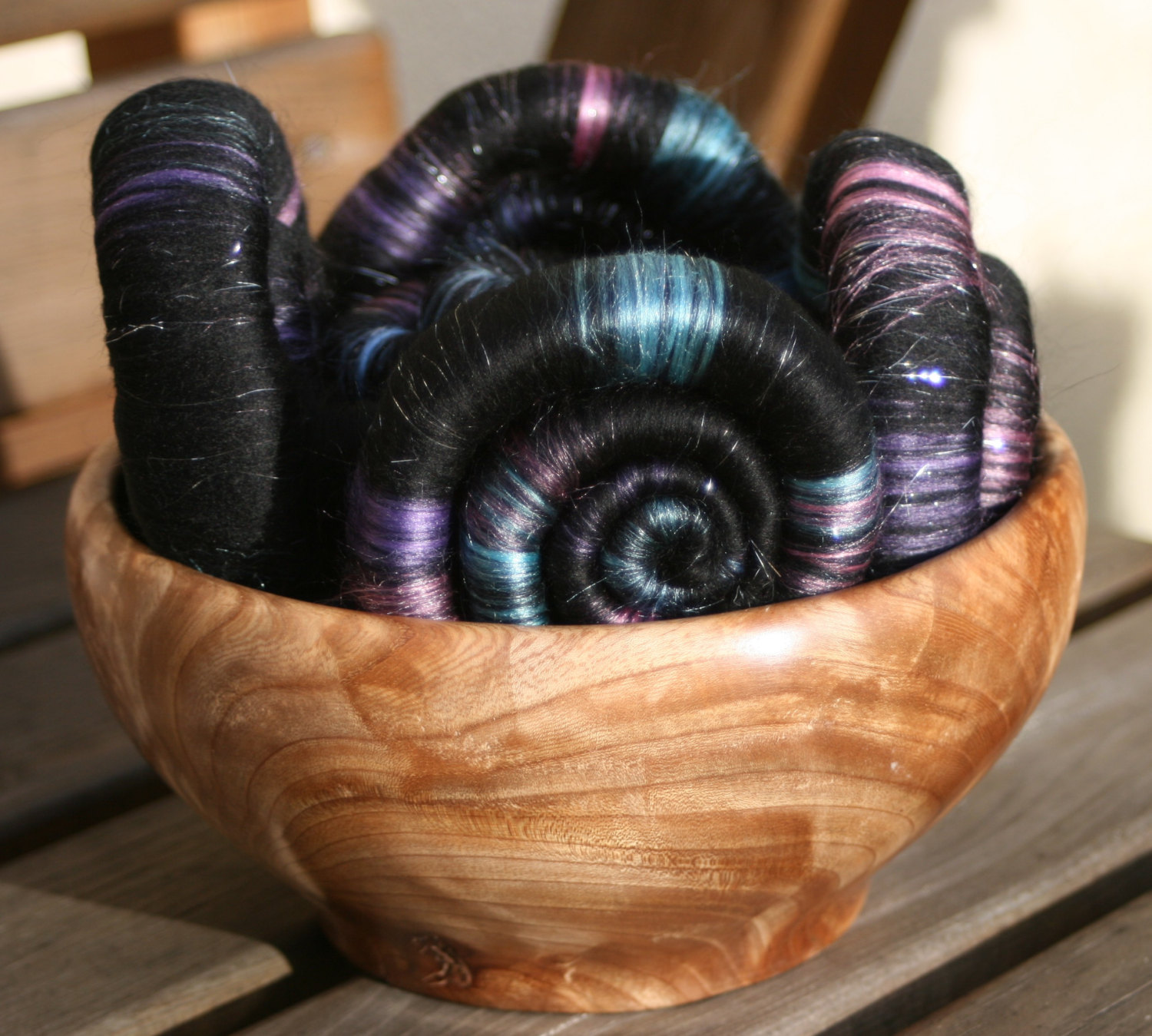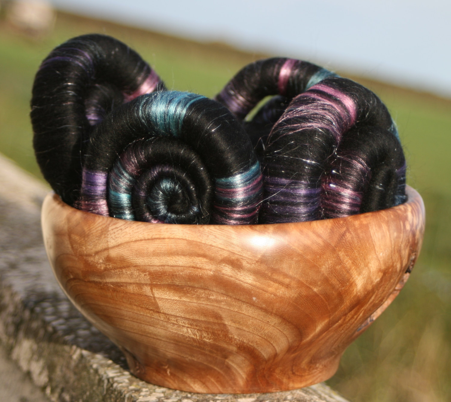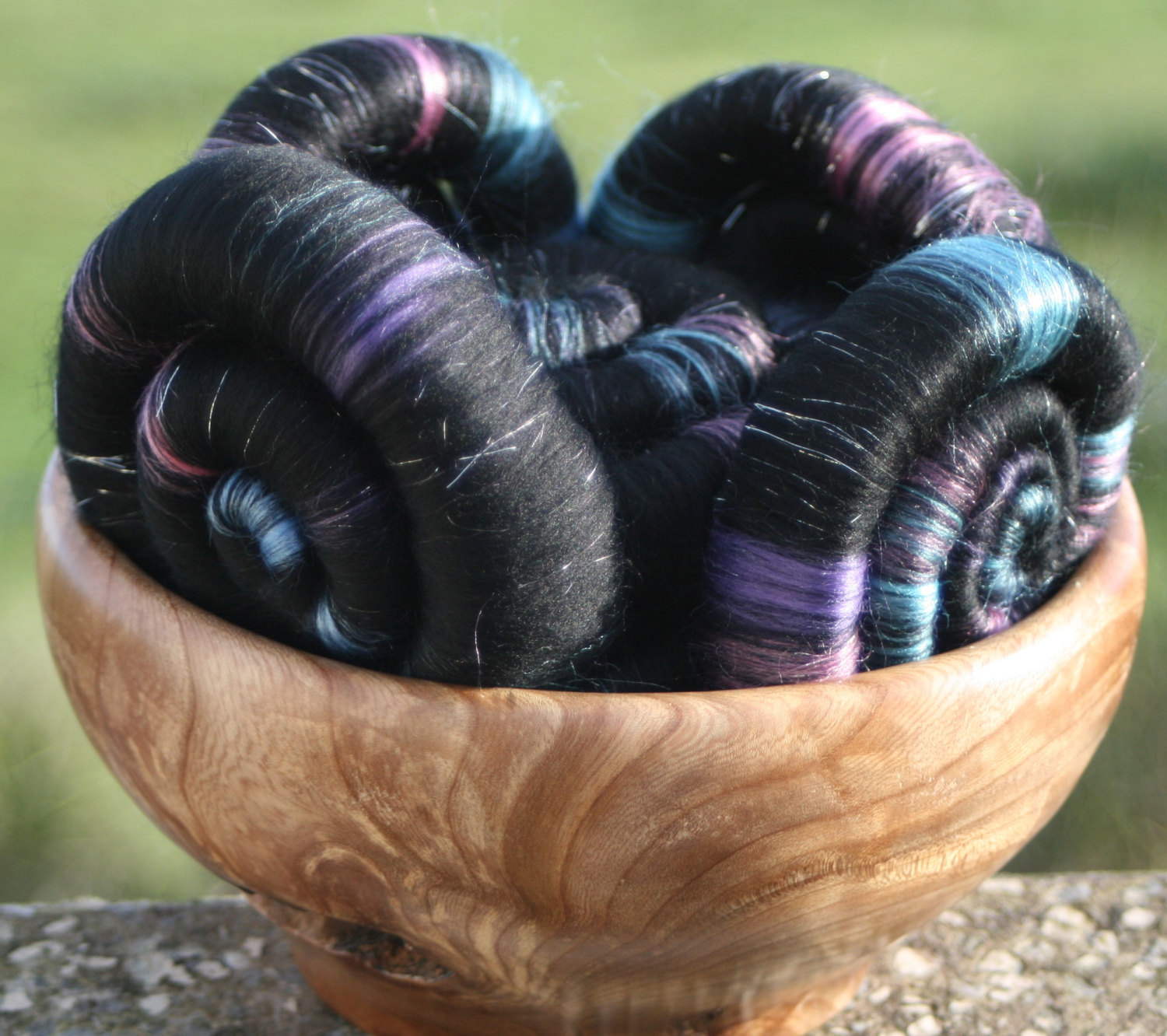 These rolags are made from soft 21 micron black merino fibres blended with plenty tussah silk in shades of blue, turquoise, pink and purple, with plenty silver Angelina to represent the stars.