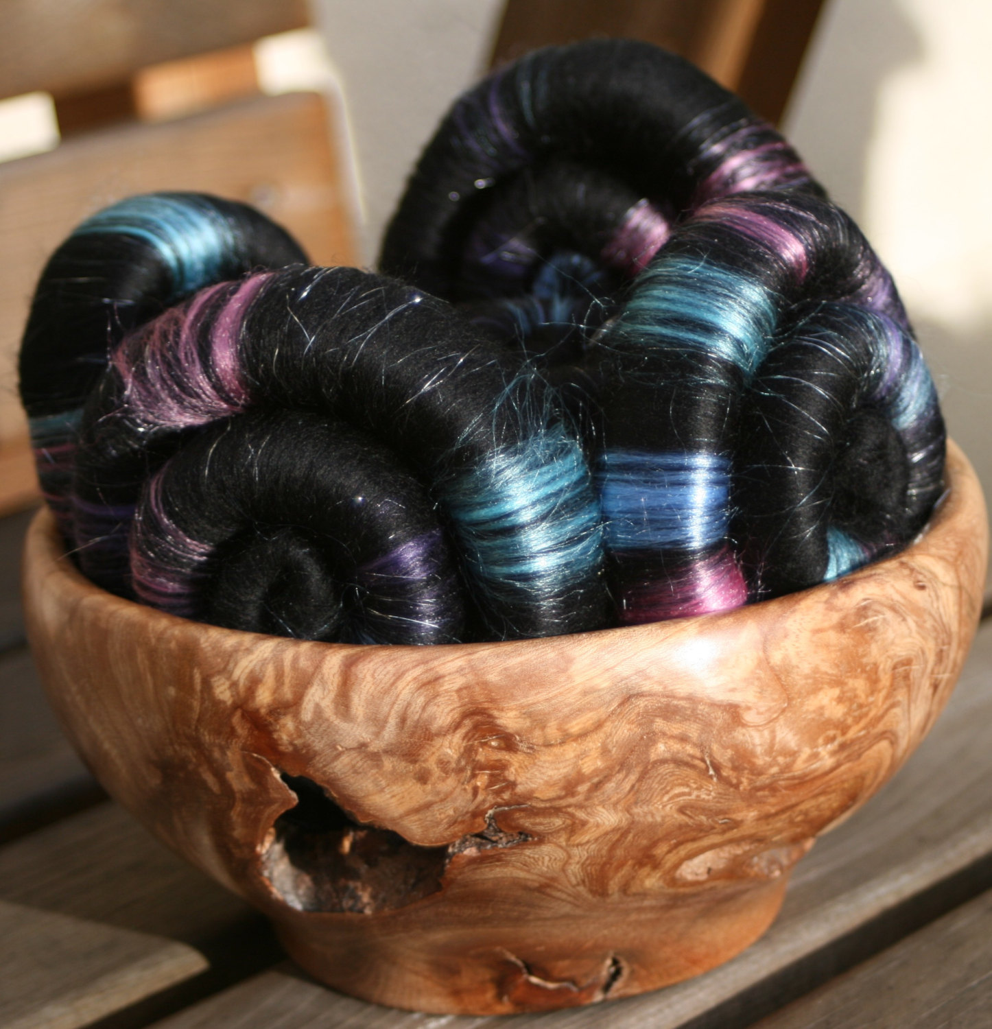 These rolags are straight forward to spin up into a smooth, next to the skin soft yarn, which will be black, studded with areas of bright silk.