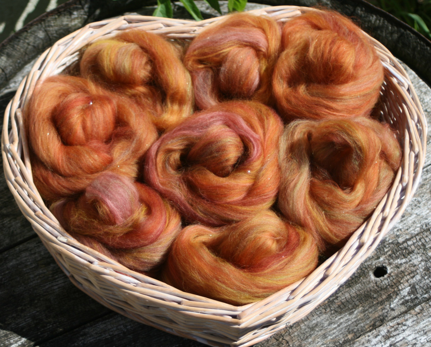 These rovings are made of merino and Shetland fibres in shades of gold and russet blended with tussah silk in shades of green and then just a sprinkling of Angelina.