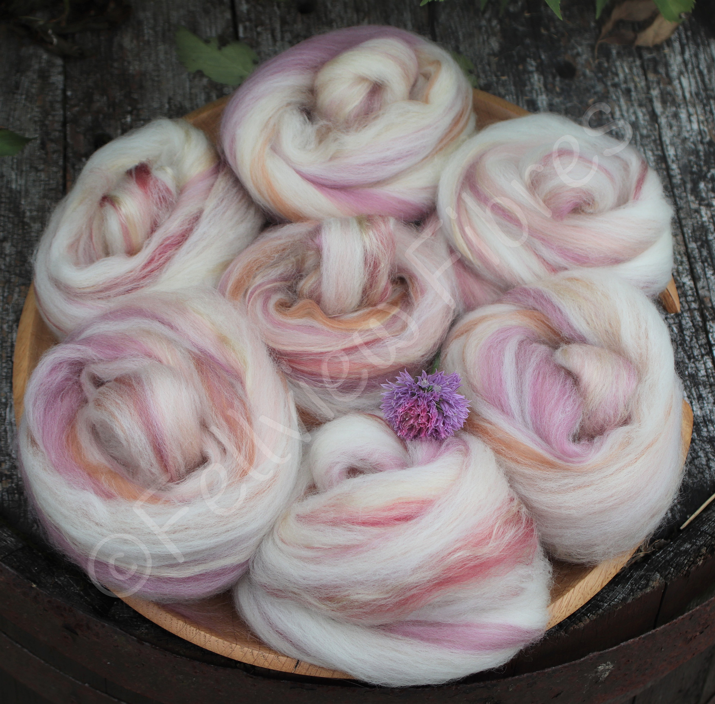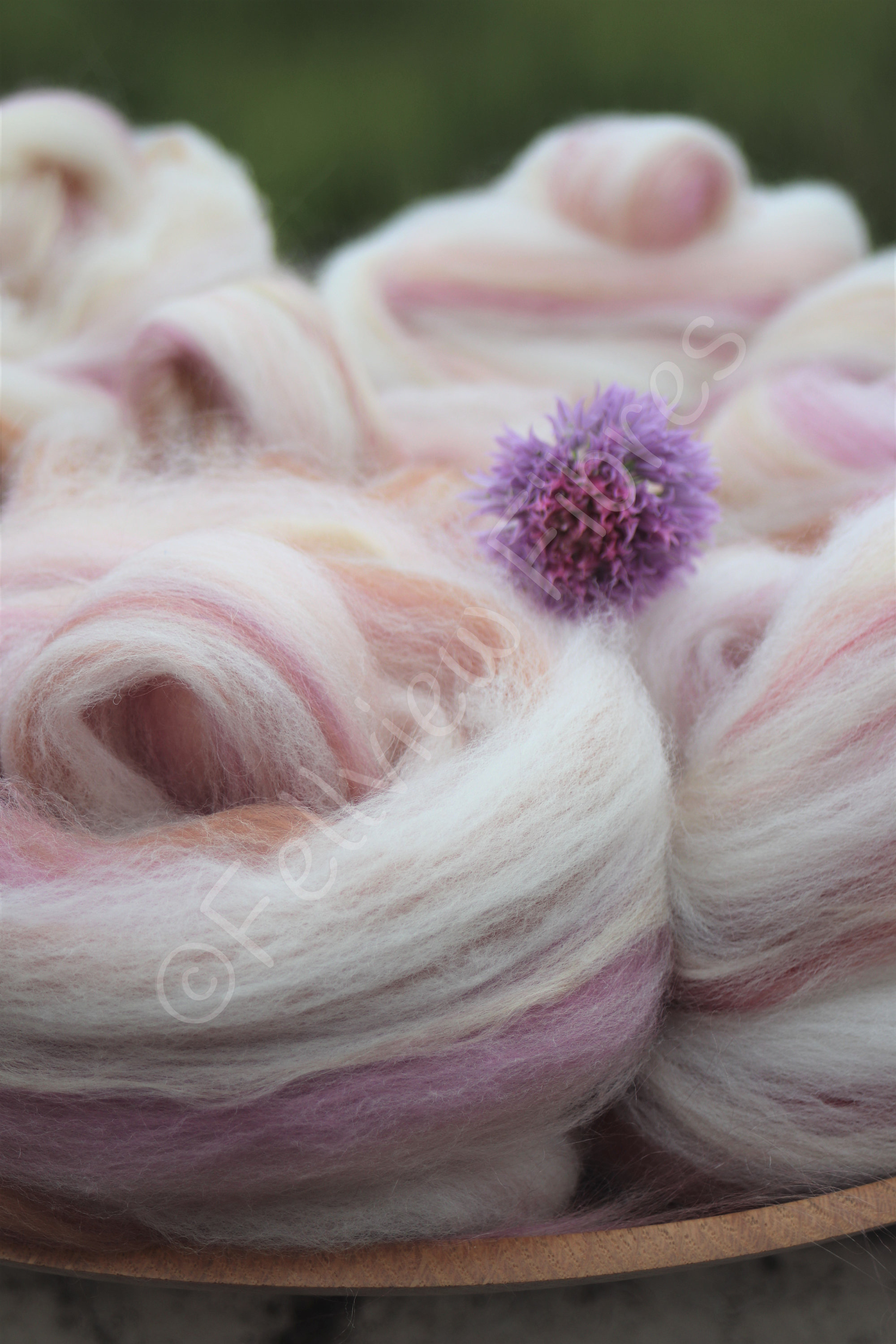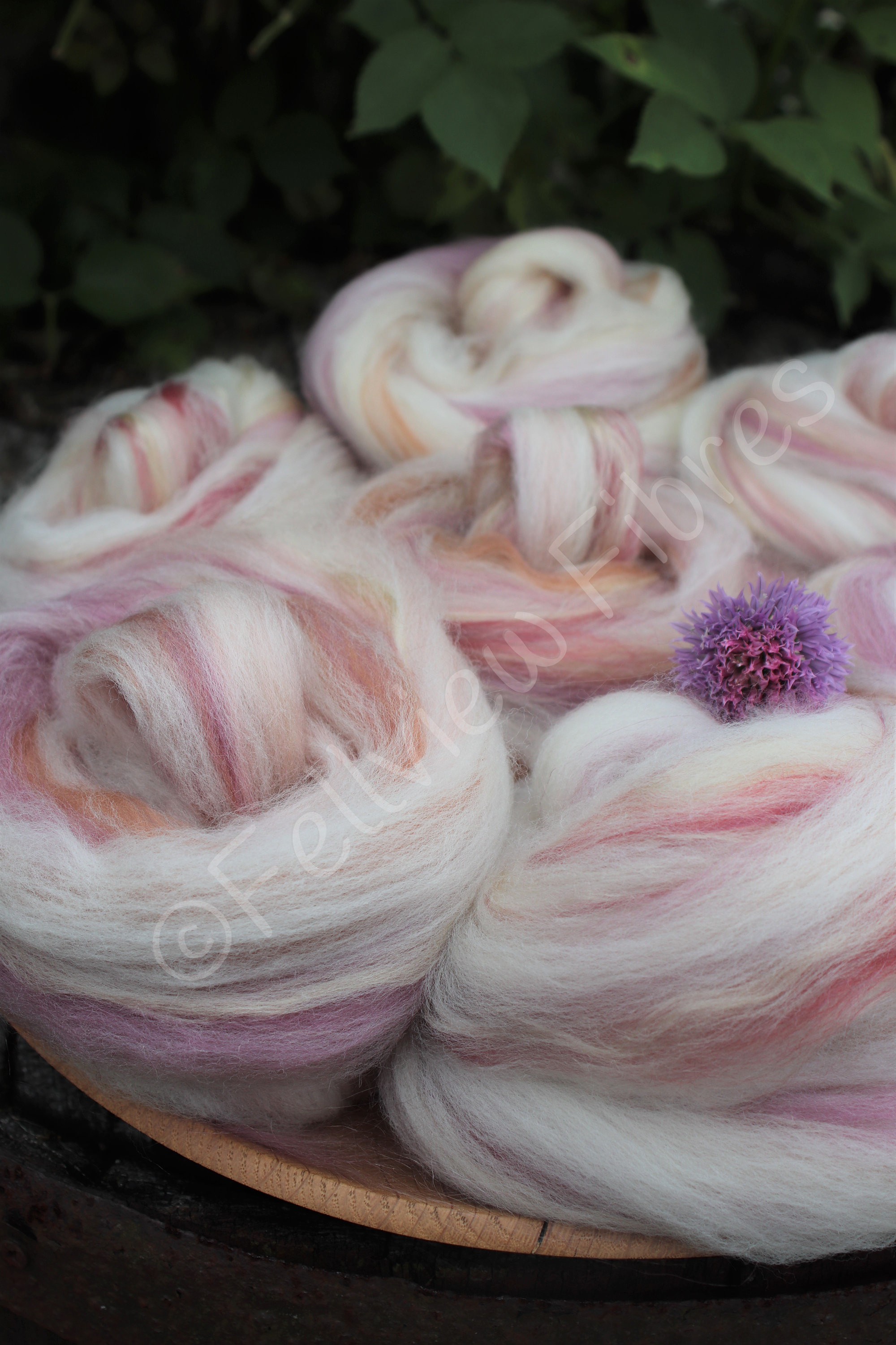 You will recieve just over 100g of hand pulled roving nests in the Avec colourway. The Rambouillet fibres and merino fibres will felt. If you do not wish them to, hand wash in cool water.