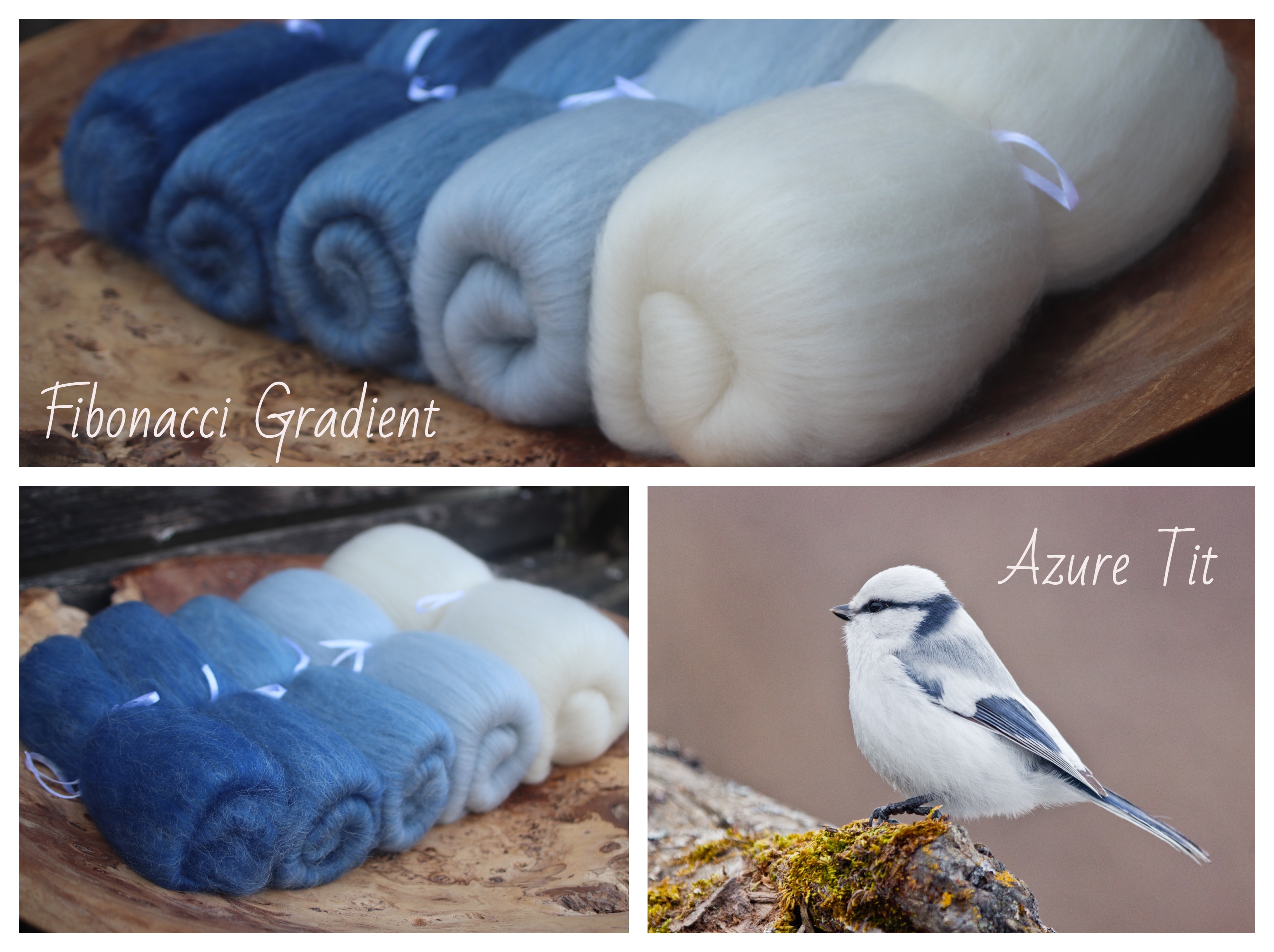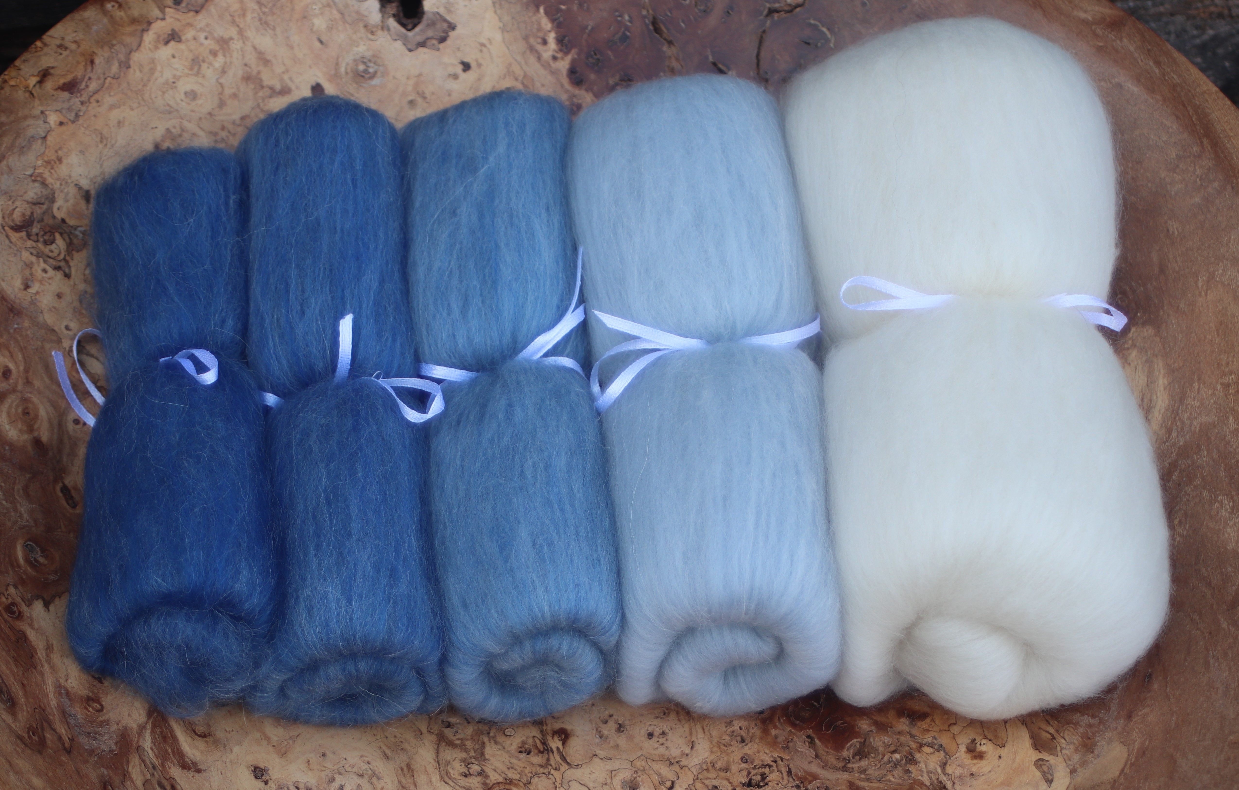 The darkest shade of blue is an 8g batt. As the shades become paler, the batts become larger. The sizes are 8g, 13g, 21g , 34g and finally 55g (pure white)