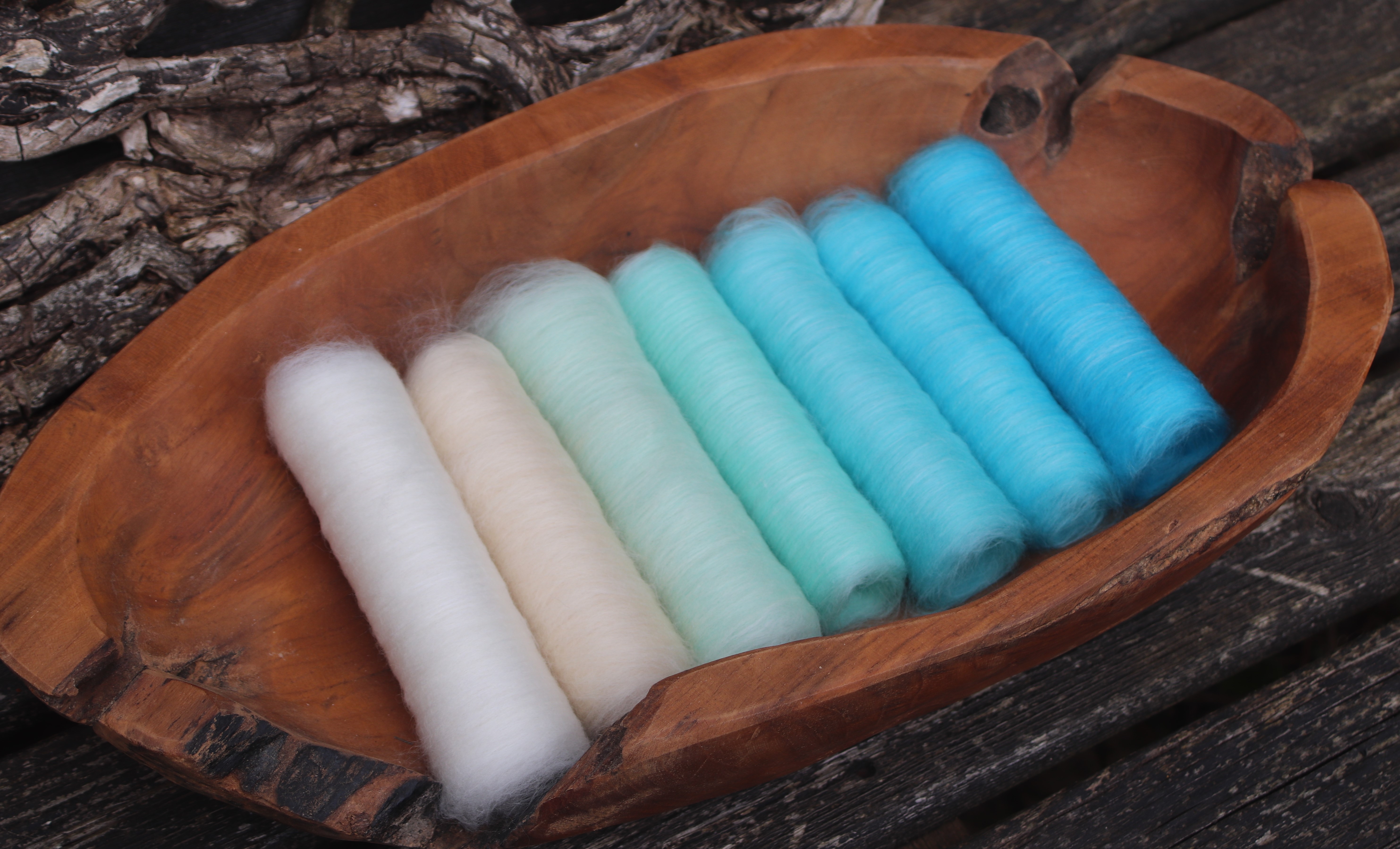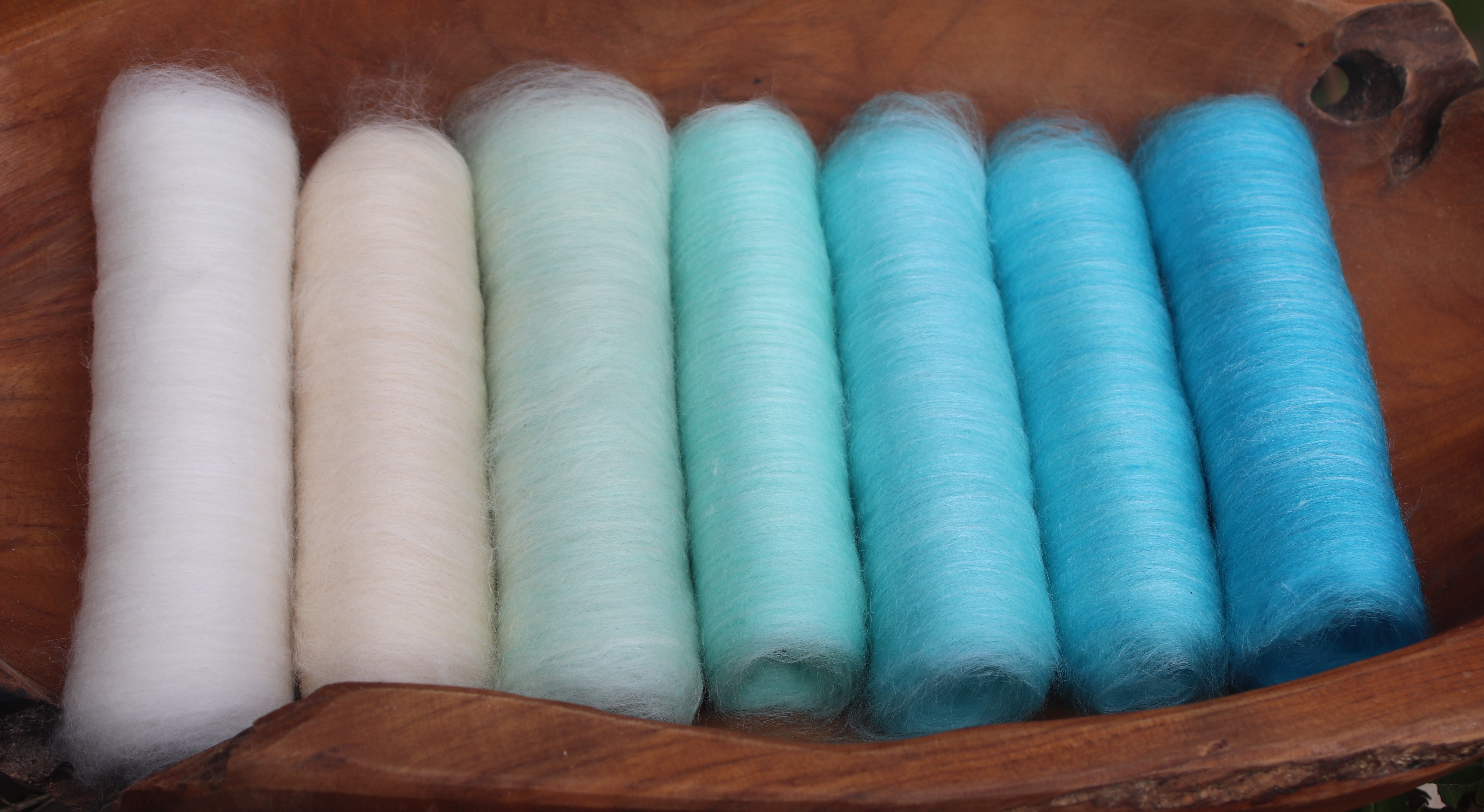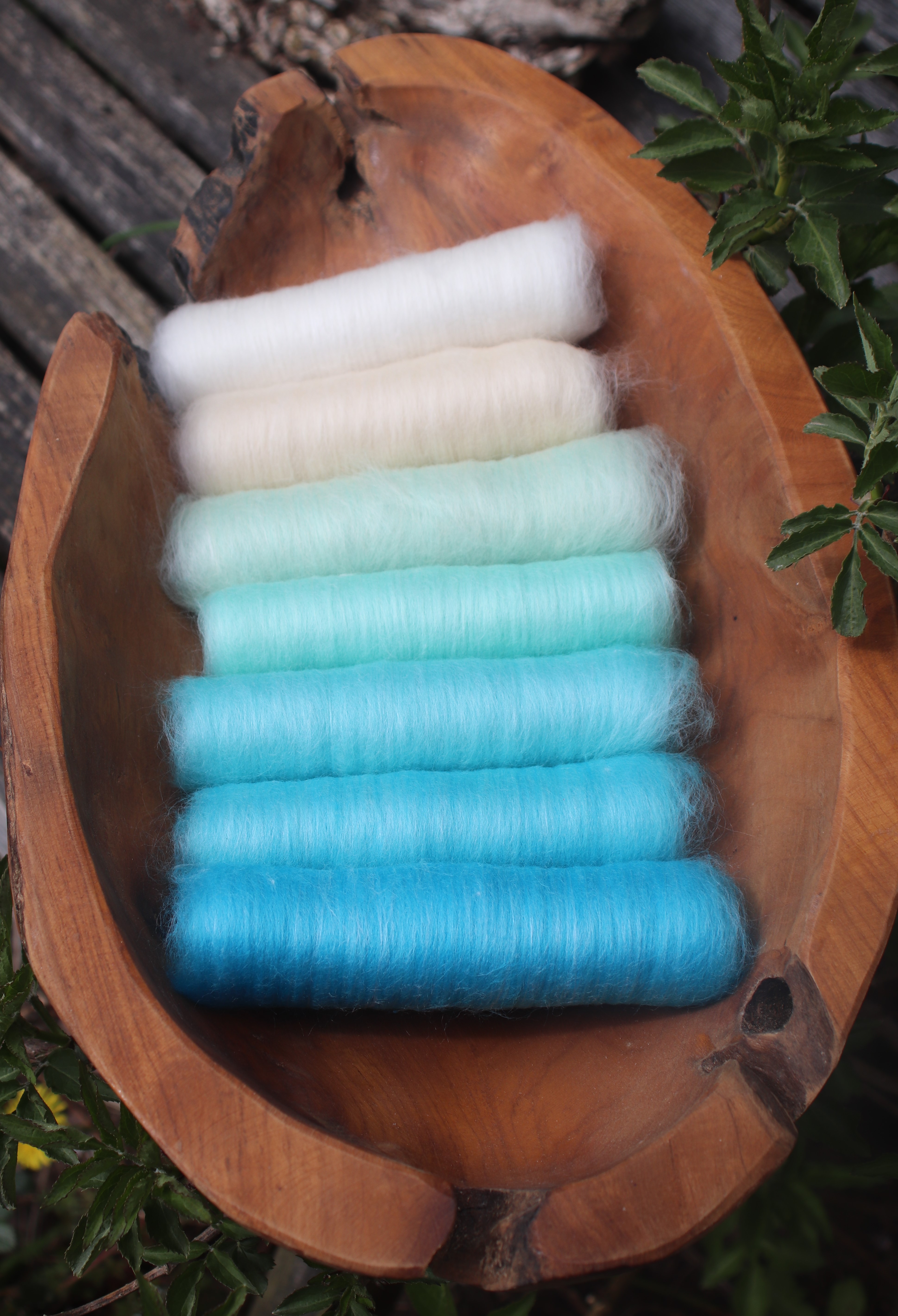 I made the gradient using soft merino in shades of mint, jade and turquoise blended with bamboo to depict the shimmer of the beautiful waters.