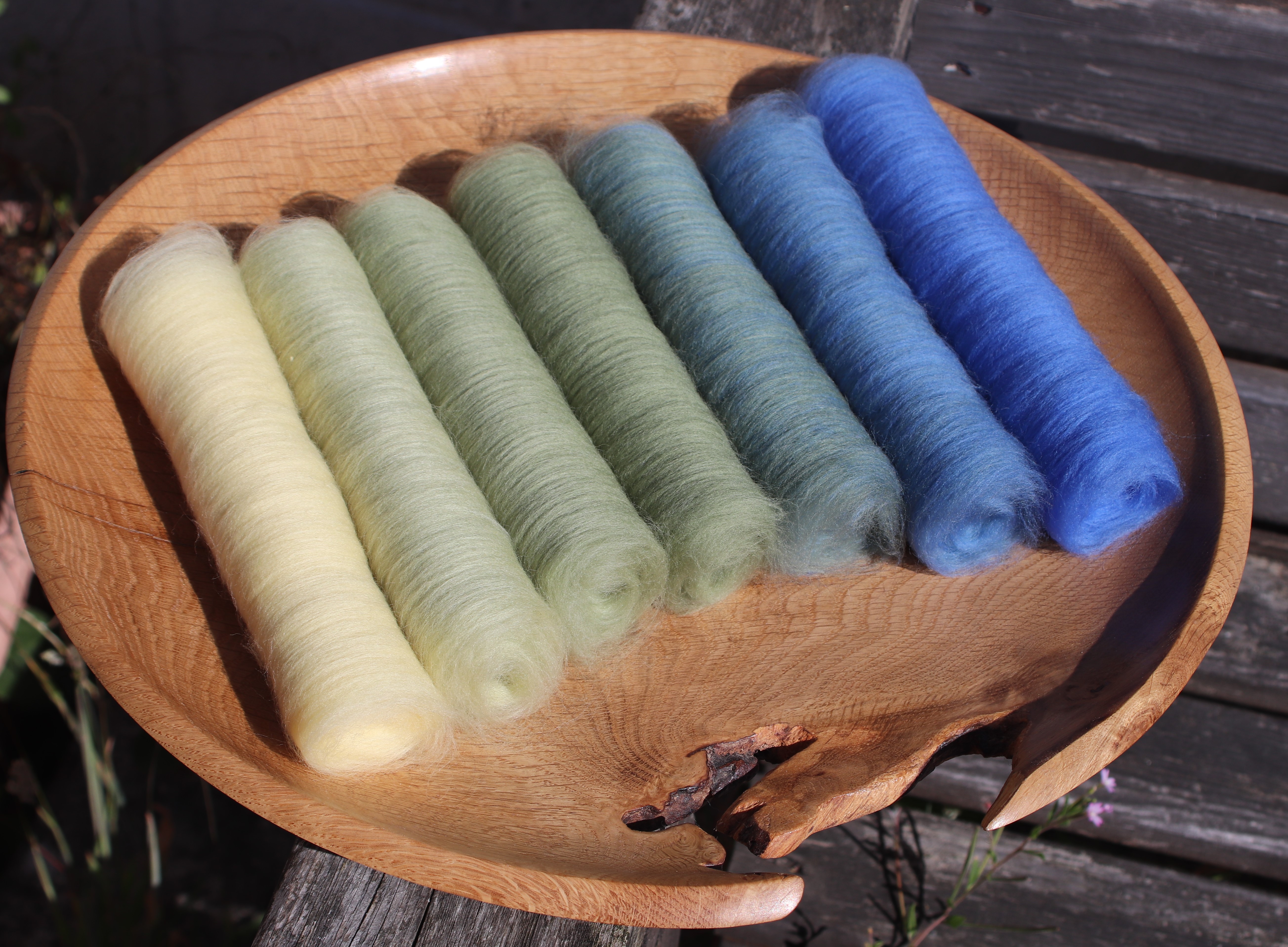 There are 7 hand blended batts, which together make up just over 100g of soft squishy 21 micron merino fibre. The gradient moves from soft lemon yellow through pale green to a bright cheerful blue.