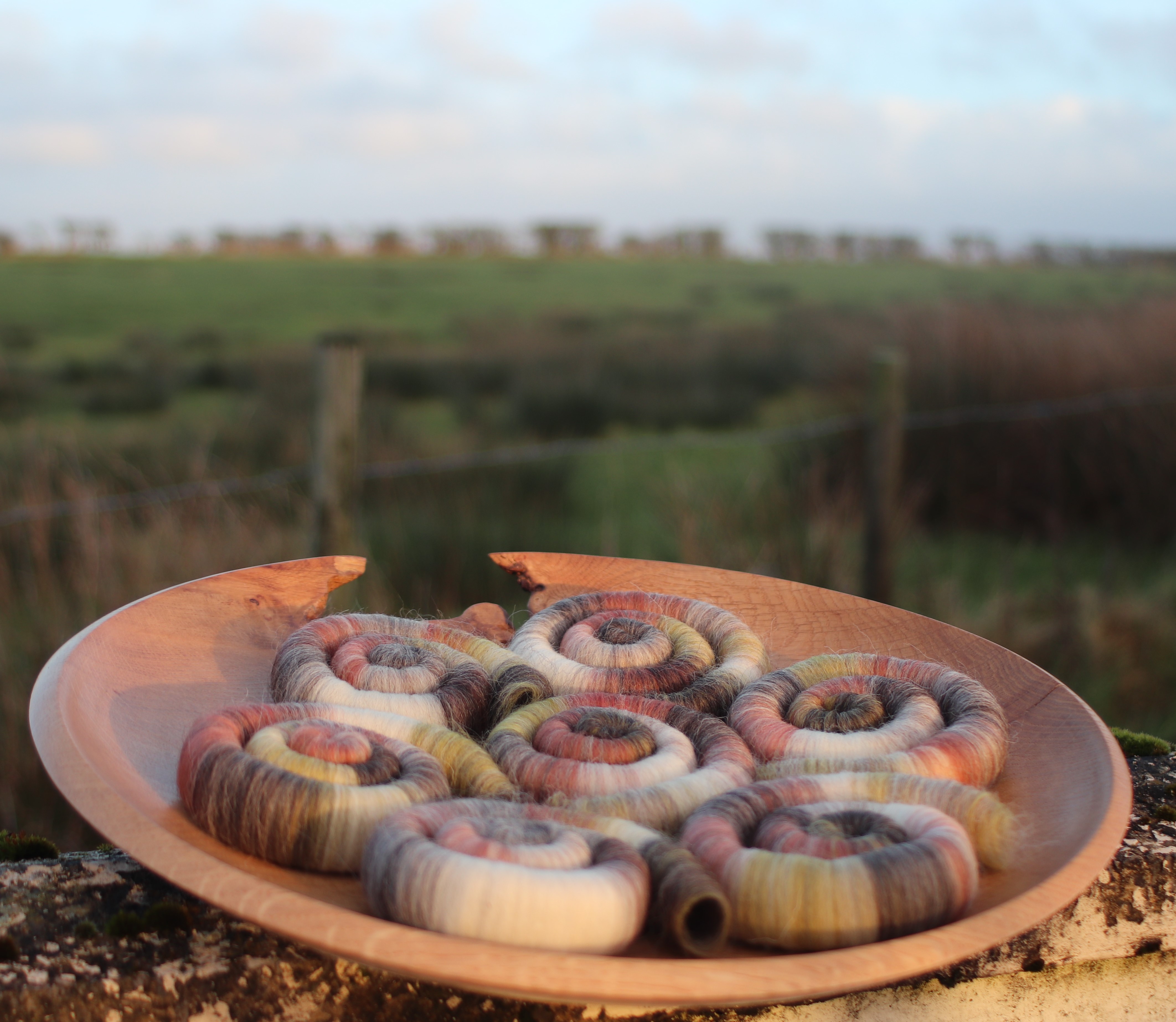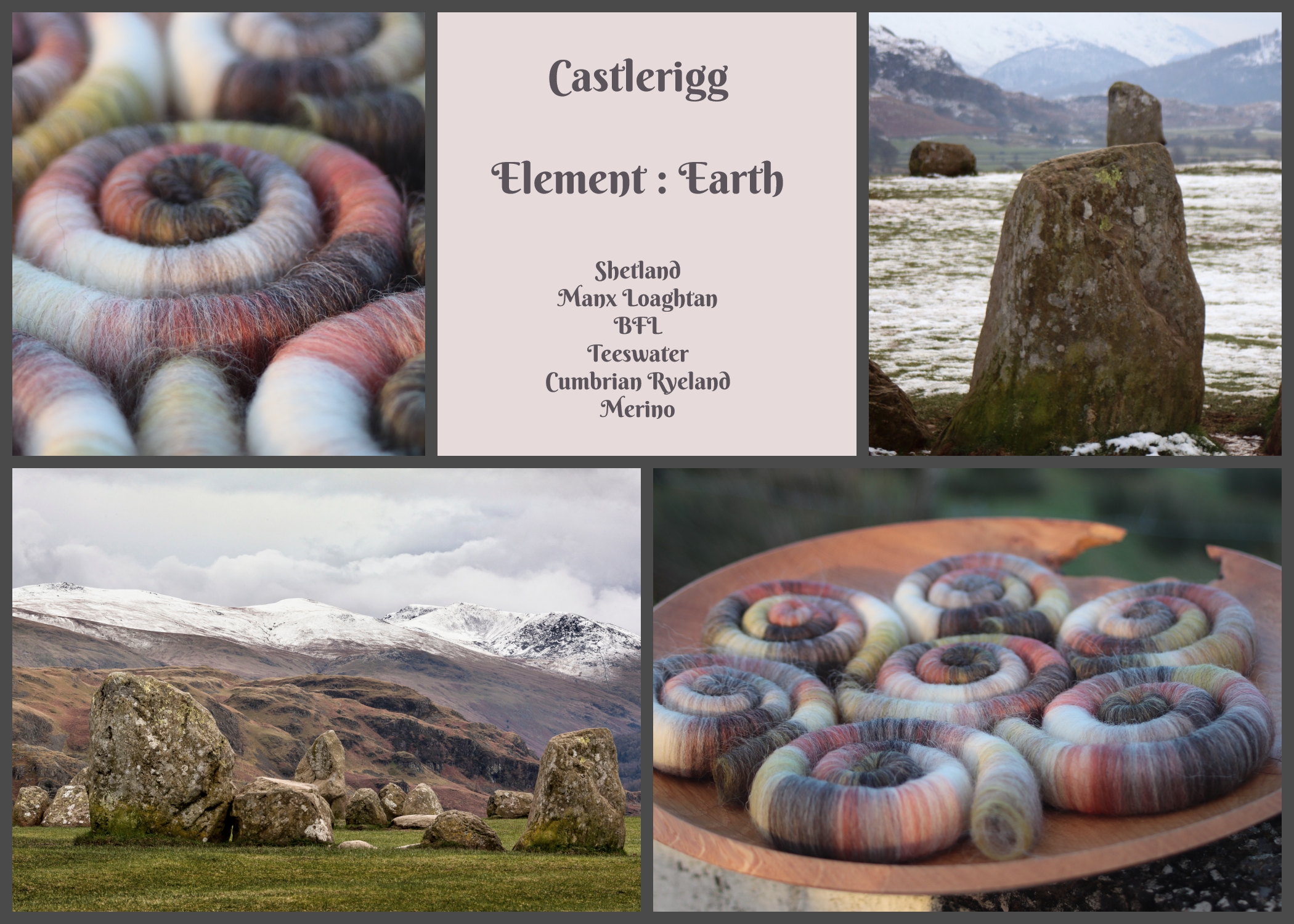 I chose the Neolithic stone circle at Castlerigg near Keswick as the basis for these Earth inspired rolags. I chose it because to me, this embodies all of my ideas about what the element Earth can imply. The stone circle was constructed in the Neolithic Age, which means ‘new stone age’, approximately 3000BC – a time before metal tools.