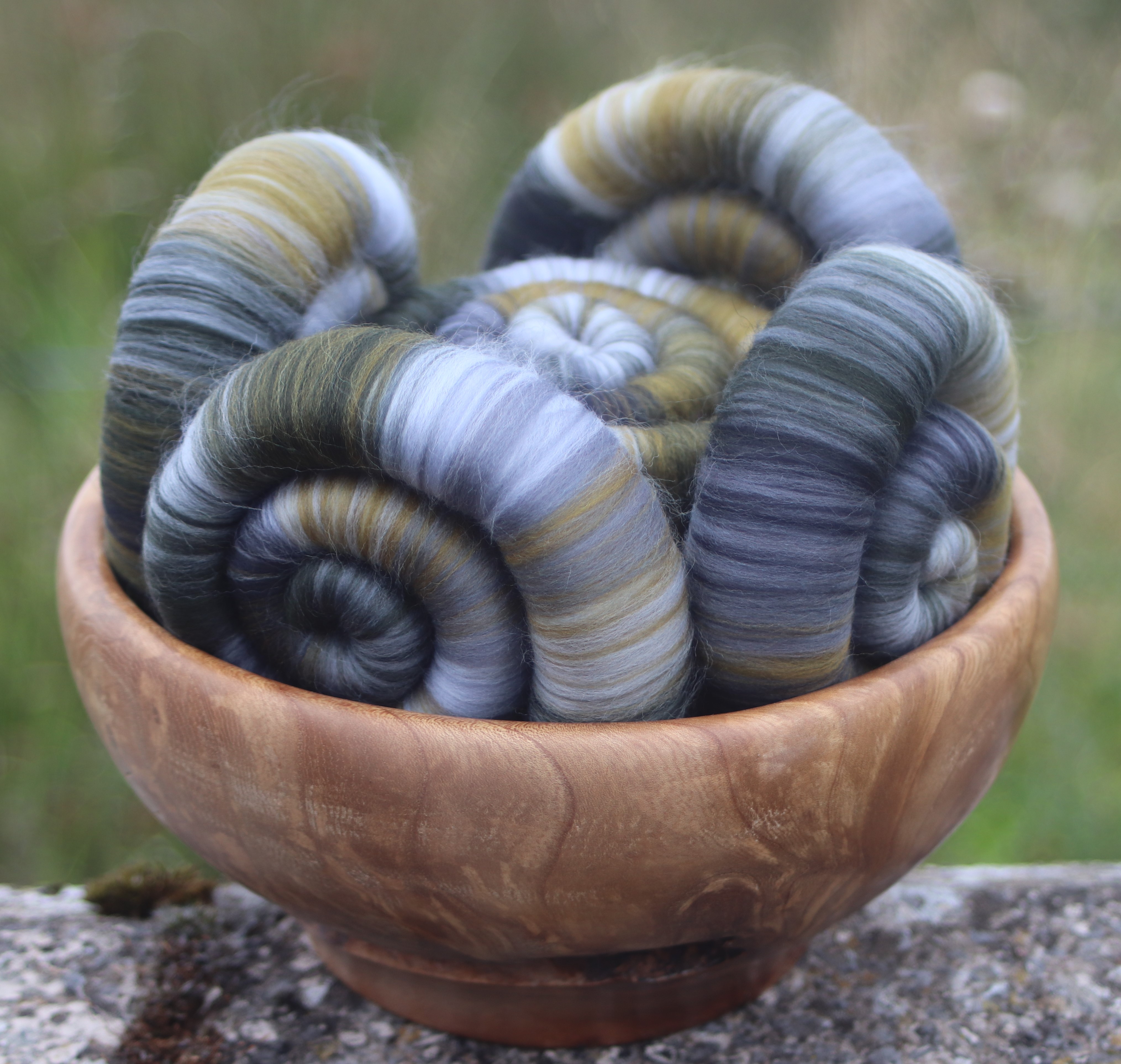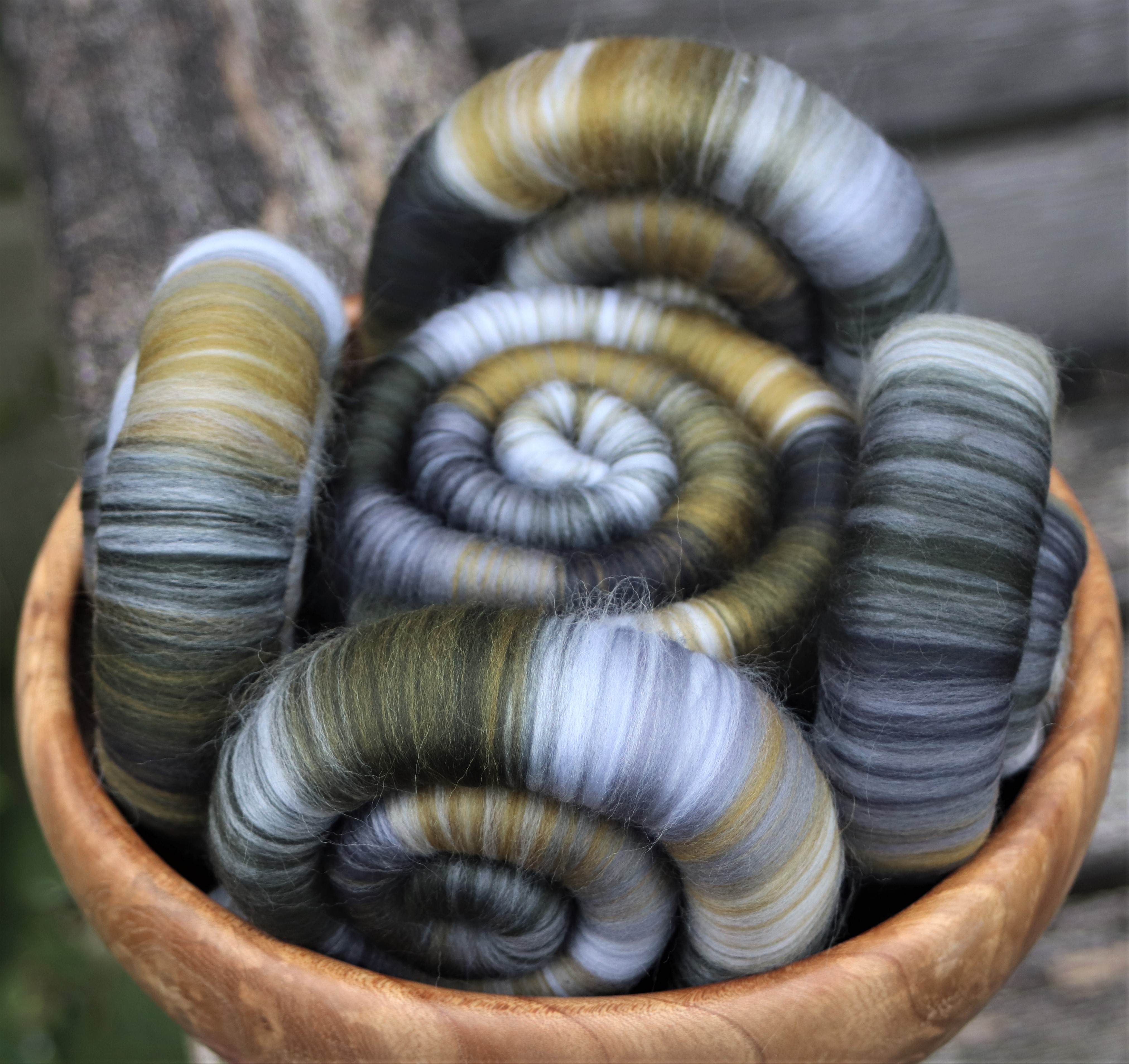 These Chemosynthetic rolags are made of 21 micron merino and superfine (18.5 micron) merino in shades of grey and green.