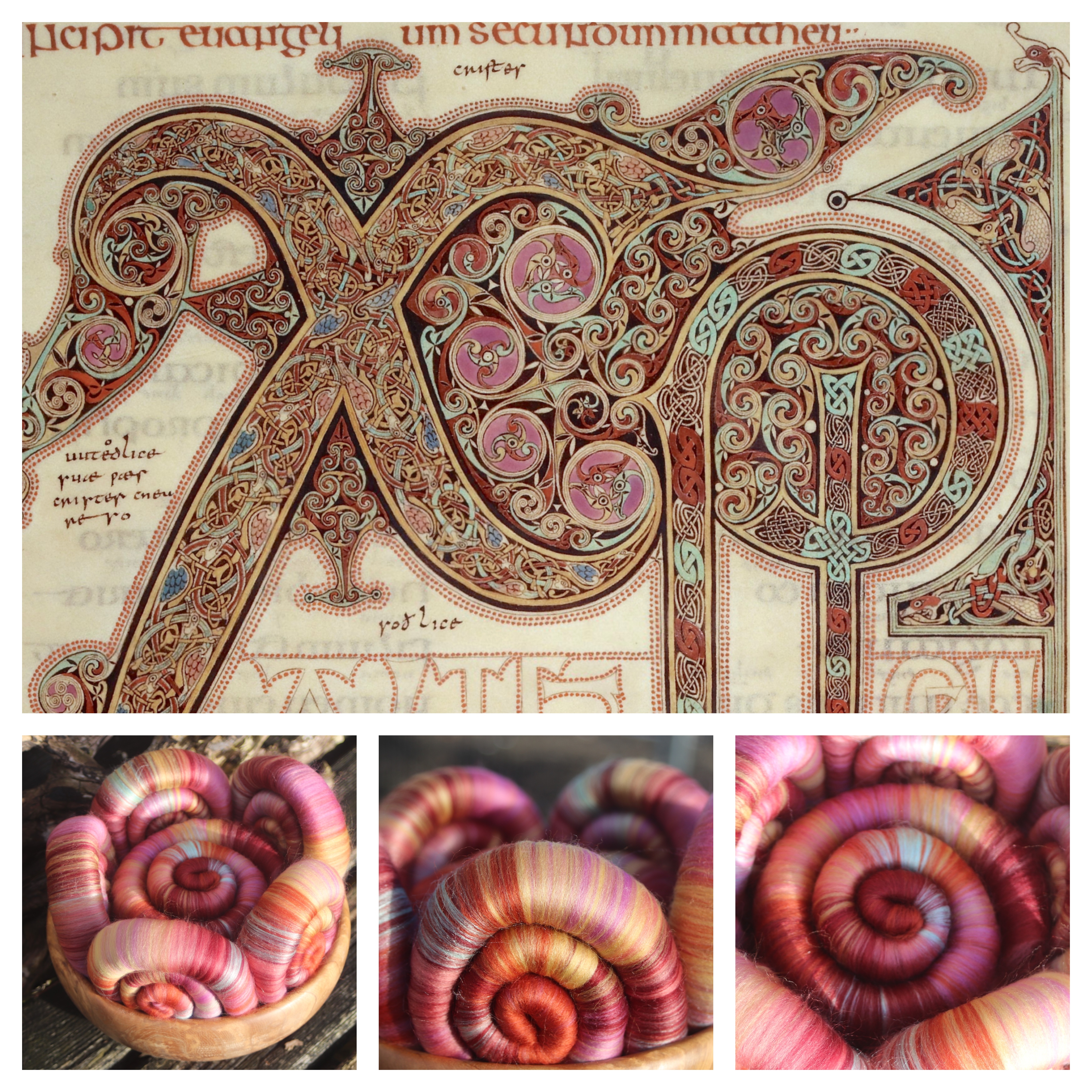 The inspiration picture is from the Gospel of Matthew. This was produced in the 7th Century by a scribe (who then went on to become a Bishop) called Eadfrith. The X and P that you can see on the page are the Greek letter Chi-Rho, which was a common monogram used for Christ.