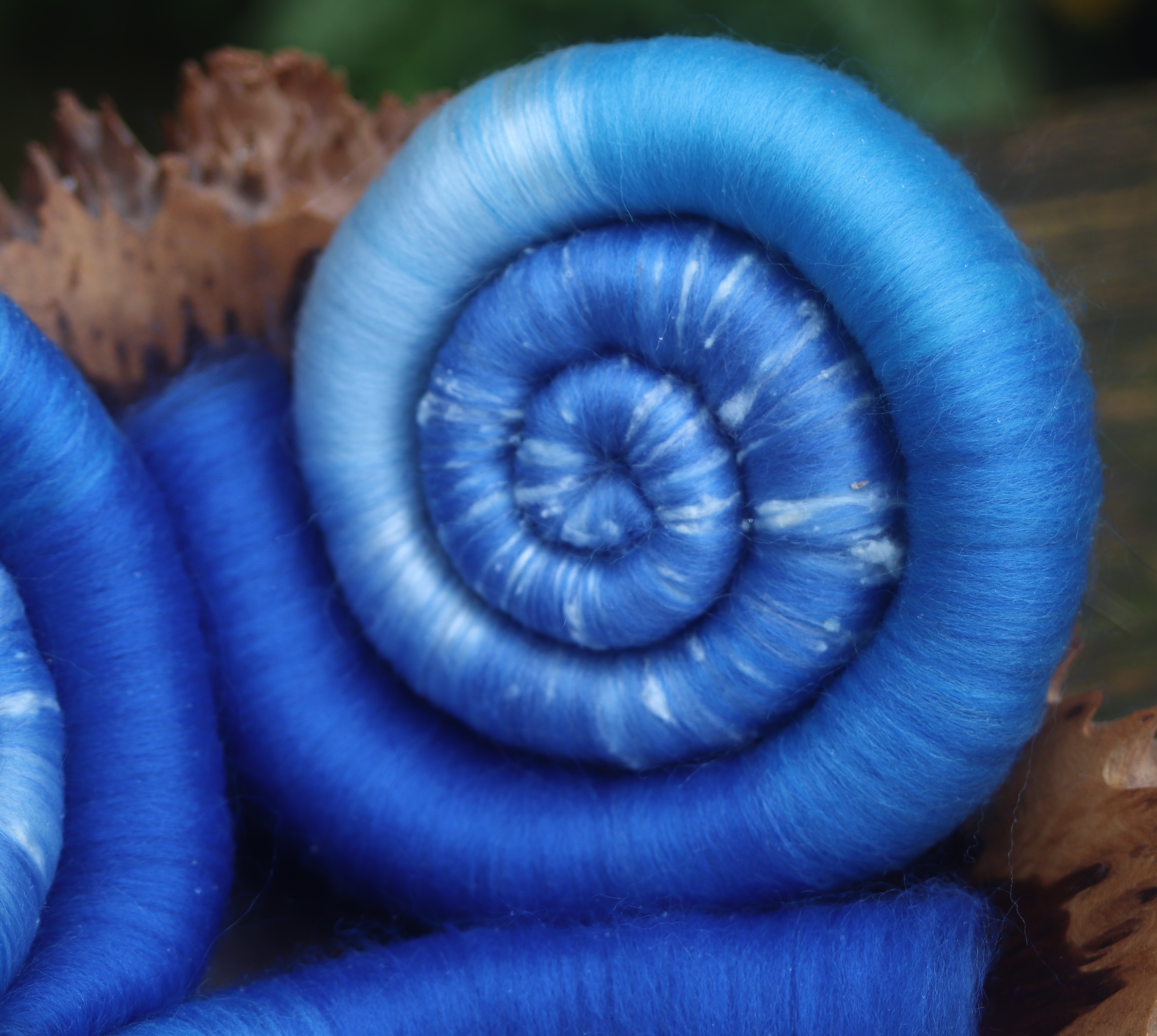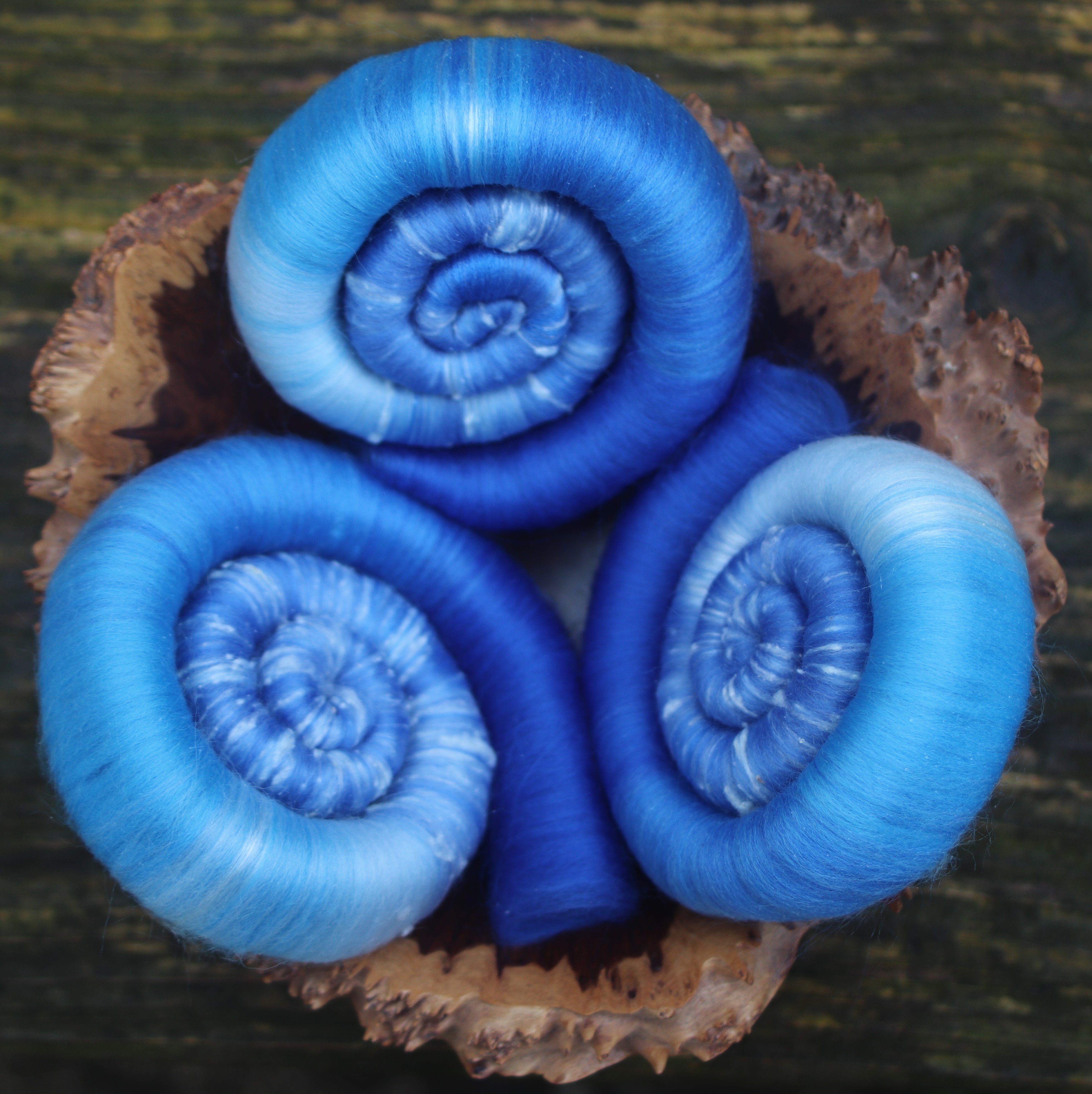 The rest of the rolags are made from soft, smooth 21 micron merino, with little highlights and lowlights made using white mulberry silk and blue tussah silk.