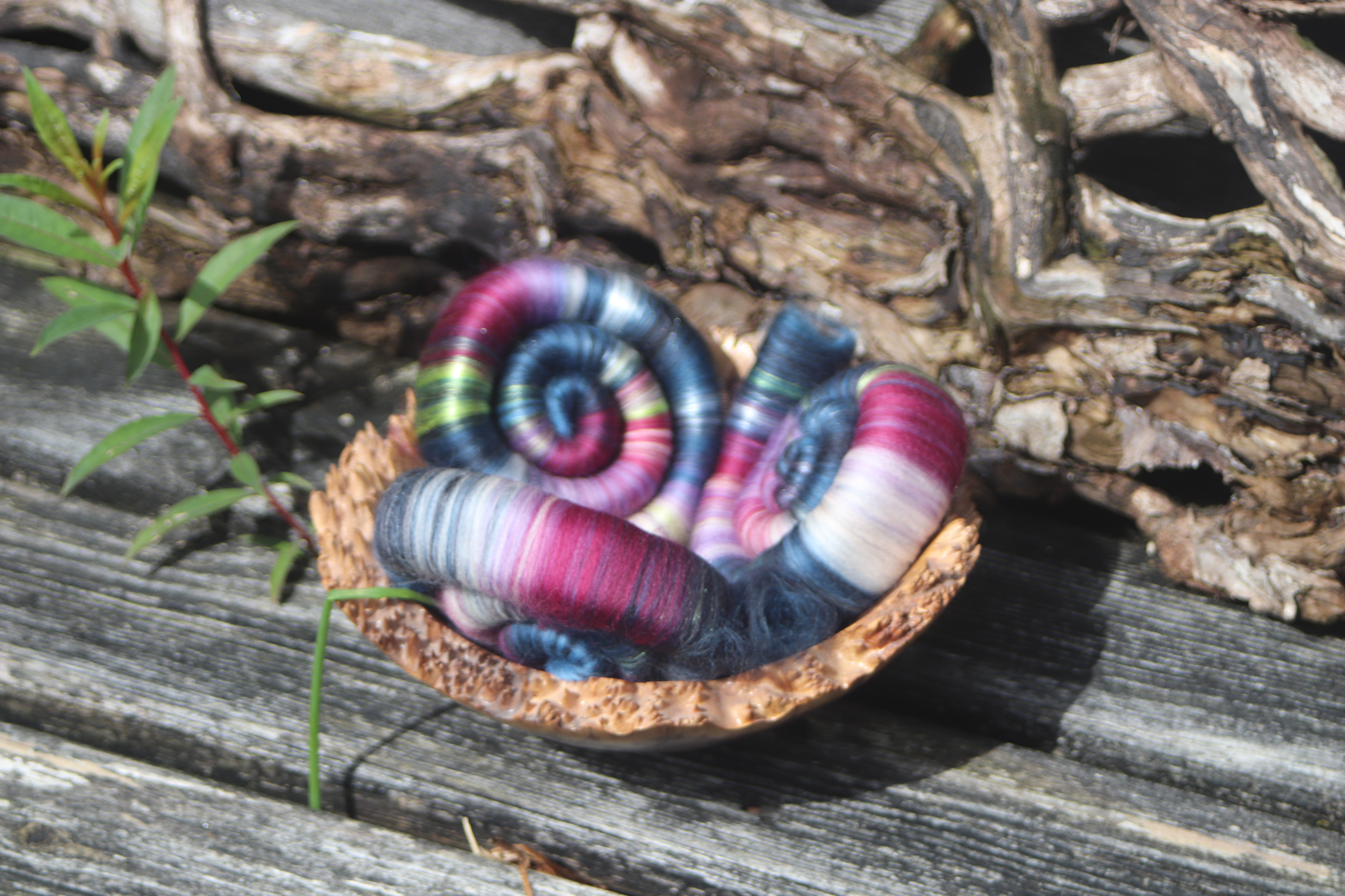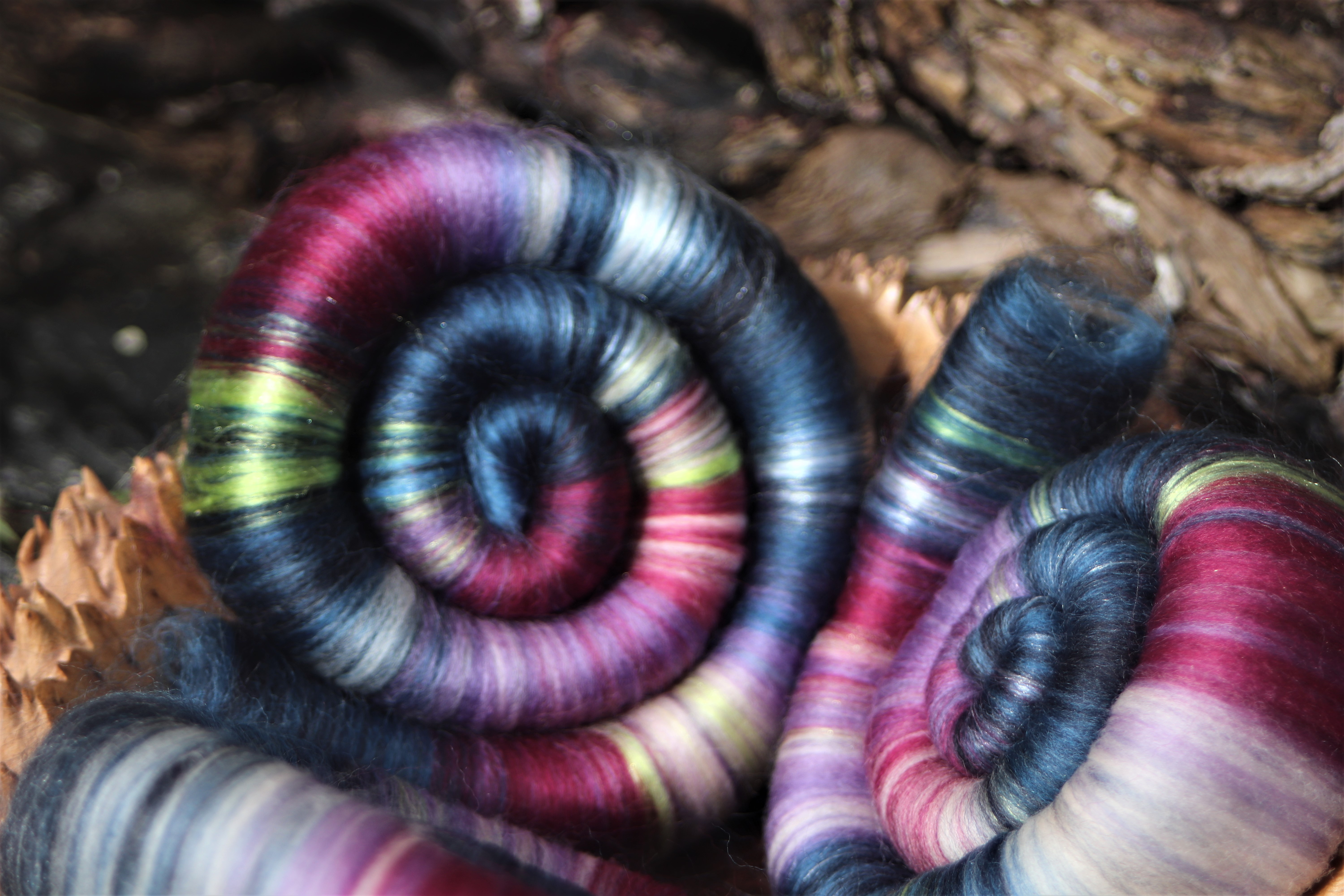 I loved the interactions of the blue and burgundy shades in this photograph. The rolags are made of superfine merino, merino and mulberry silk.