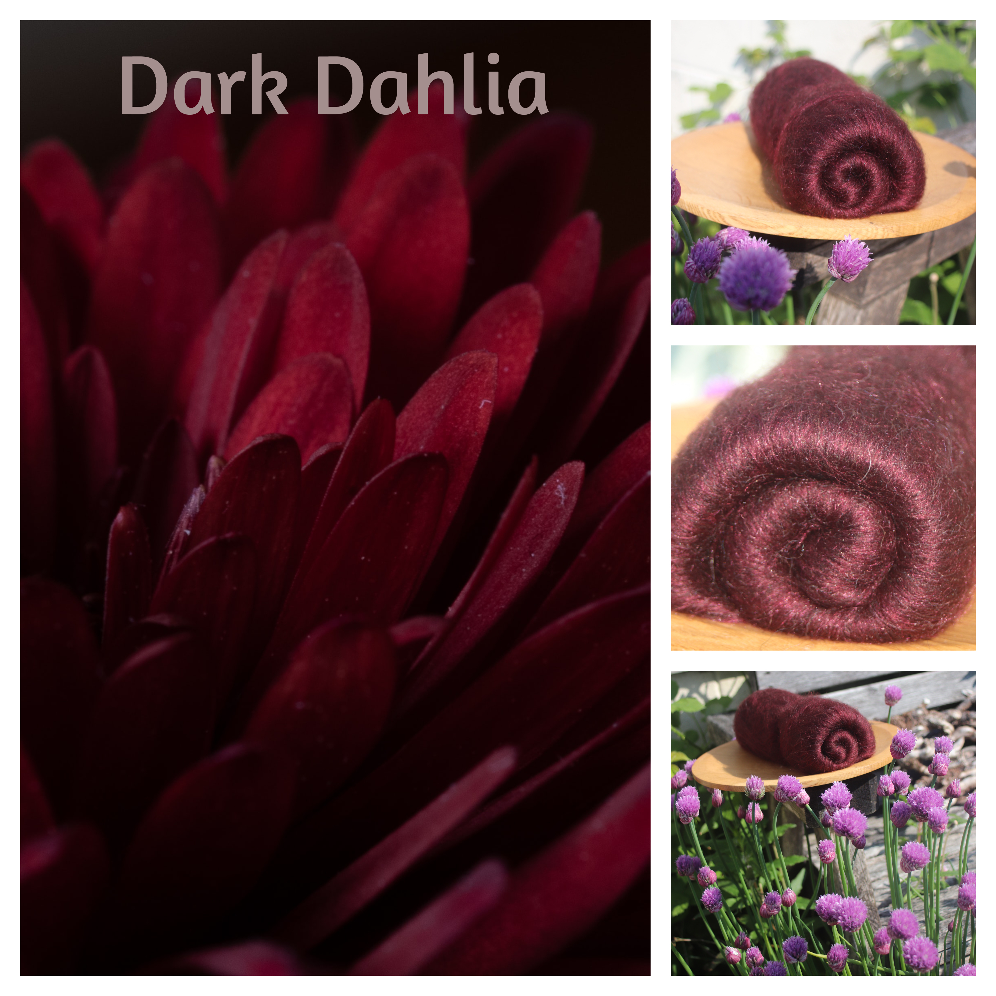 This single colour batt is a dark, elegant shade of deep red, based on the colour of so called black or chocolate Dahlia flowers. This blend was also put together for the 'Warning - When I am old I will wear purple' box.