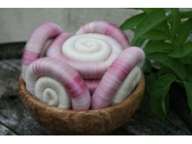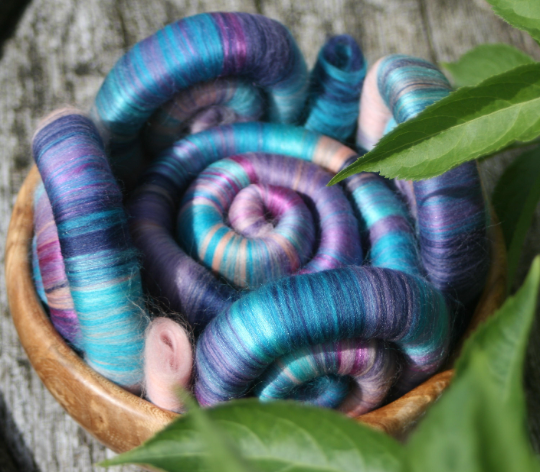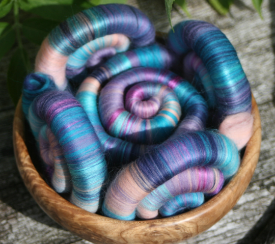 I took 21 micron merino in shades of pink, blue and mauve and blended them with mulberry silk and tussah silk in shades of turquoise and purple.