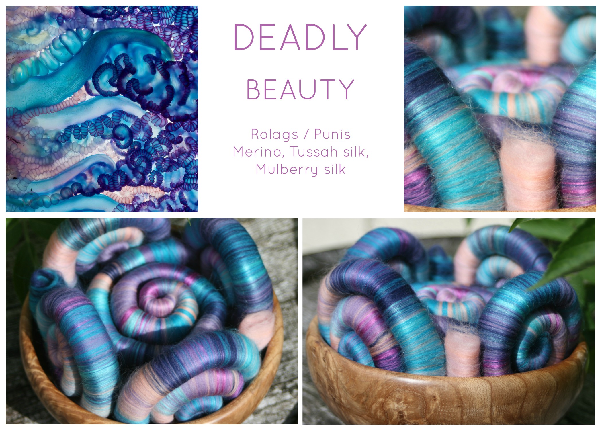 You will receive 100g of rolags in the Deadly Beauty colourway.