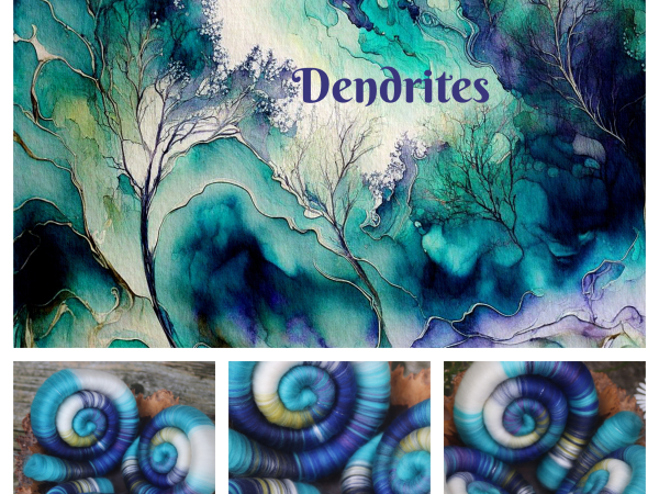 Sometimes an image just completely grabs my attention and I just have to make it up into a new colourway. This is one such image. From a first glance I just loved the swirling colours. Then I noticed the outlines of the tree like shapes when I looked closer. Hence the name 'Dendrites'. Dendrite meaning a branching tree like structure - used in biology to name the branched sections of a nerve cell that lead to synapses.