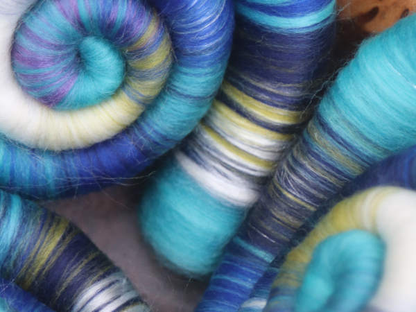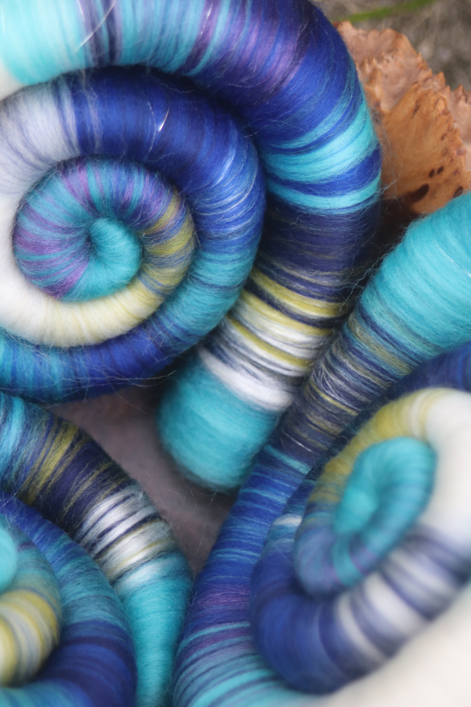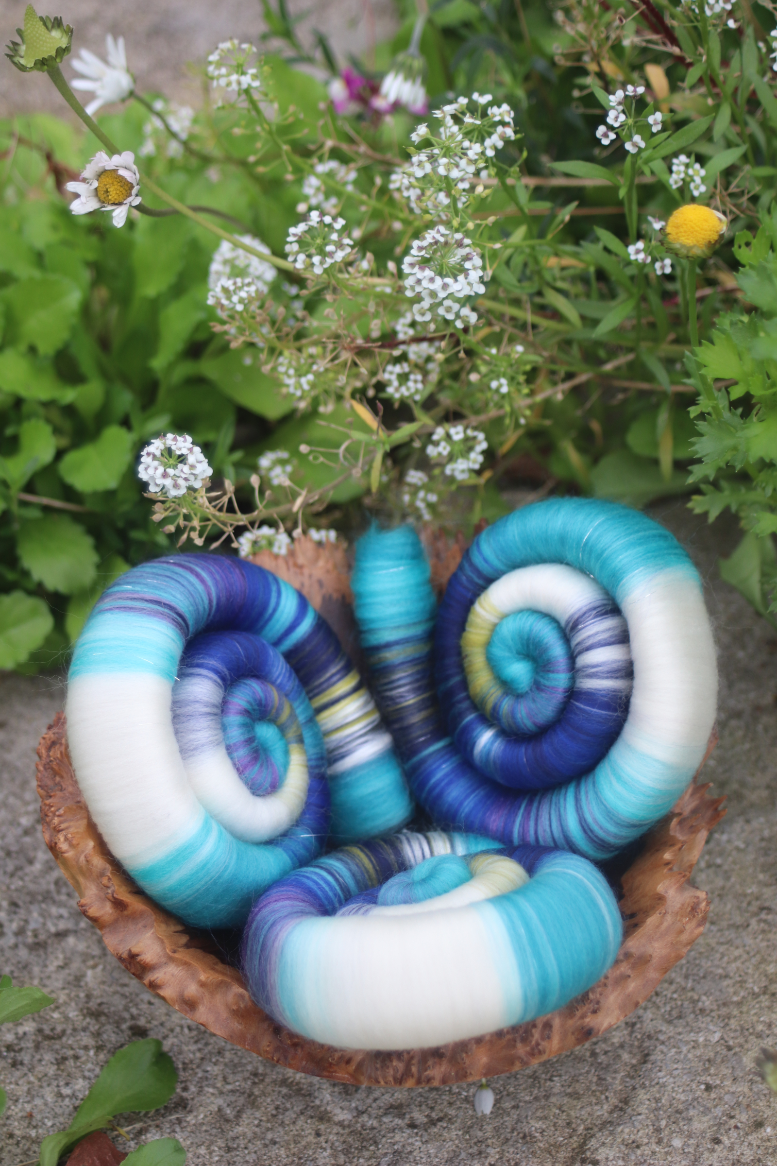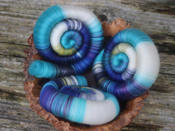 These rolags will spin up into a beautifully soft yarn with drape (thanks to the includion of the silk) and a little shimmer.