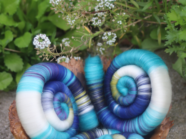This colourway is made up of both 21 micron merino and superfine 18.5 micron merino with the addition of some beautiful violet tussah silk.