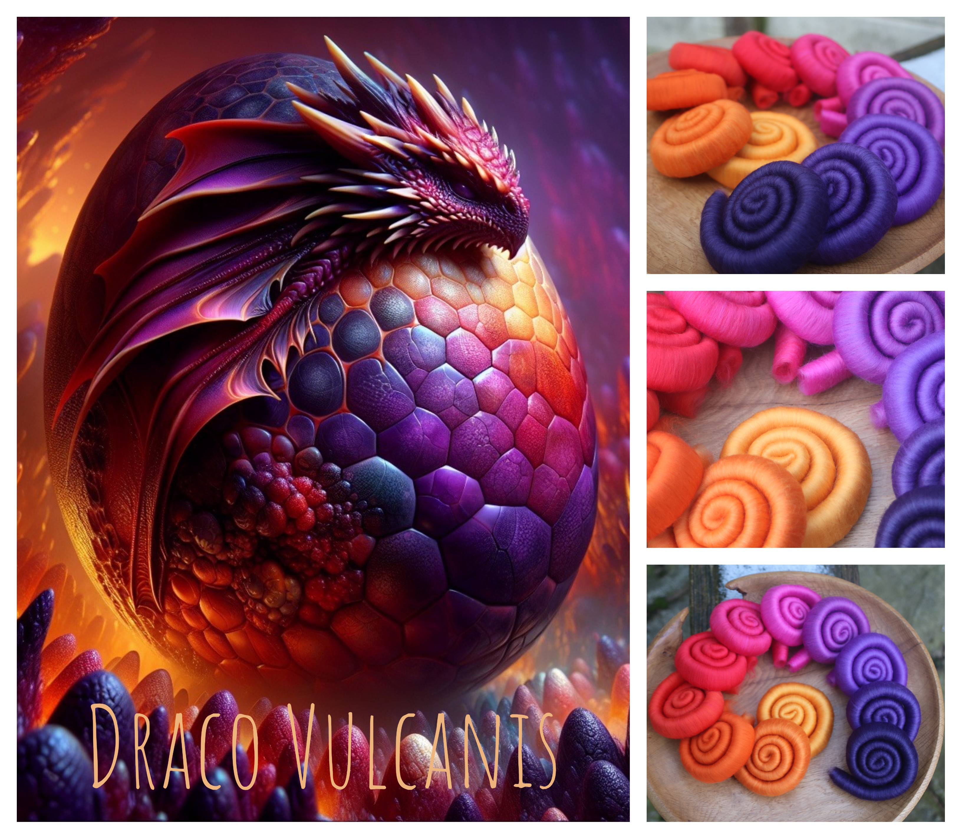 This colourway i called Draco Vulcanis. I put together this 'species' name from Draco (from the Greek name "drakon" meaning dragon) and Vulcan being the Roman God of fire, blacksmithing and volcanoes. This is because the colours in the egg reminded me of the colour of maga within a volcano. The shade move from bright yellow, through oranges to red and then on to deep violet shades.