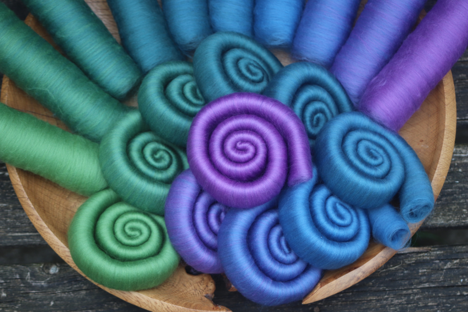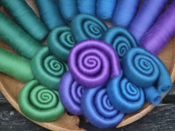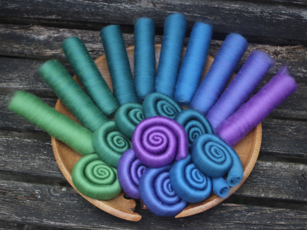 This is a 10 shade merino gradient, based on a blue/green/purple dragon, each rolag is 10g of 21 micron merino