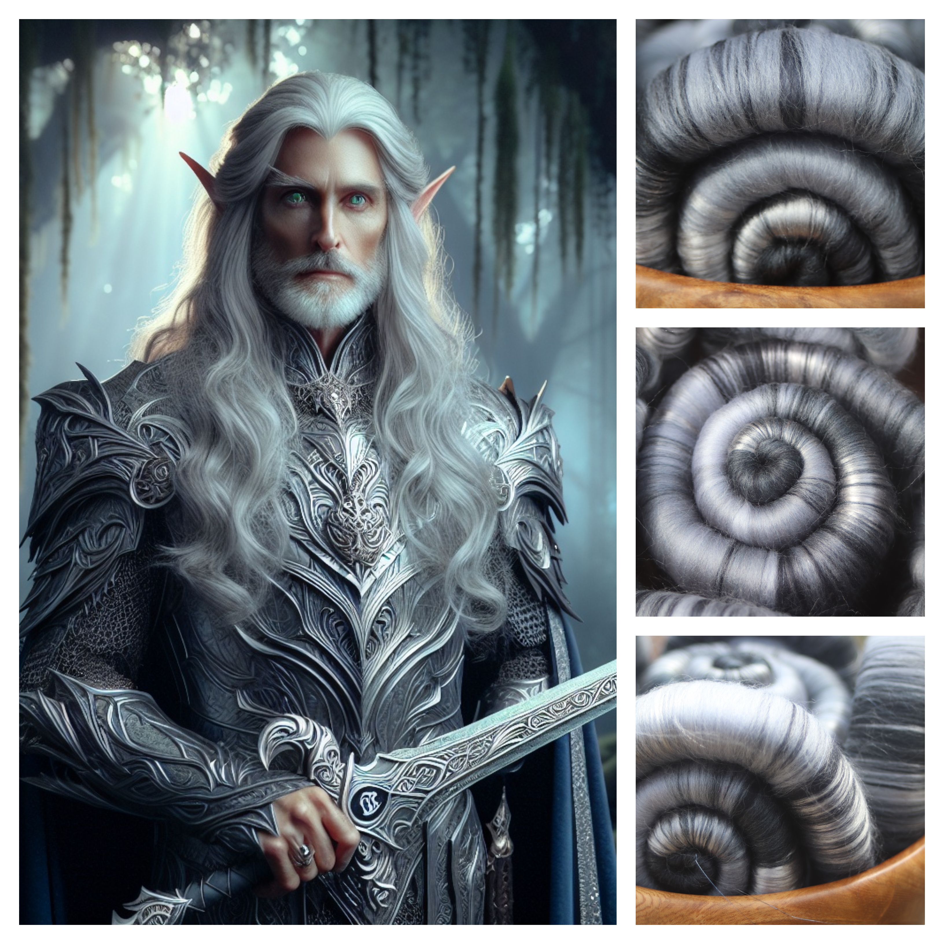 These rolags were designed for the Halloween Box for 2024, entitled 'Monsters and Magic. I wanted a colourway that would produce a really elegant looking yarn once spun. I took my inspiration from the image of an Elf in armour. I loved the almost monochrome image, and set out to make something a little special in monochrome.