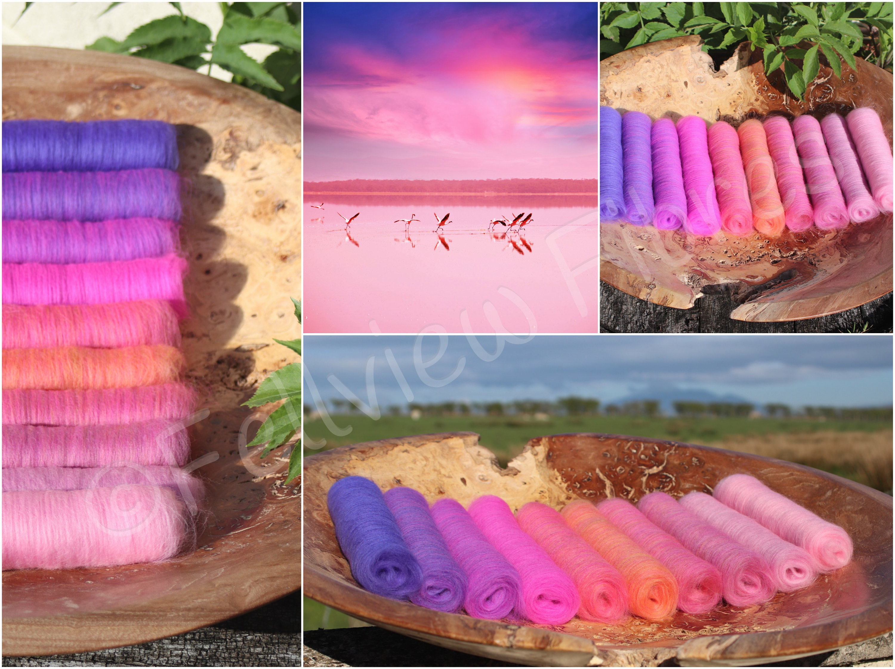 I fell in love with the colours in the photograph of the flamingos. Such brightly coloured birds backed by a vivid sunset palette. So I decided to try to translate these colours into a fibre gradient. Easier said than done.