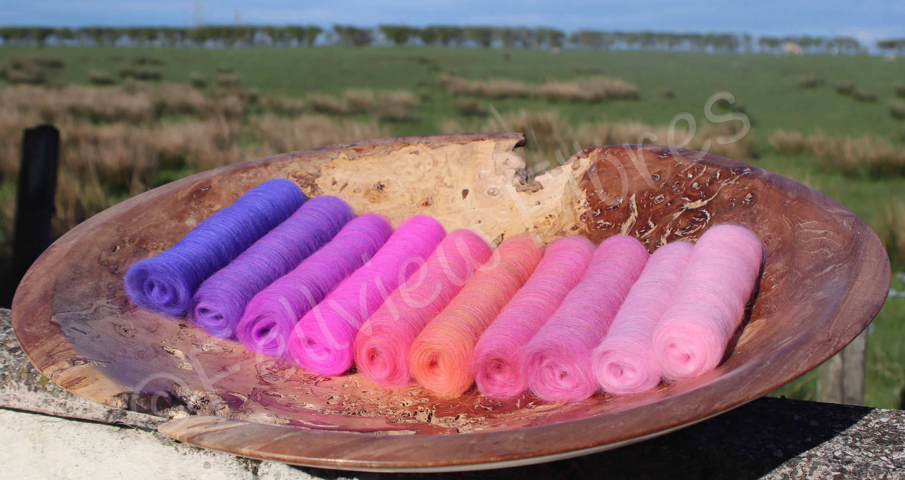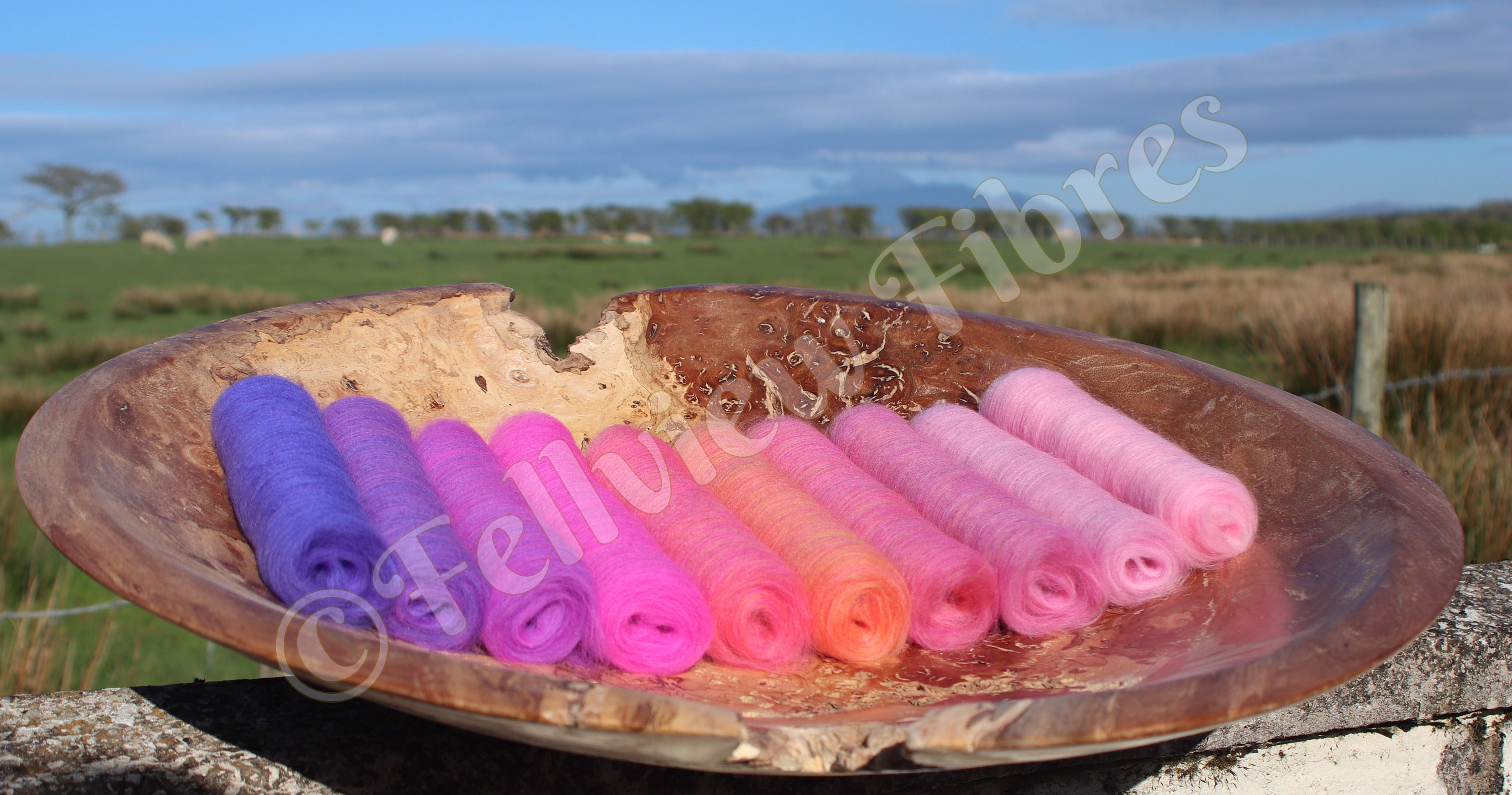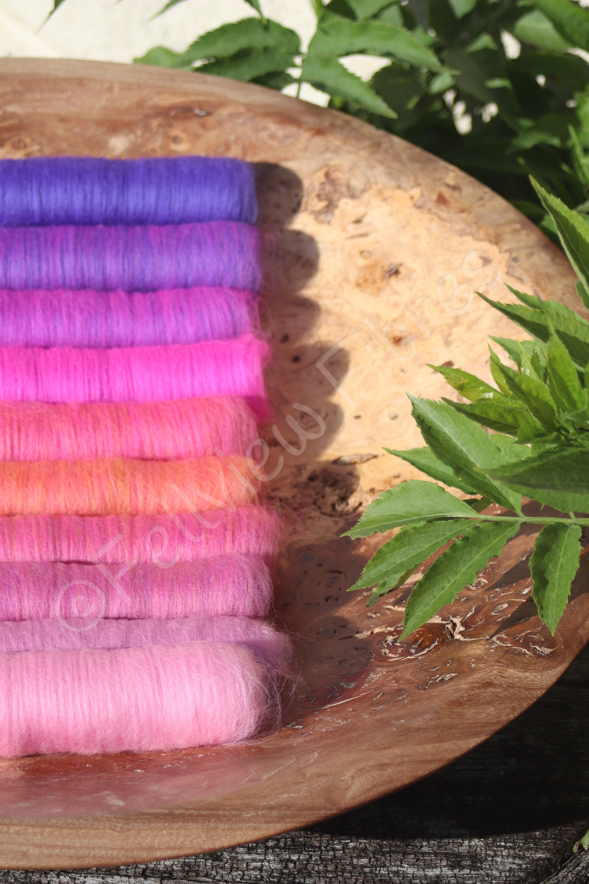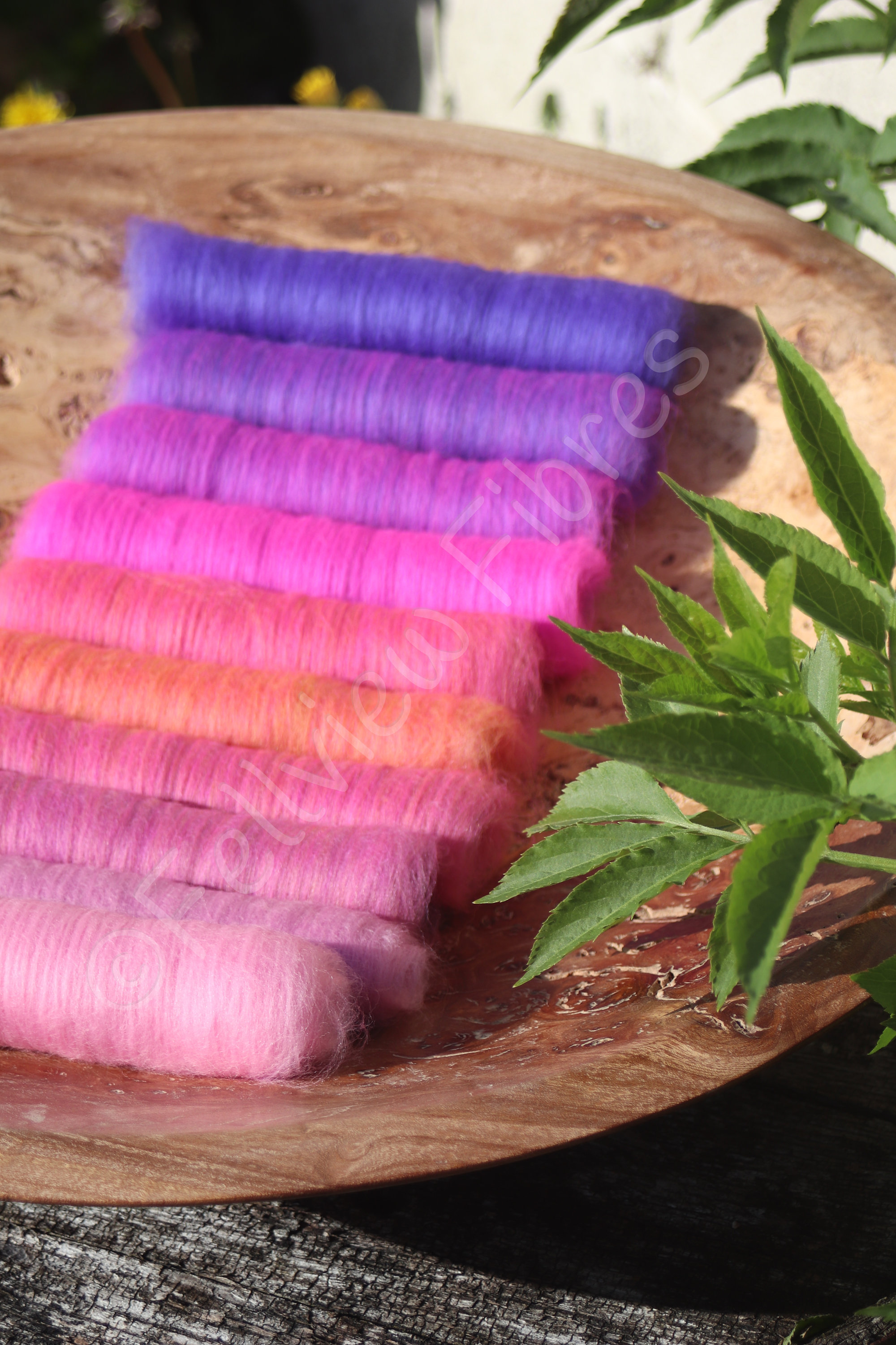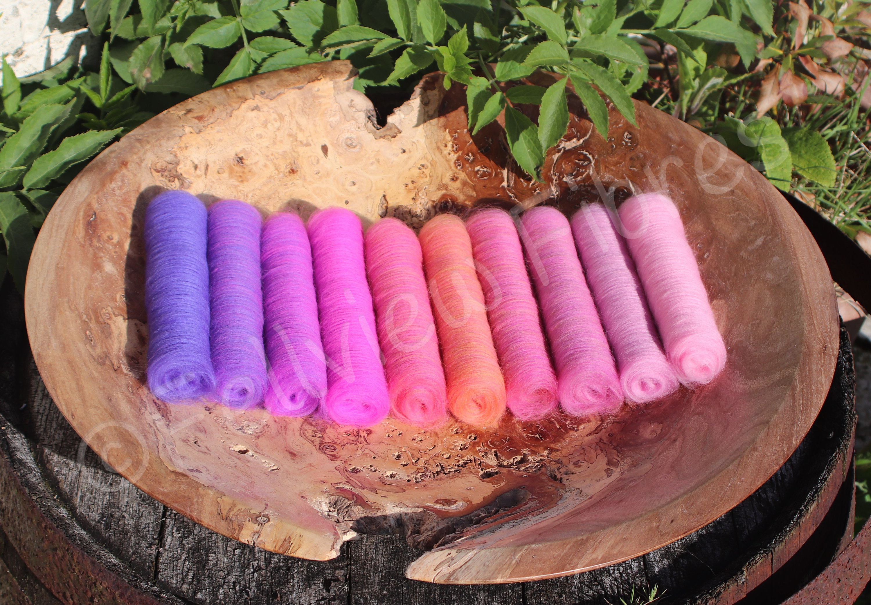 I have eventually produced a gradient made from 10 mini batts of beautifully soft merino fibres. The colours move from a blue violet shade, through pinky lilacs and golden hues to a soft gentle pink.