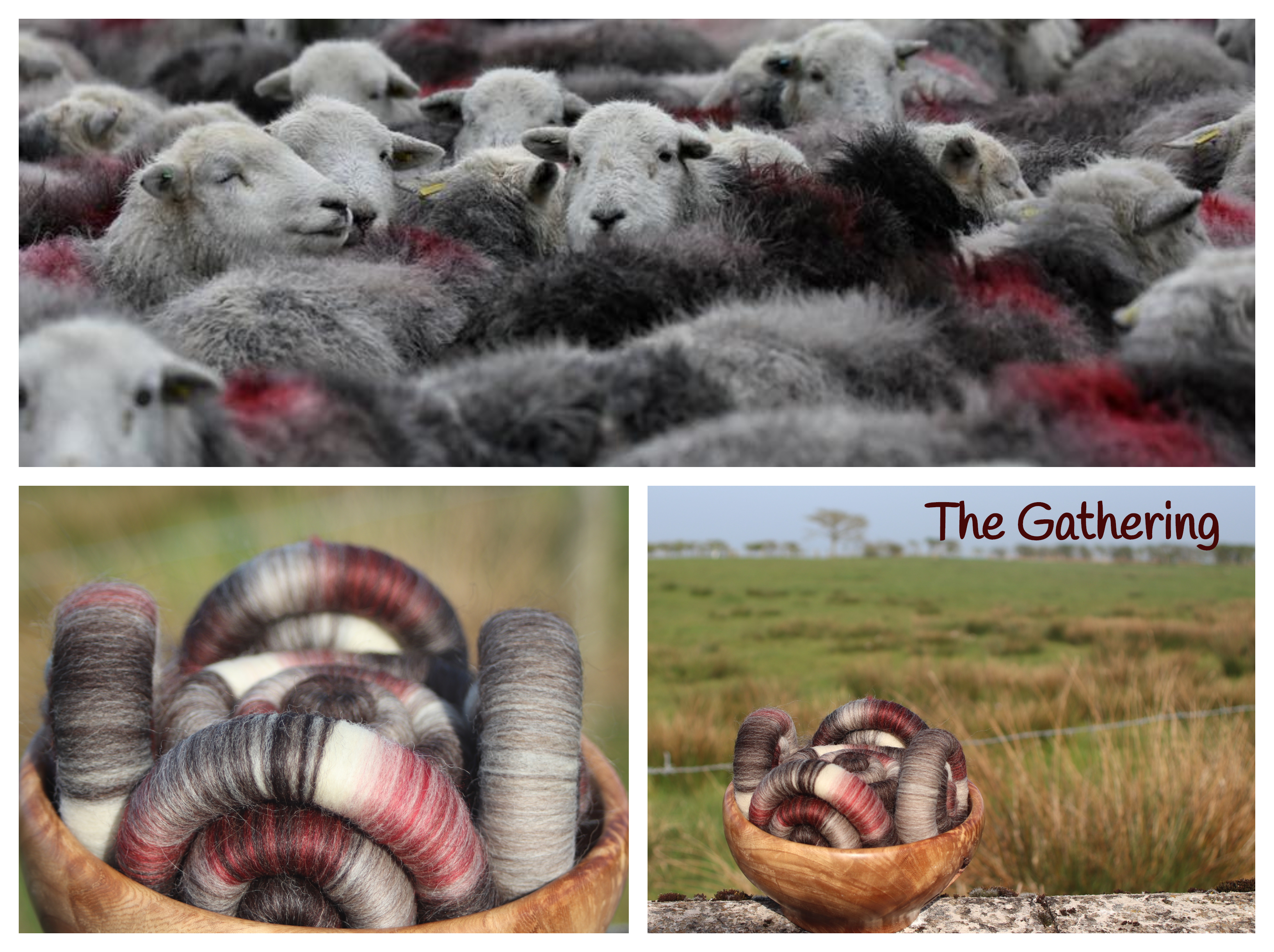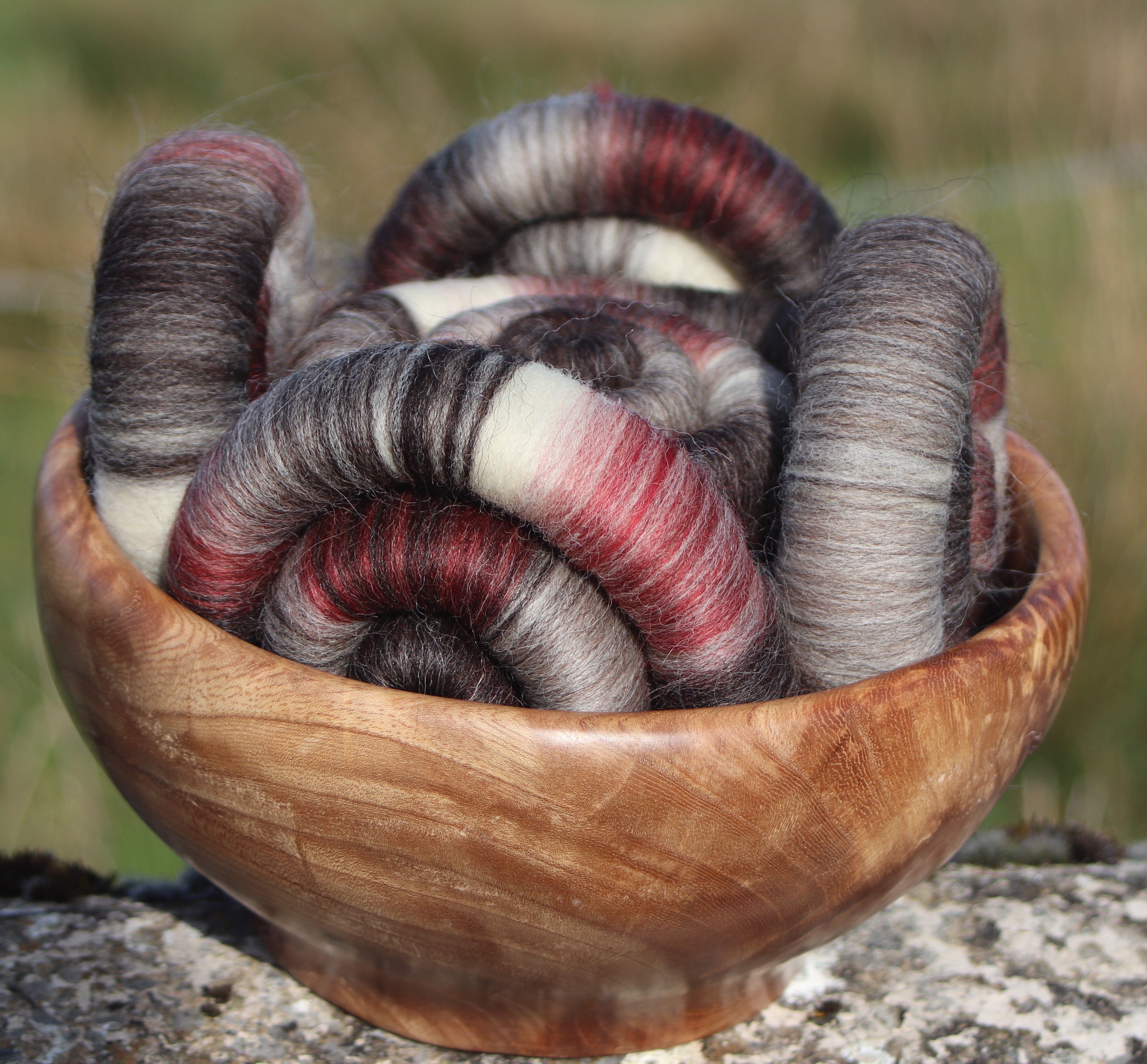I tried to use naturally coloured fibres as much as possible in this blend. I have used locally sourced Ryeland, oatmeal BFL, New Zealand fibre, Zwartables and Manx Loughtan blended with red merino.