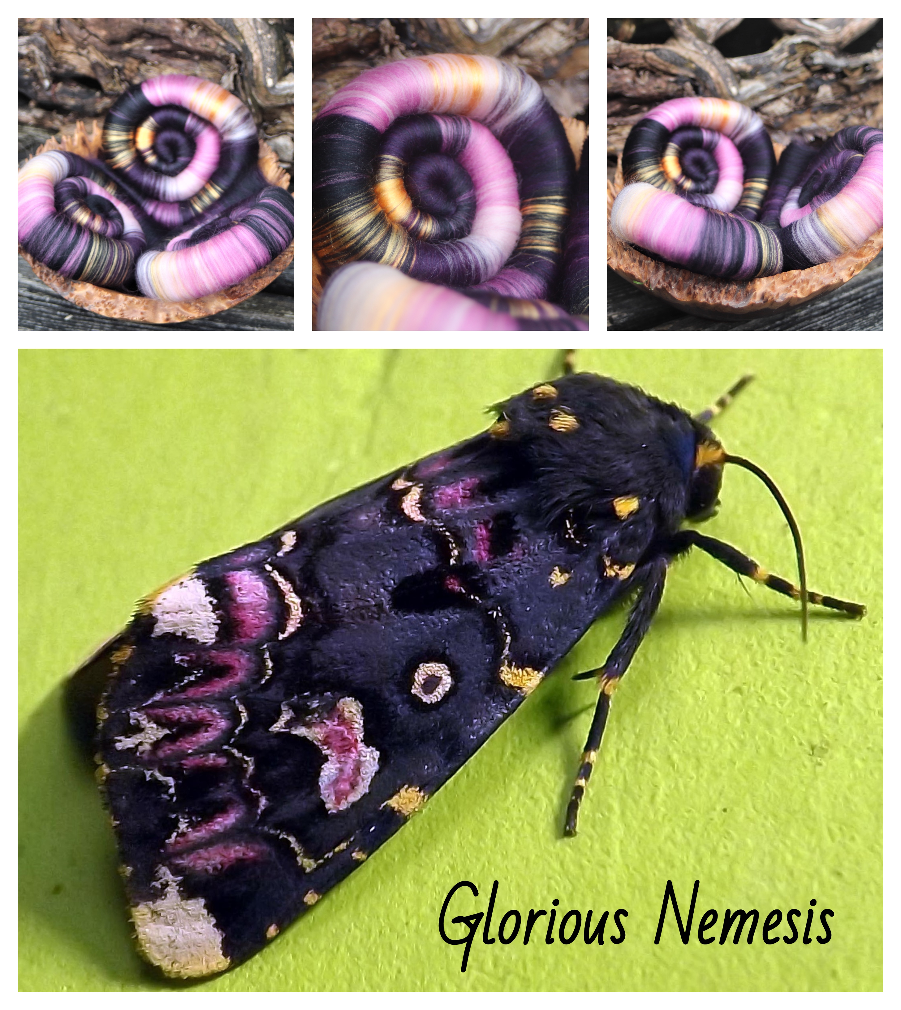 These rolags were the final instalment for the Biodiversity rolag club in 2022. I wanted to choose a normally overlooked species for this colourway. I began to look at insects for colour inspirations, and found this moth, Polytela gloriosae - otherwise known as the Indian Lily Moth. A beautiful moth.... but still a moth - hence the name Glorious Nemesis - Nemesis due to the fact that I seem to spend my life with lavendar and cedar oil, defending my wool against a rather different species of moth.