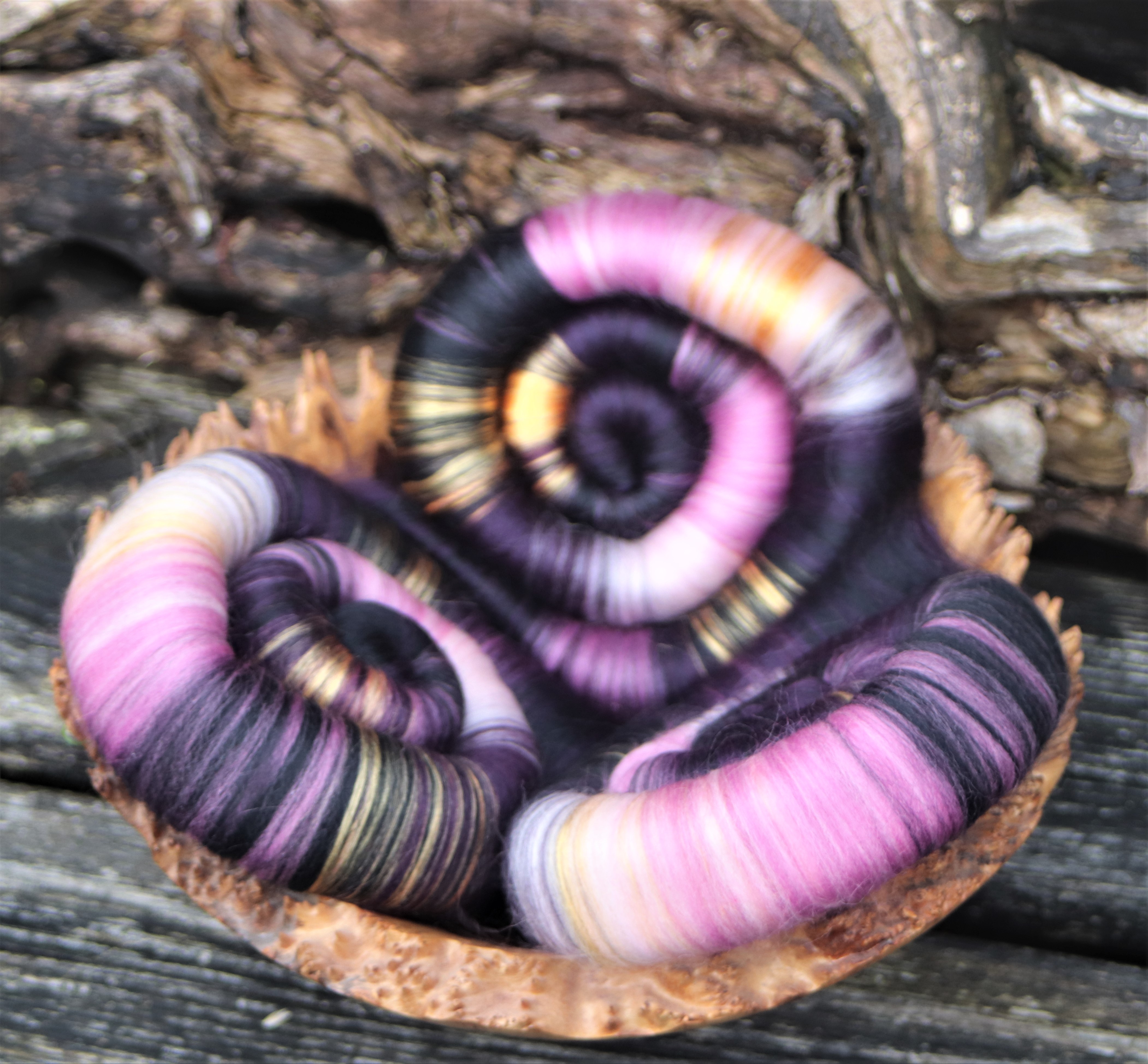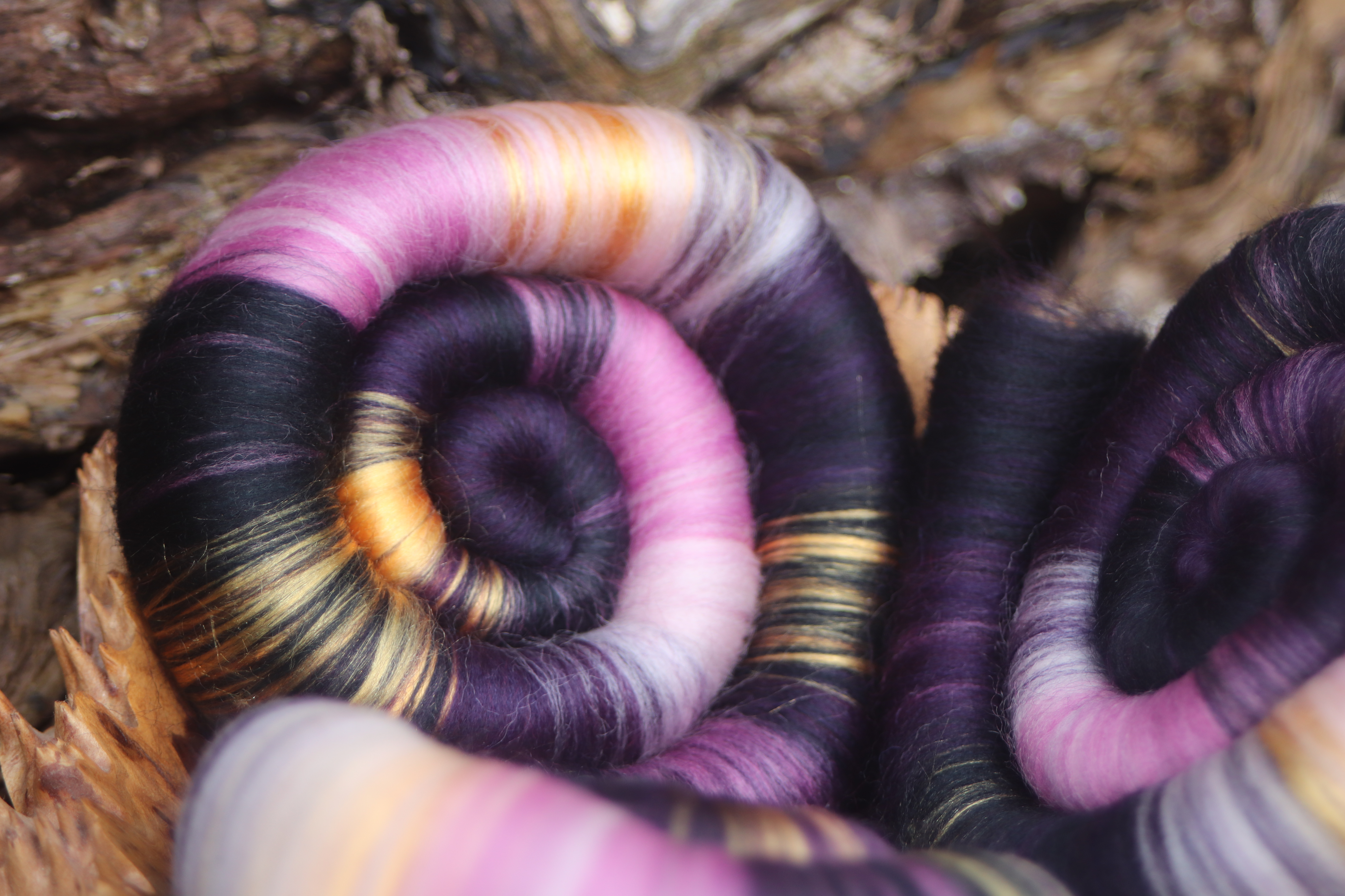 These rolags are made from 21 micron merino in shades of pink, purple and black, with golden mulberry silk running through.