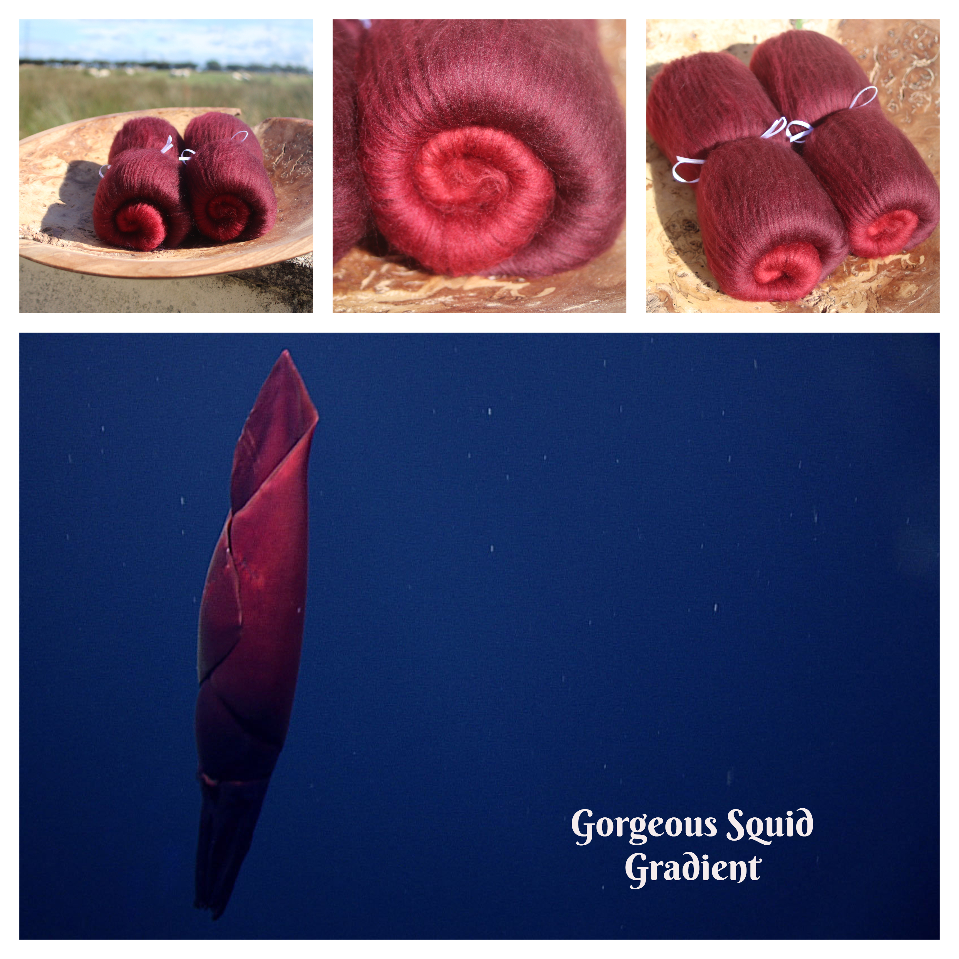 This colourway is based on a squid which was nick named the ‘Gorgeous squid’ by the 2016 Deepwater Exploration of the Marianas by NOAA. This squid cannot be definitely identified, and was photographed in waters over 1000m deep, and it was still descending towards the sea bed in some of the deepest oceans in the world.