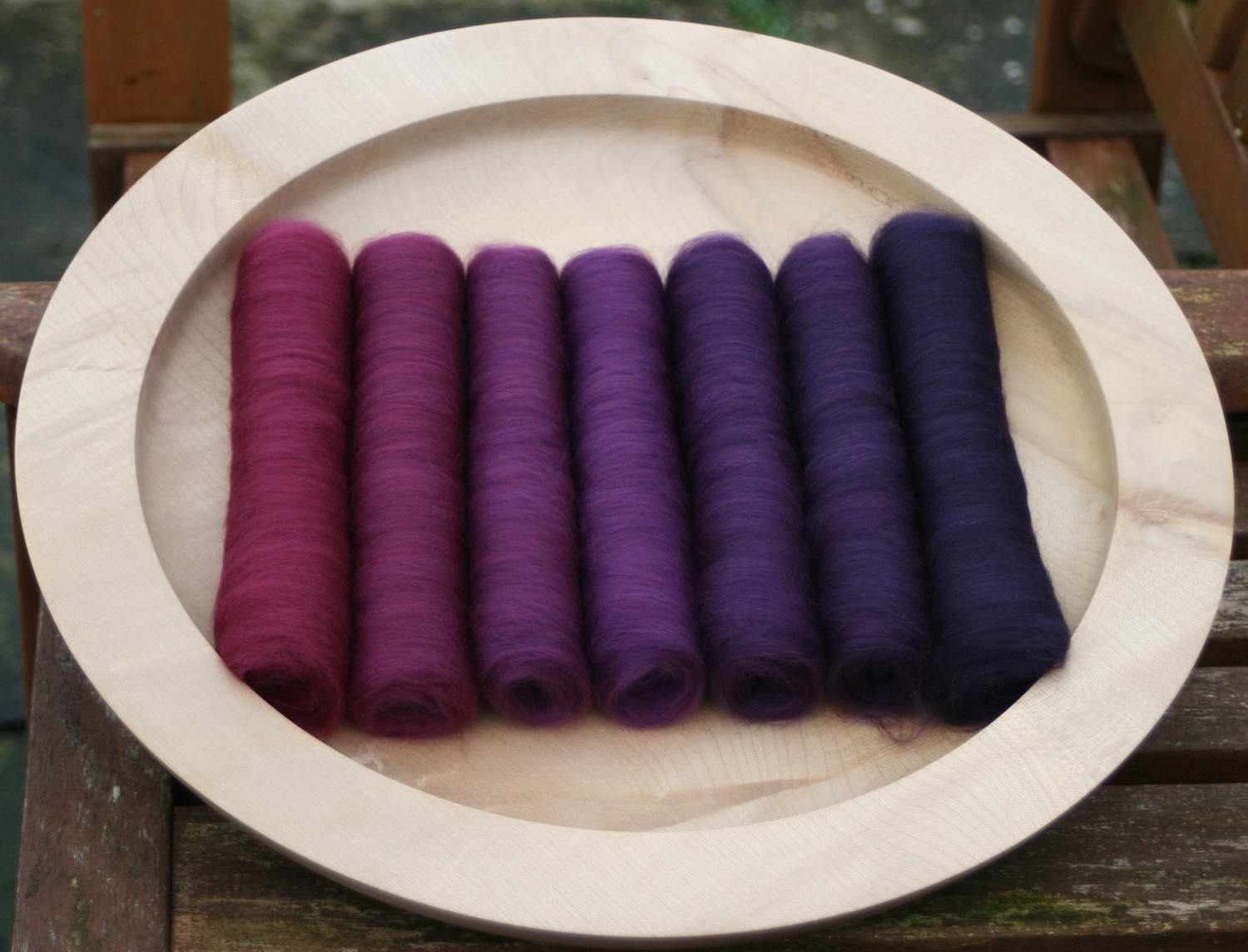 The way I spin this preparation is to unroll each batt then split each of them in half. One set I spin up in order onto a bobbin, the second set I spin in the same order onto a second bobbin. I then ply the two singles together to make a 2 ply gradient yarn.