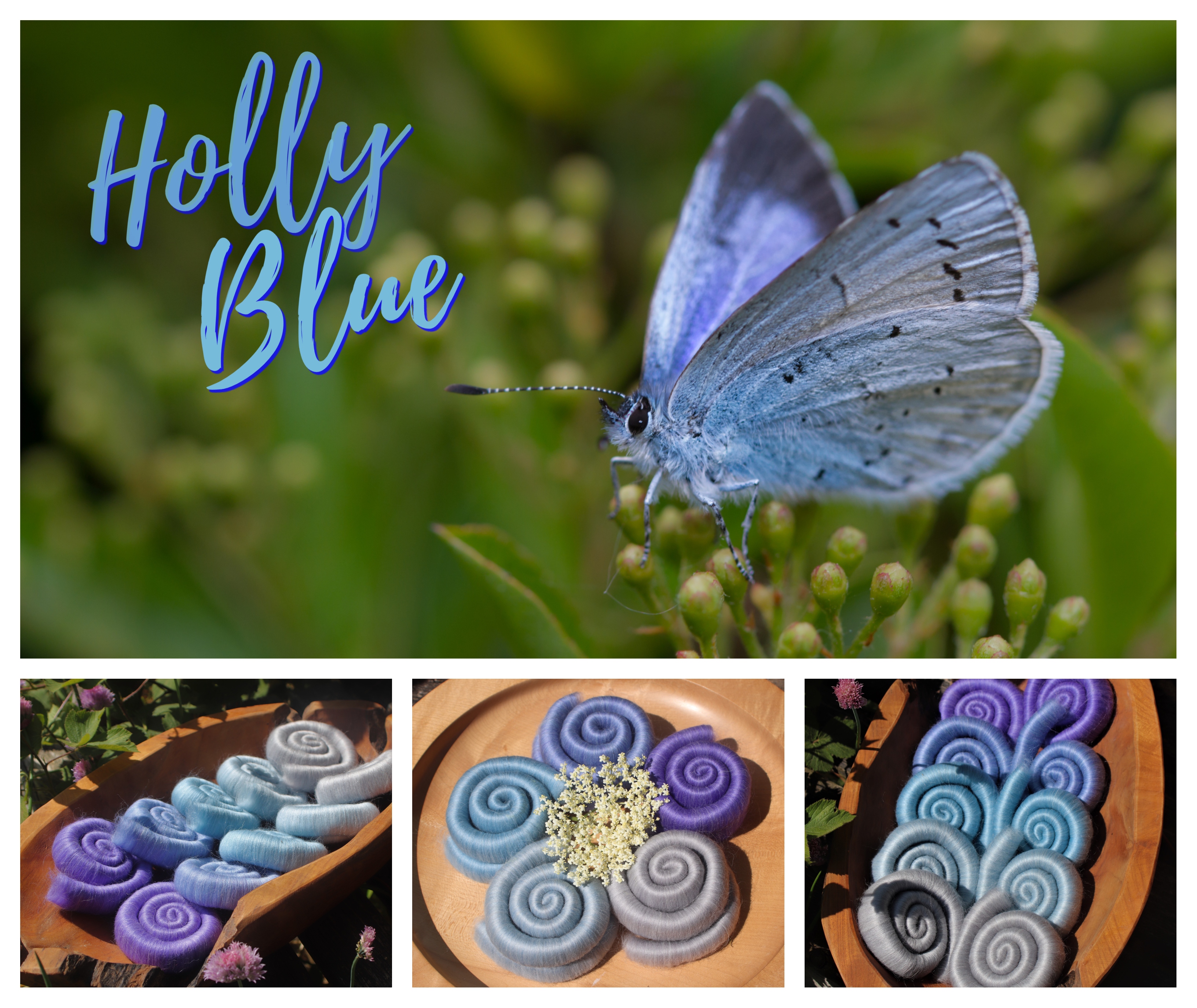 This blend was made for the 'Study in Blue' rolag club. The inspiration photograph is of a Holly Blue butterfly.