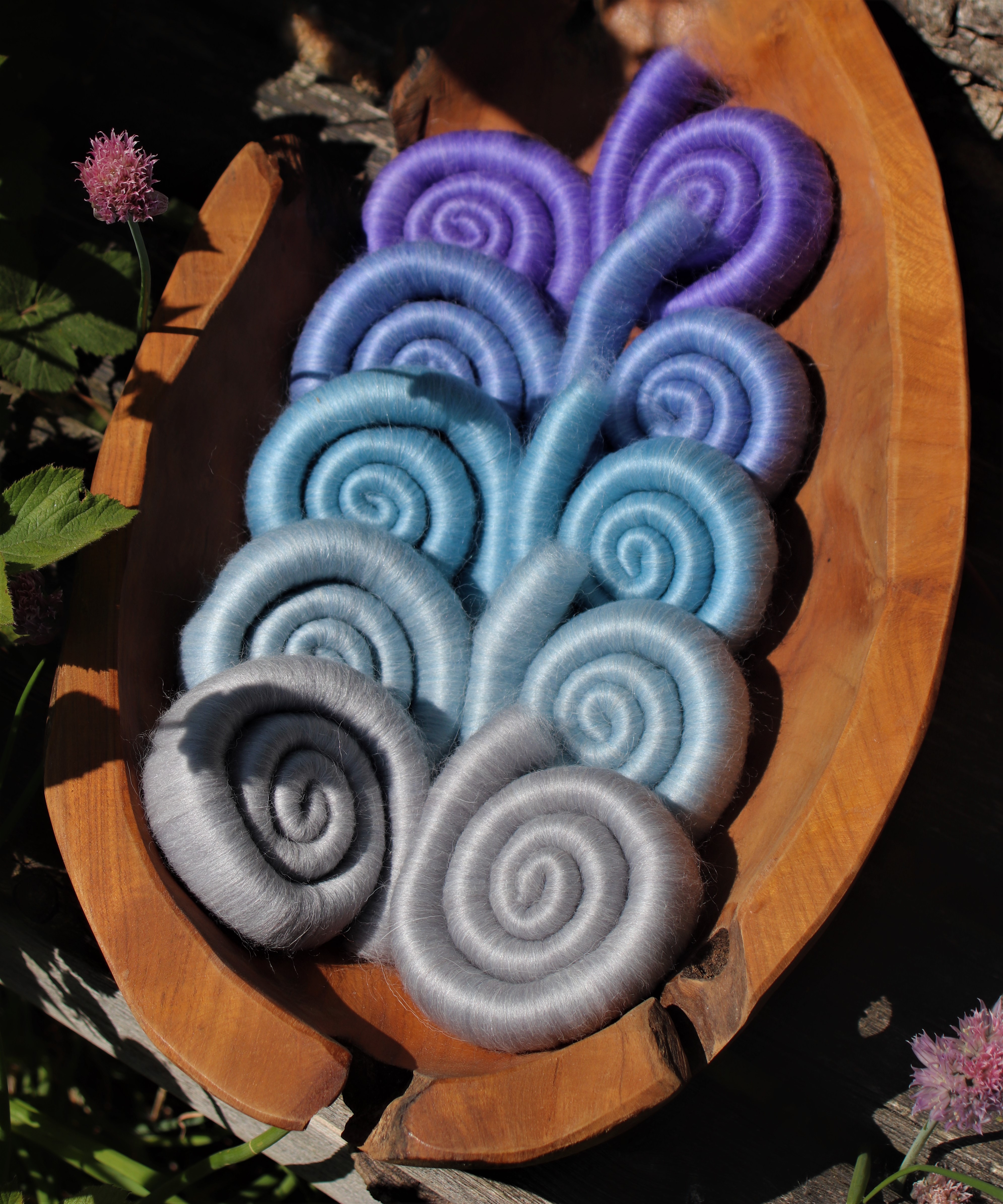 The gradient can be made up as striped rolags, a gradient rolag set - as shown in the images - that is 2 rolags of each colour OR it can be made up as batts..