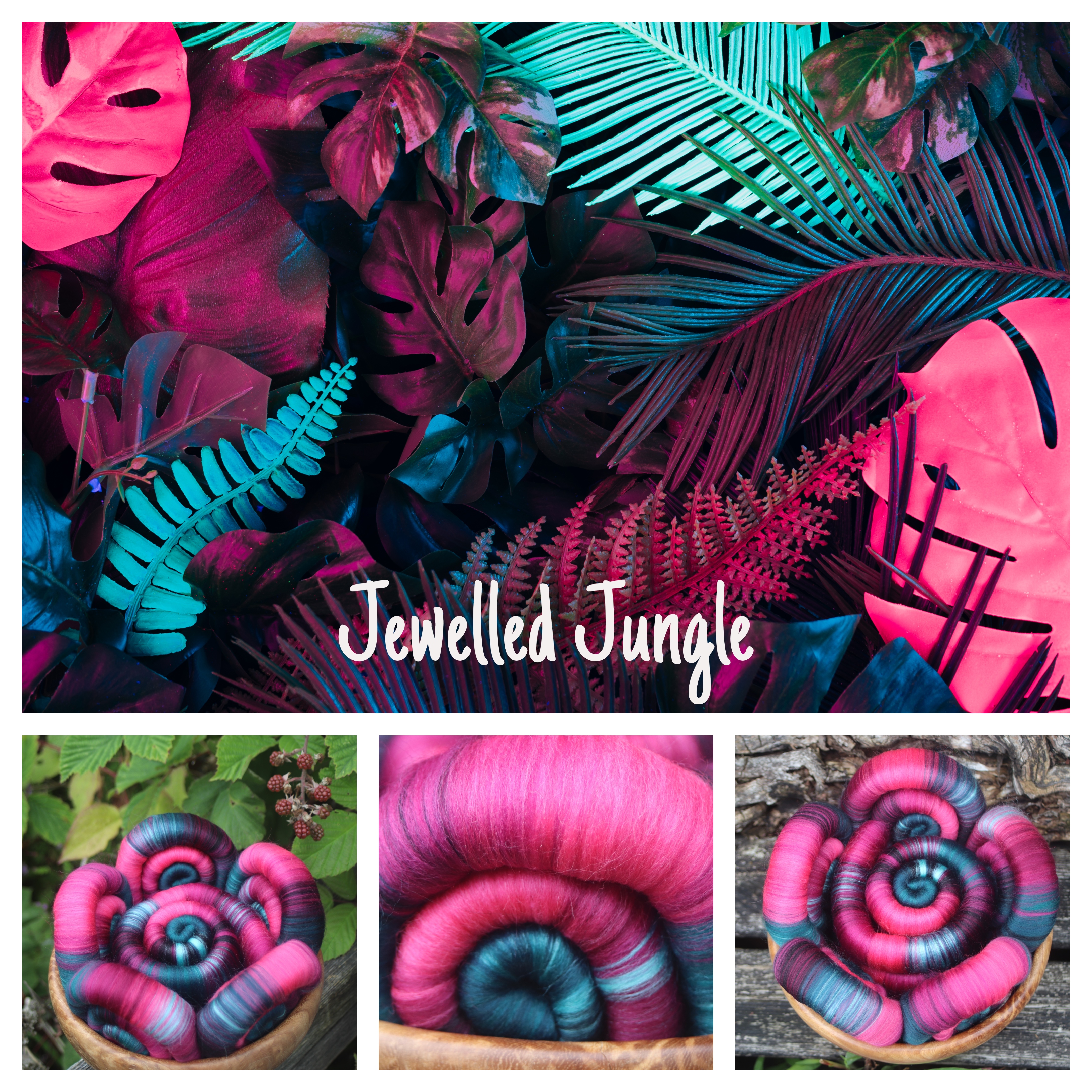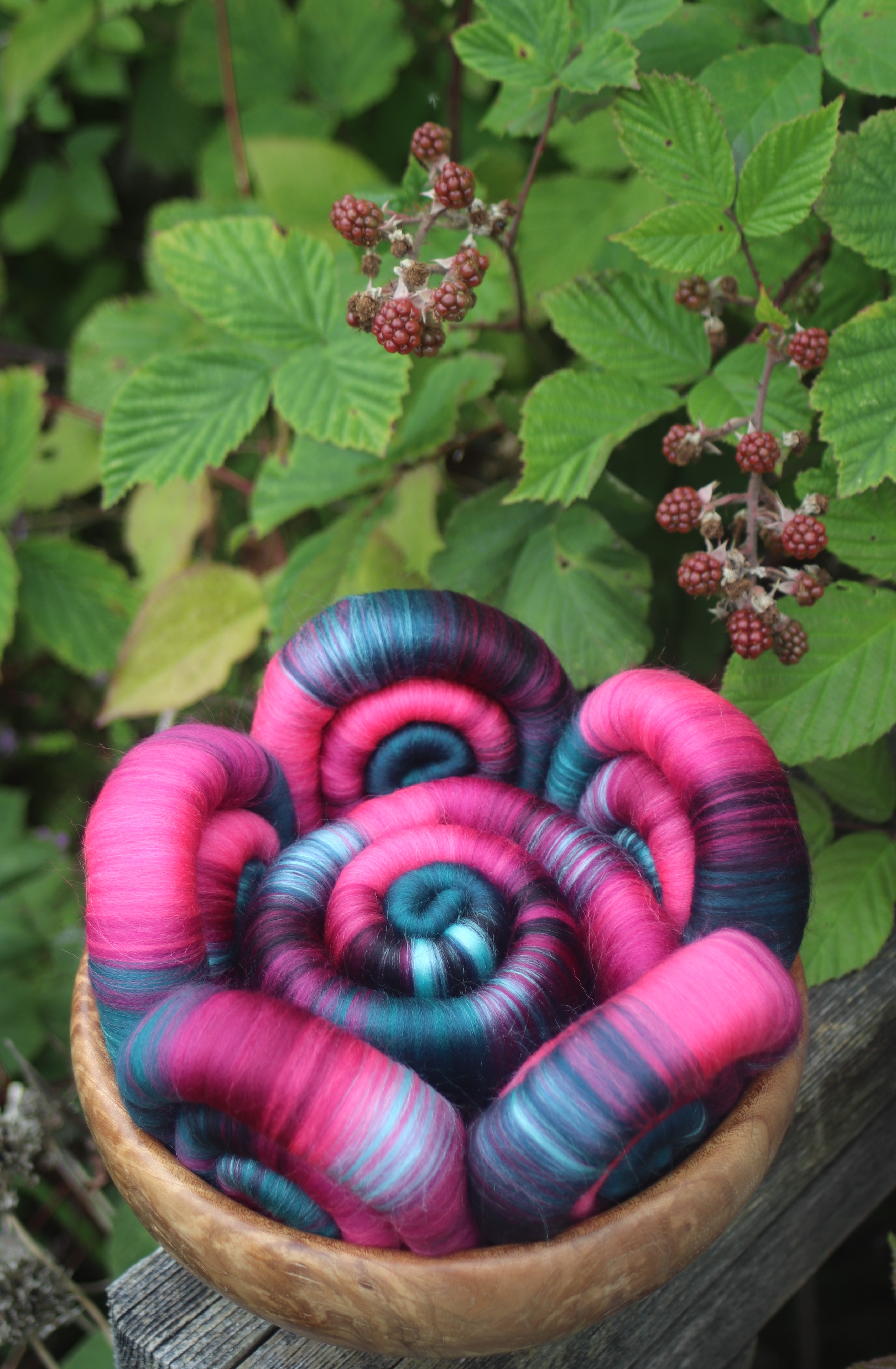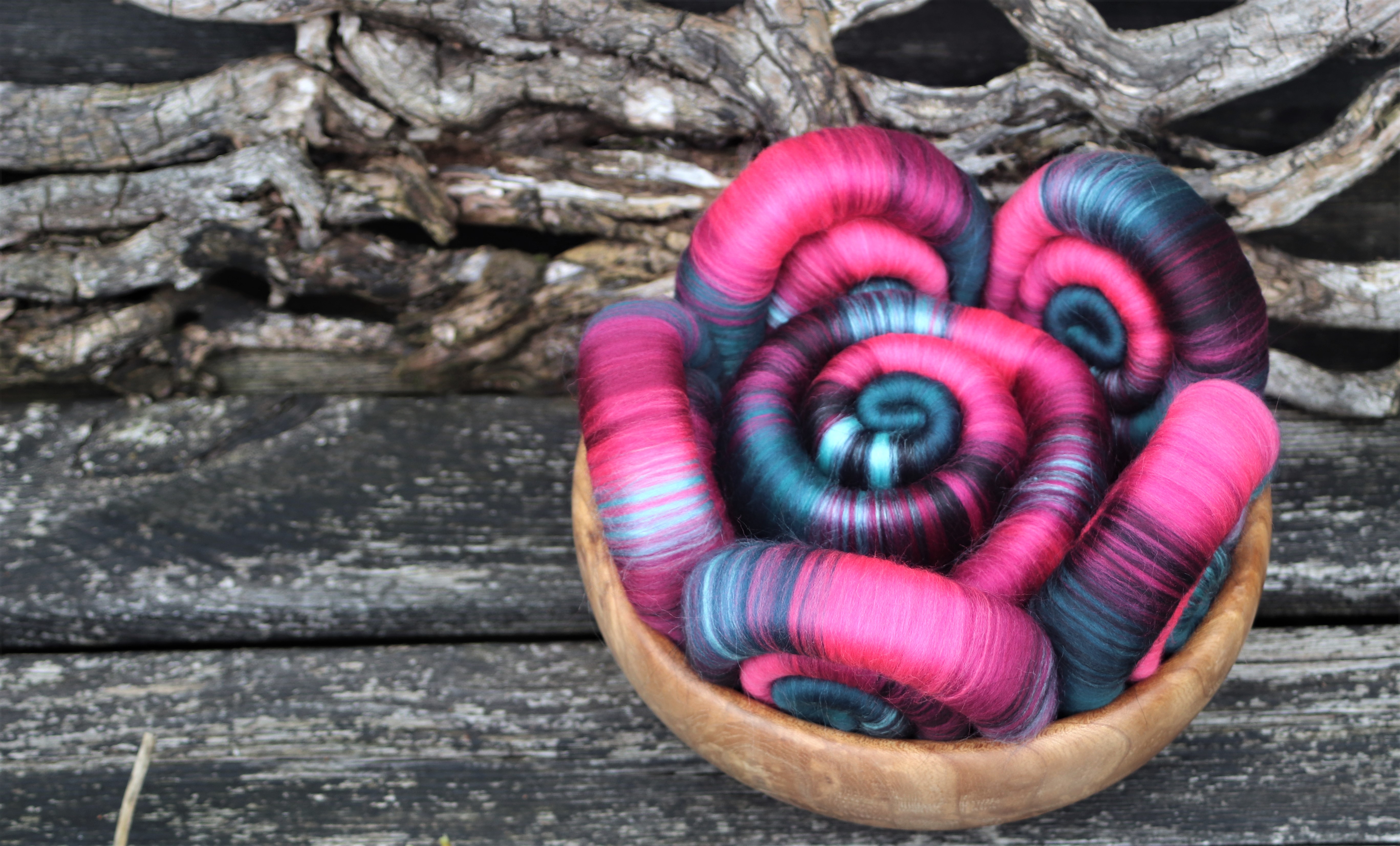 The rolags are made up of 21 micron merino in shades of bright pink, magenta and burgundy, interspersed with shades of jade and petrol. There is also black baby llama and lashings of mint/turquoise tussah silk.