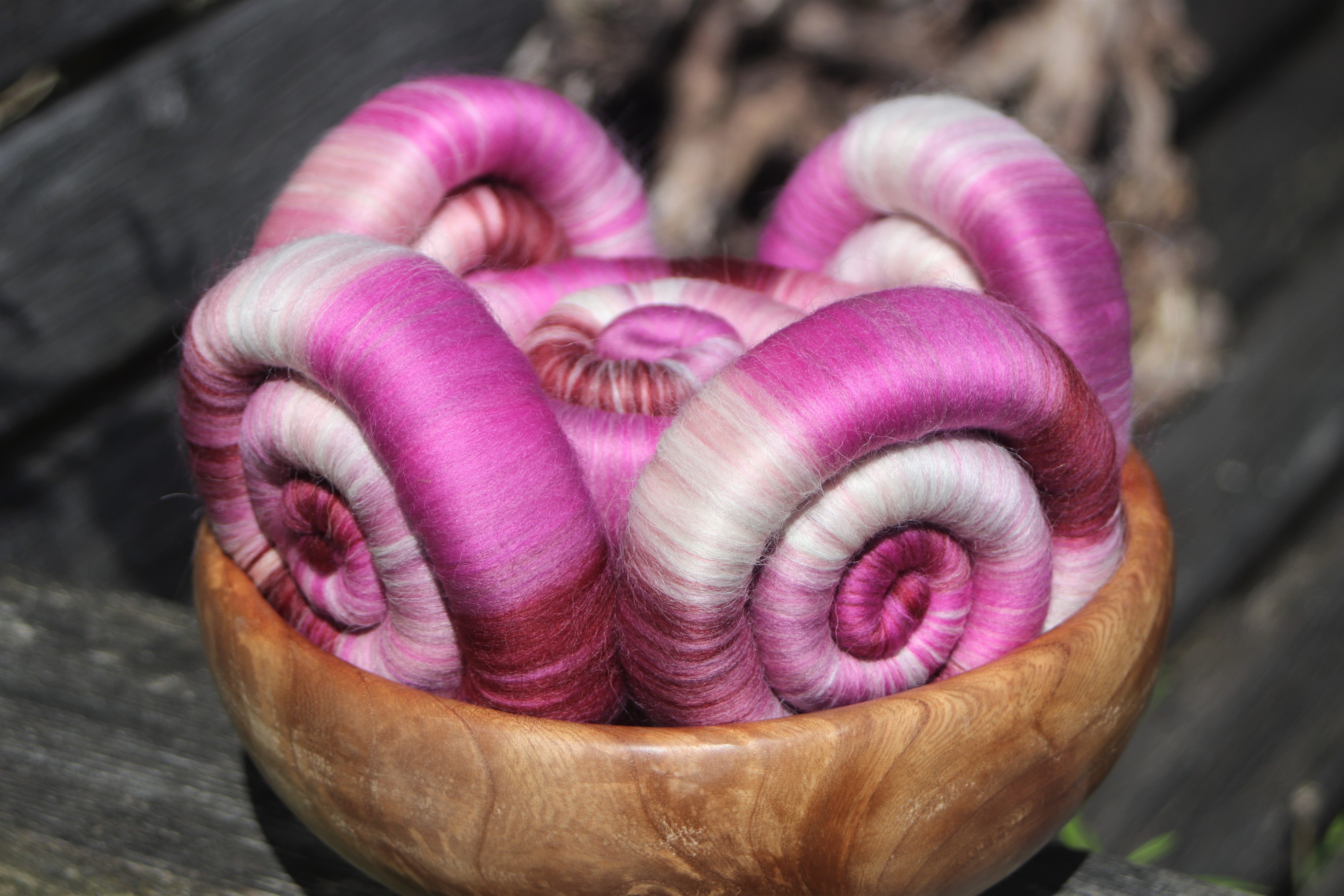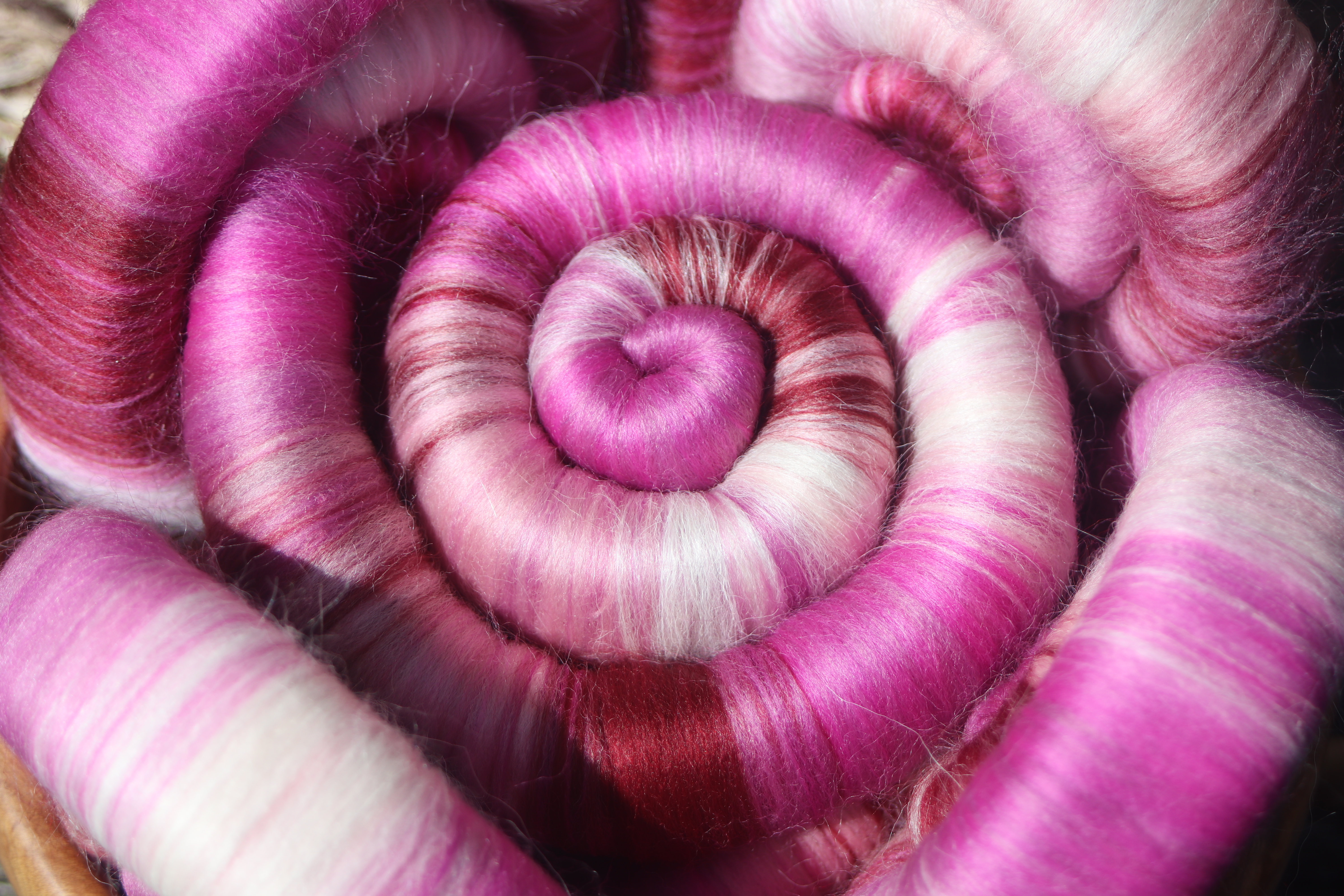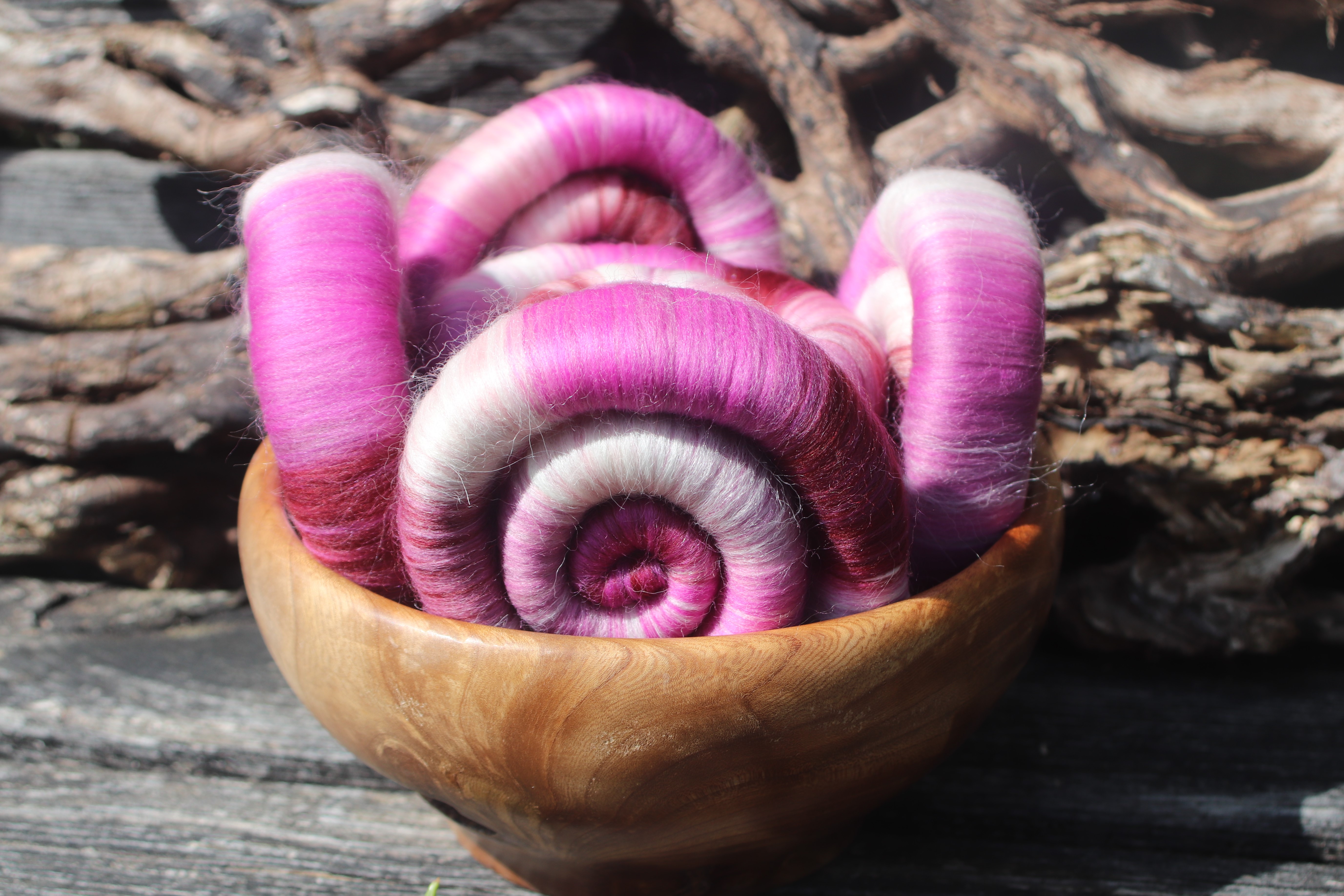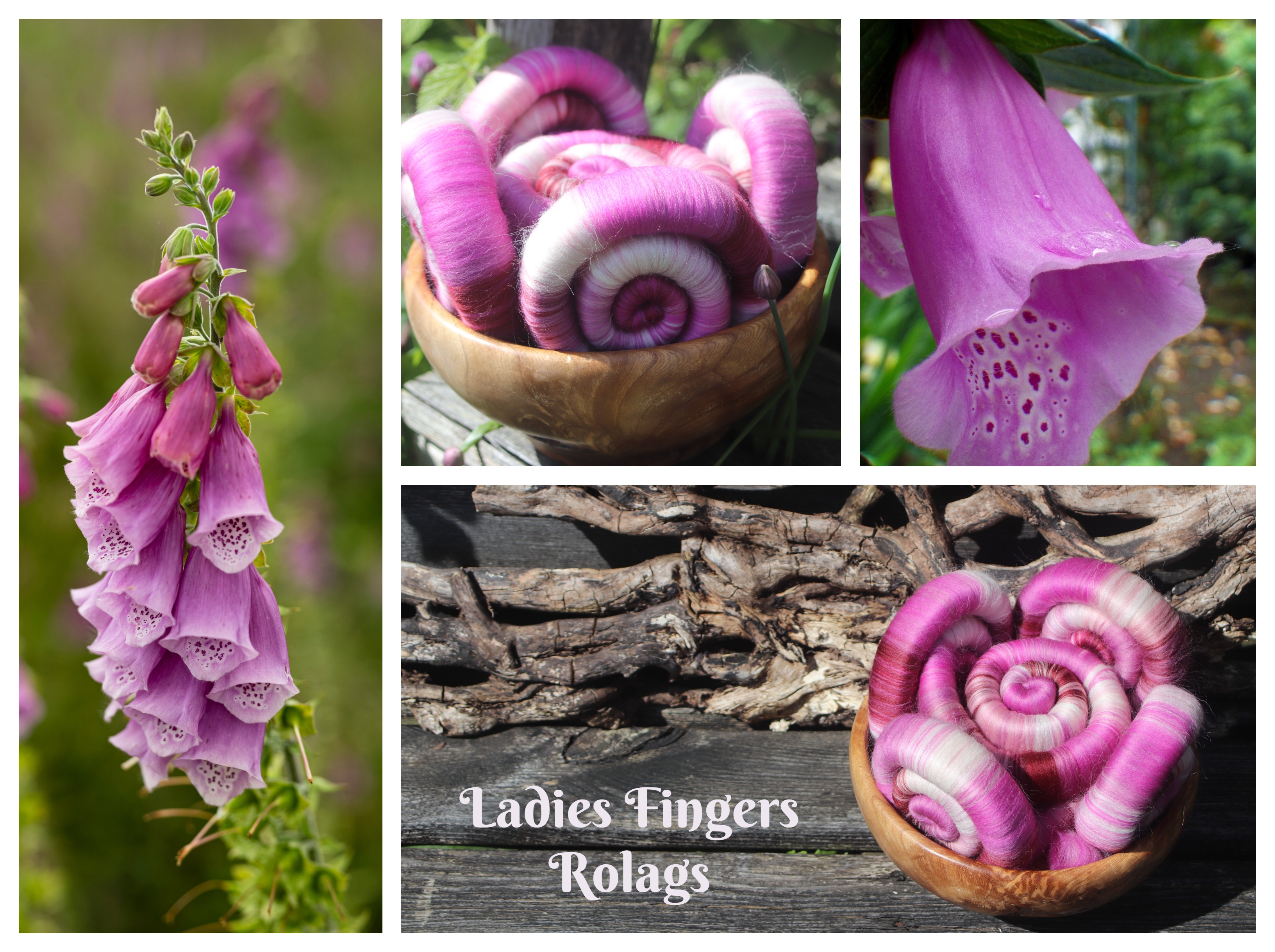 These foxglove inspired rolags are made with 21 micron merino and baby llama. I added baby llama to the blend, to give the resulting yarn a soft halo - just like the inside of the foxglove