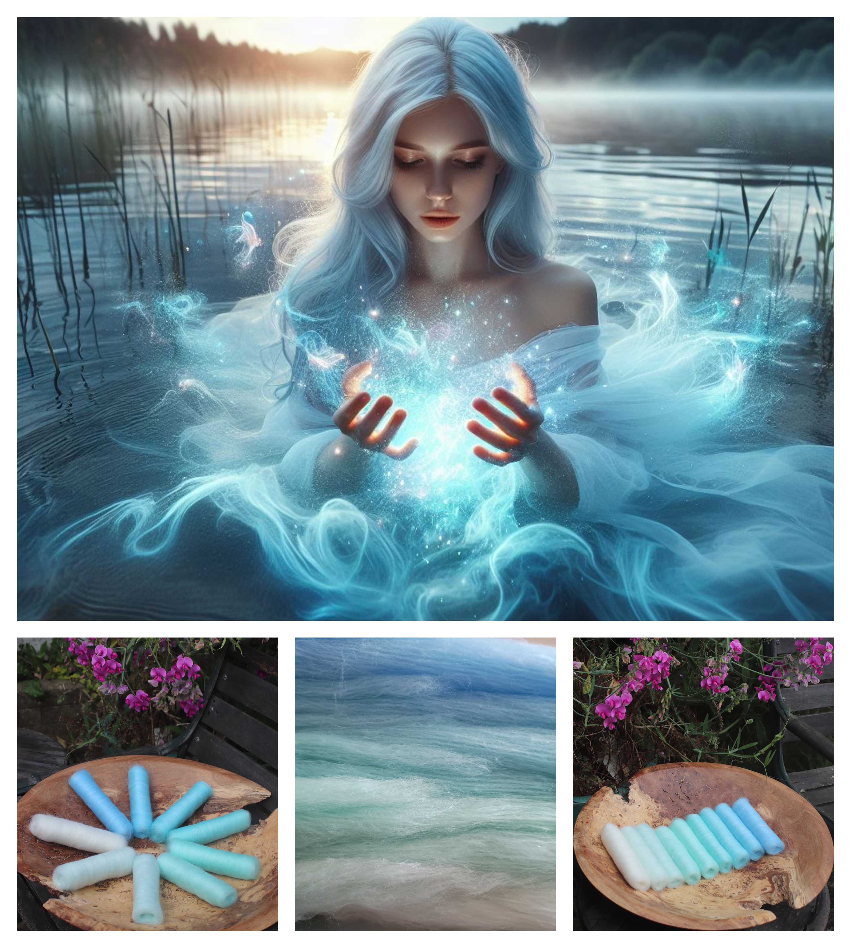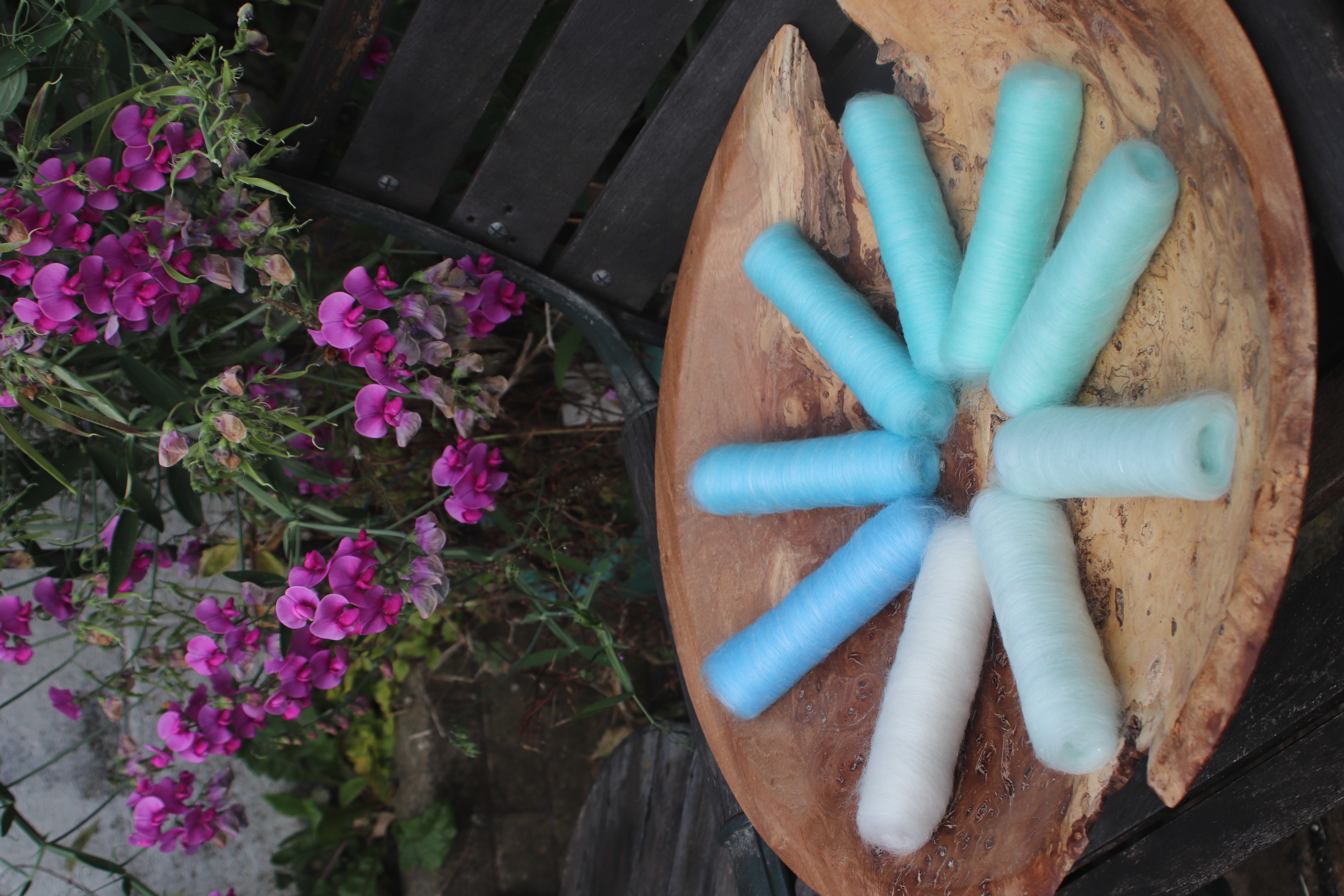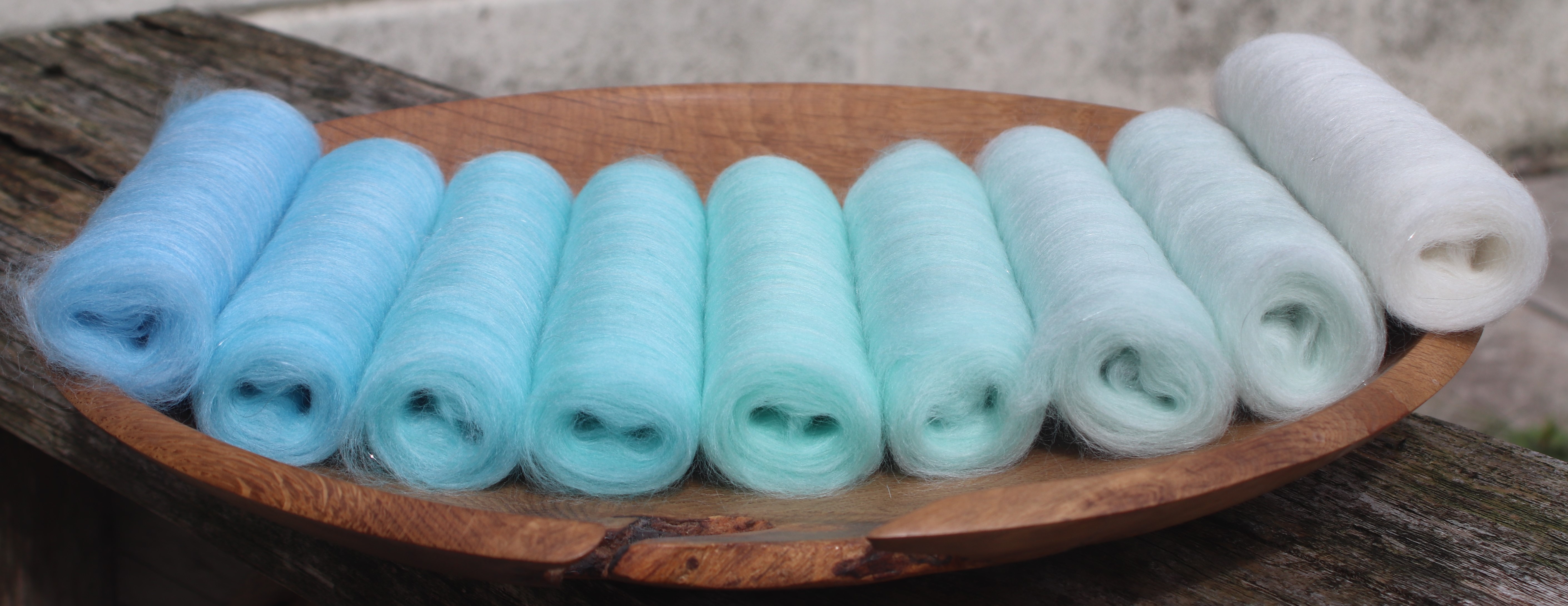The gradient is made of 21 micron merino, carefully blended with Pearl fibre and Angelina.