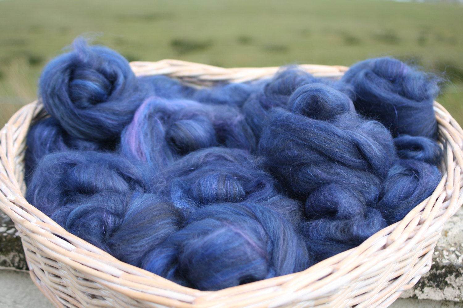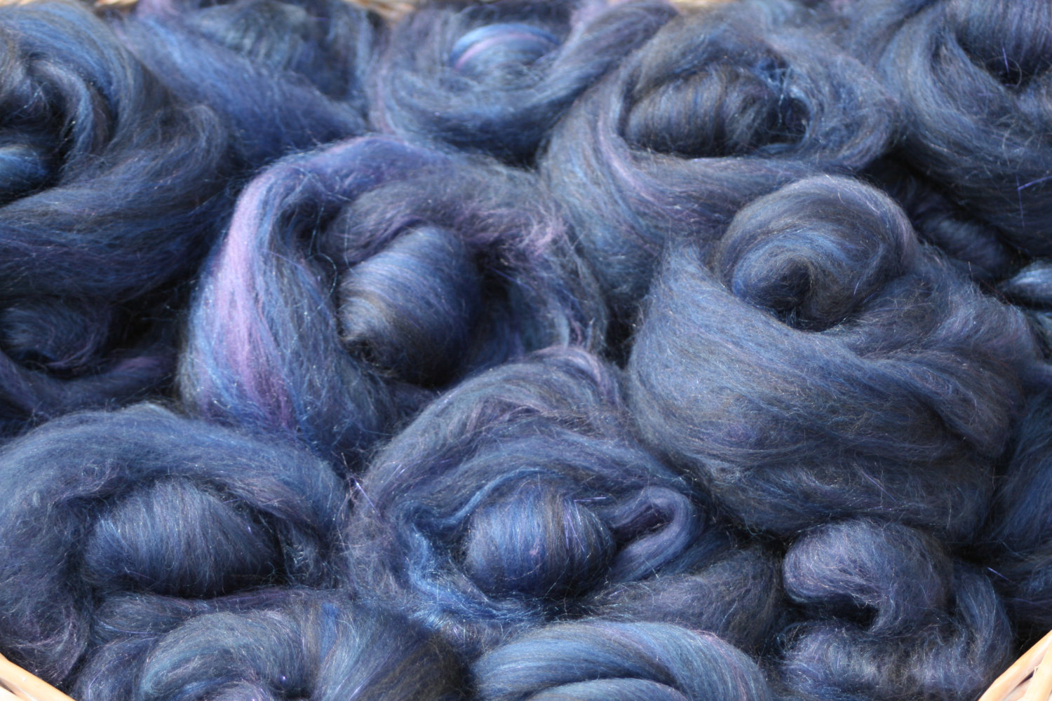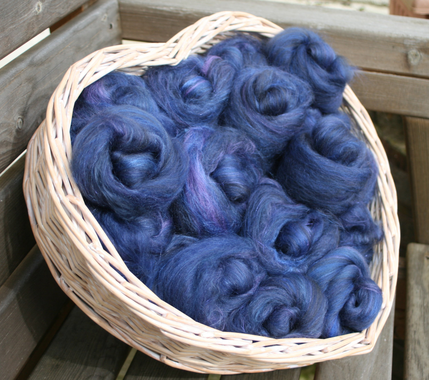 I took soft merino fibres in shades of dark gey and blues and blended them with blue and purple shades of tussah silk and Angelina.