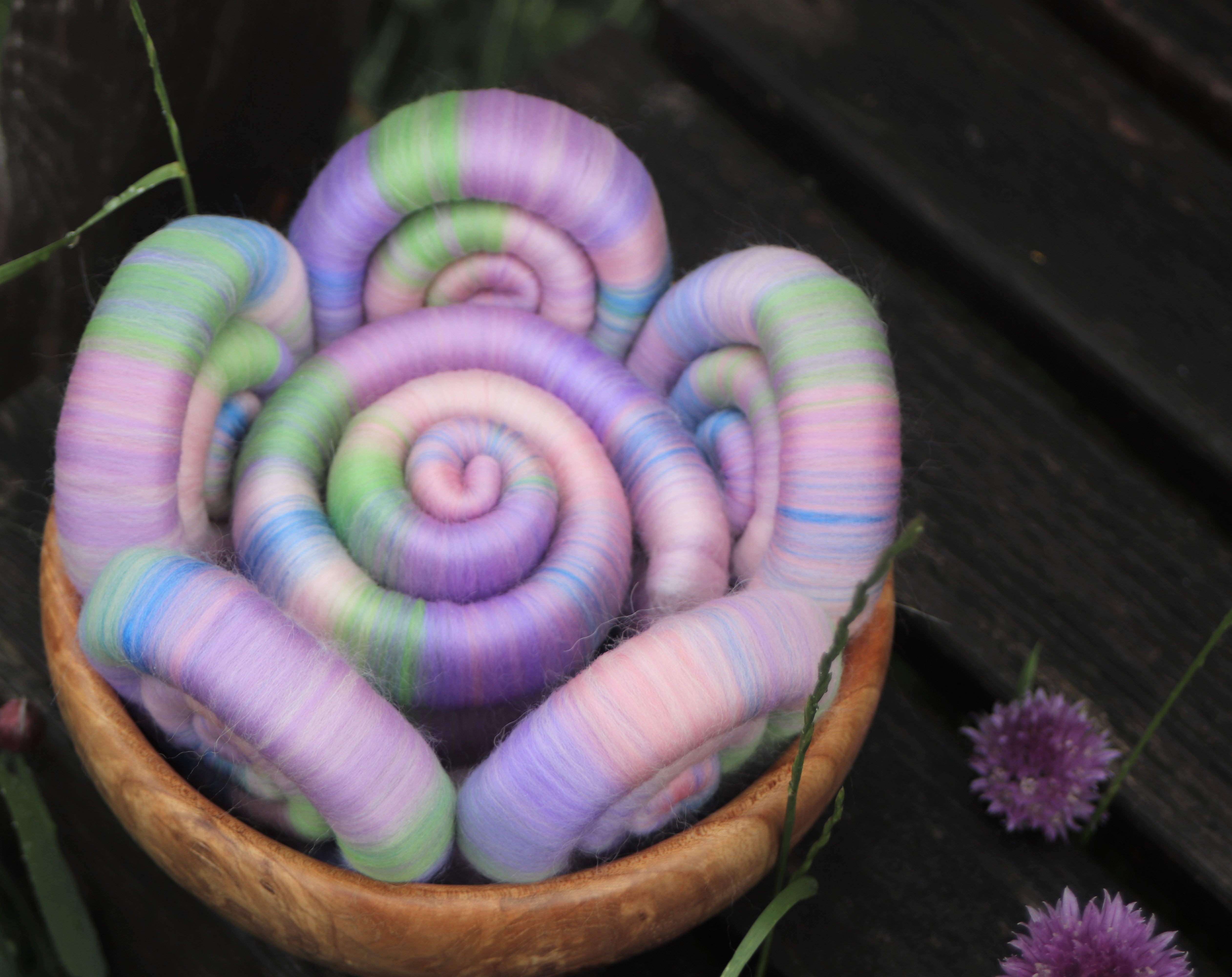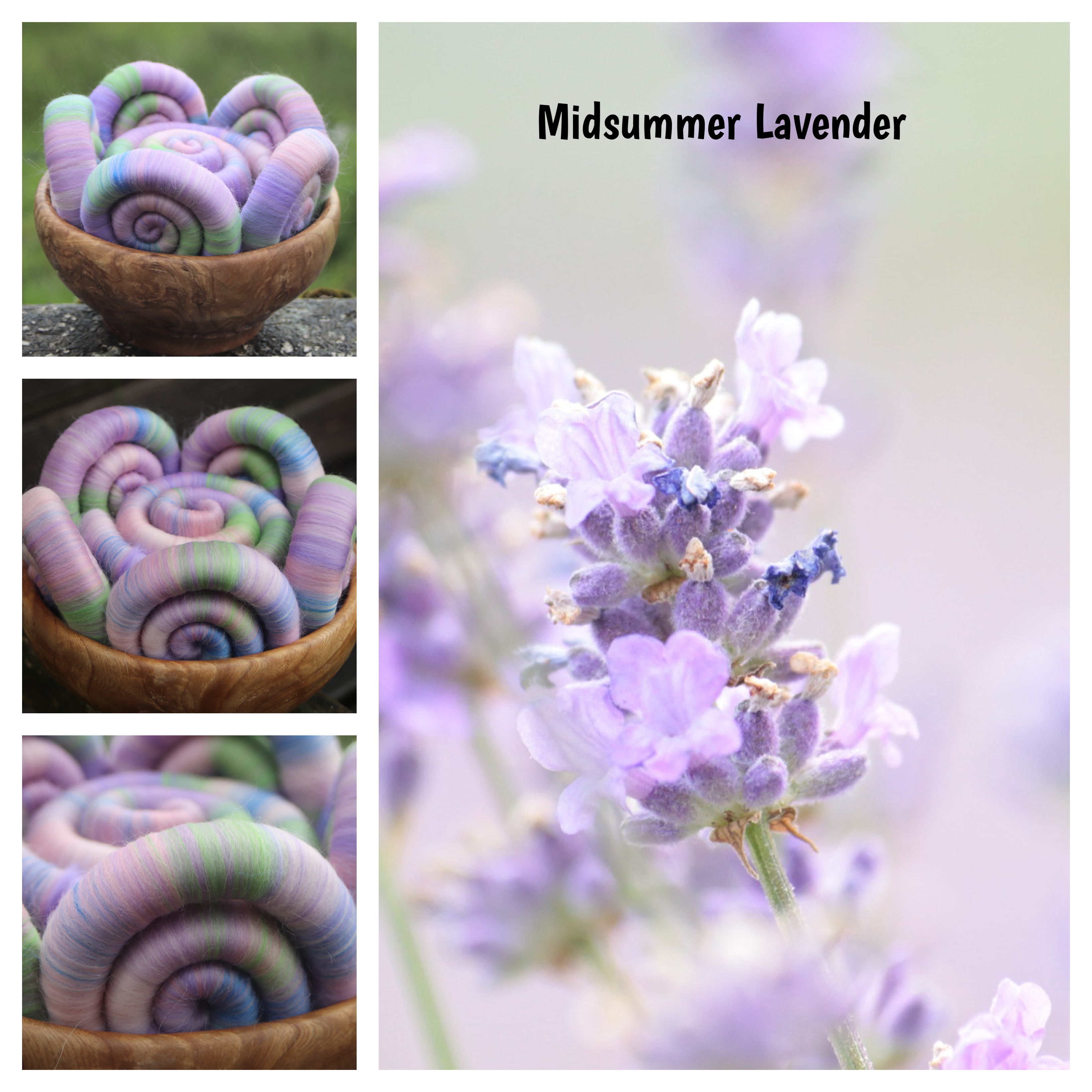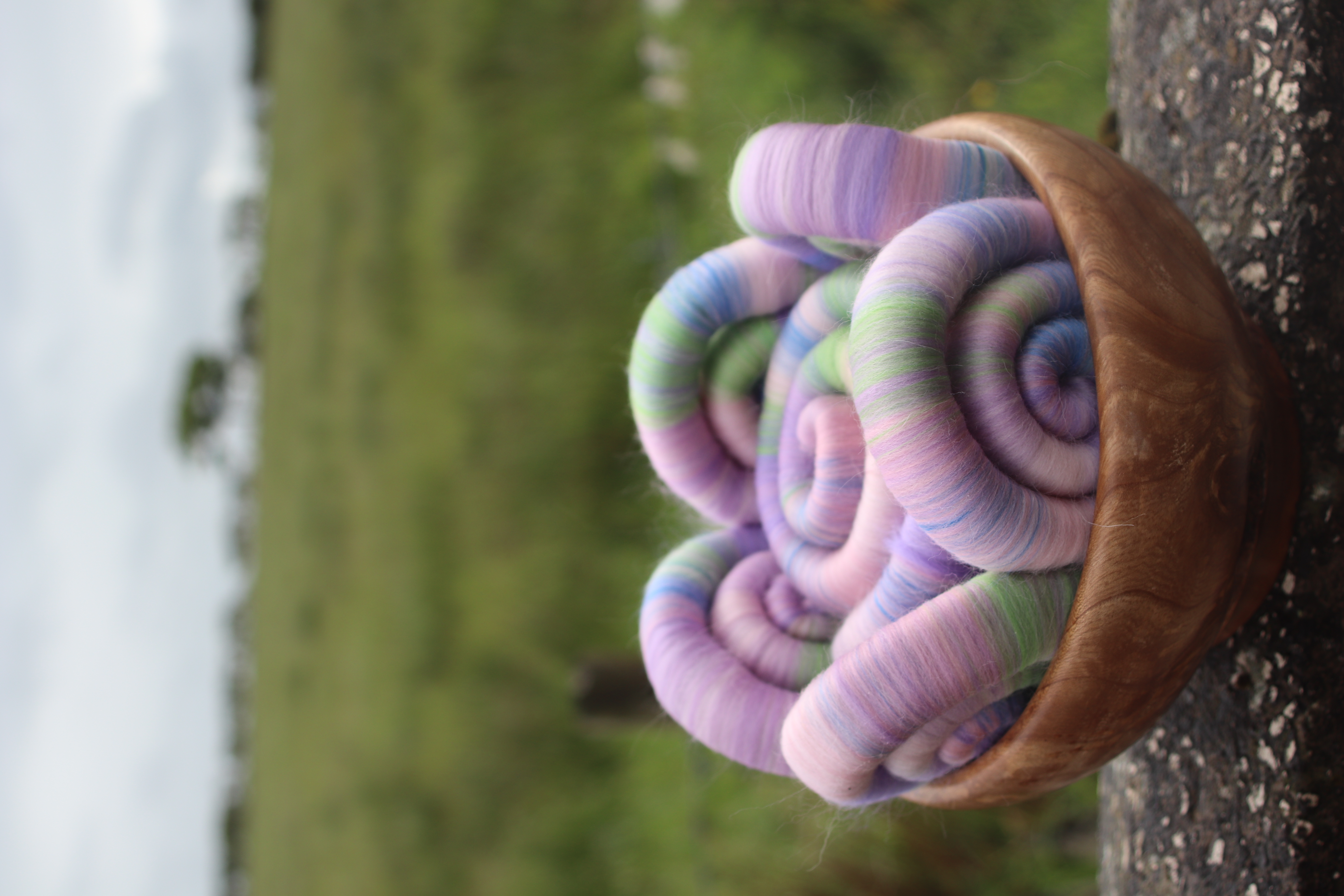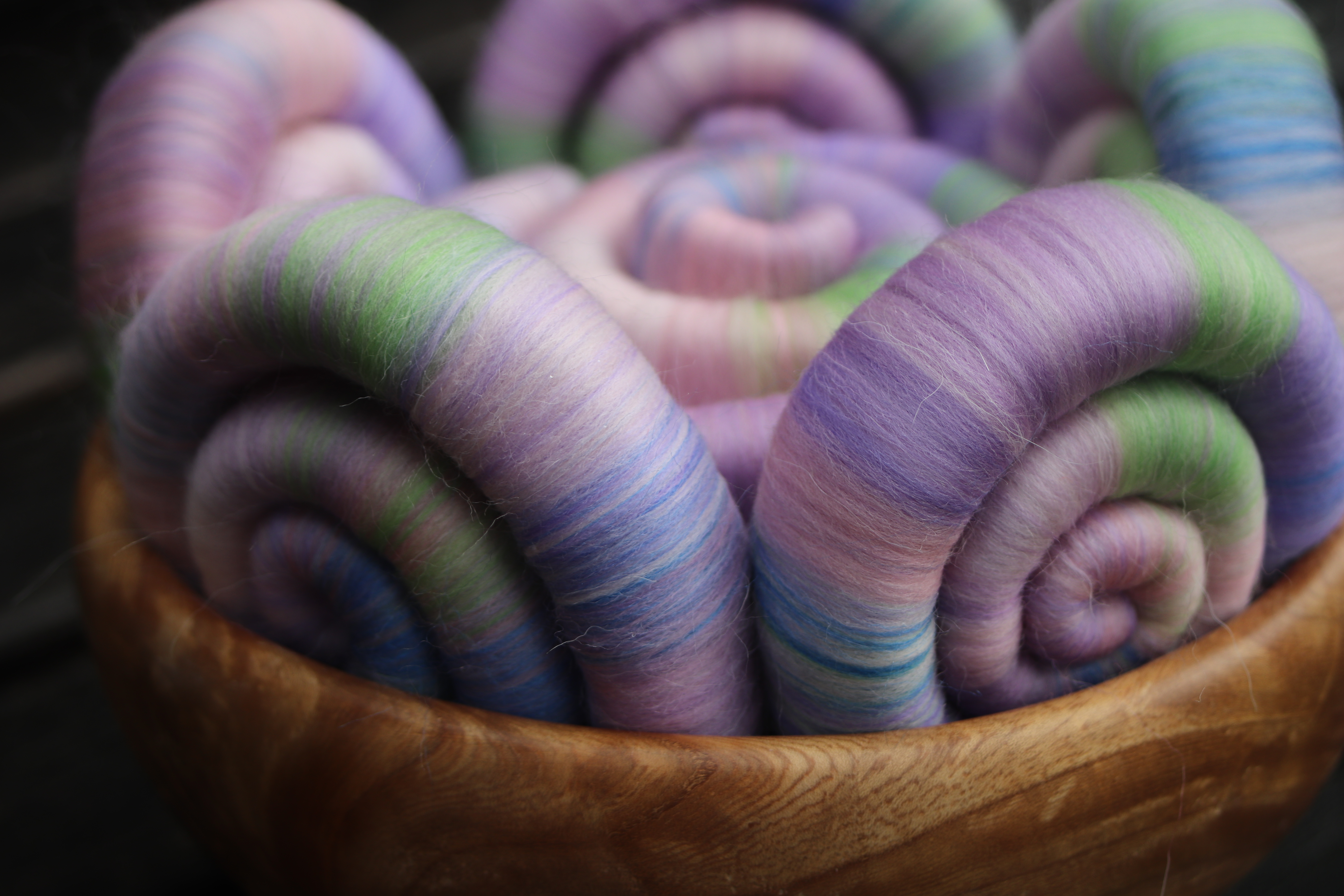 The blend is made from merino in soft sades of pink, lilac and lavender, with two fine layers of baby llama, and a touch of blue tussah silk added to the mix. I added the thin layers of baby llama to the rolags, because I wanted to add a slight misty halo to be seen in the spin fibre, to link to the soft misty halo in the photograph. The baby llama is also deliciously soft too :-)