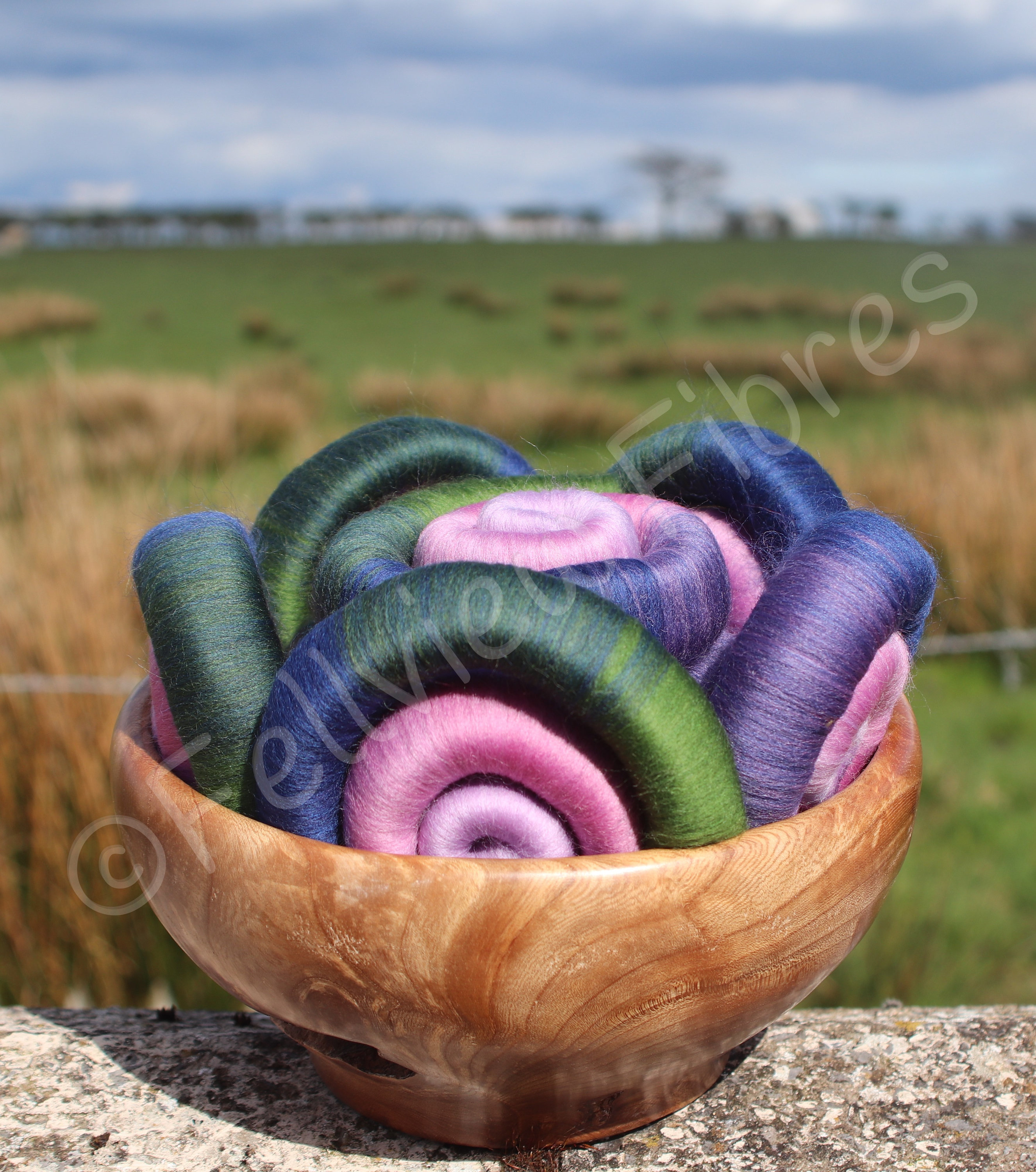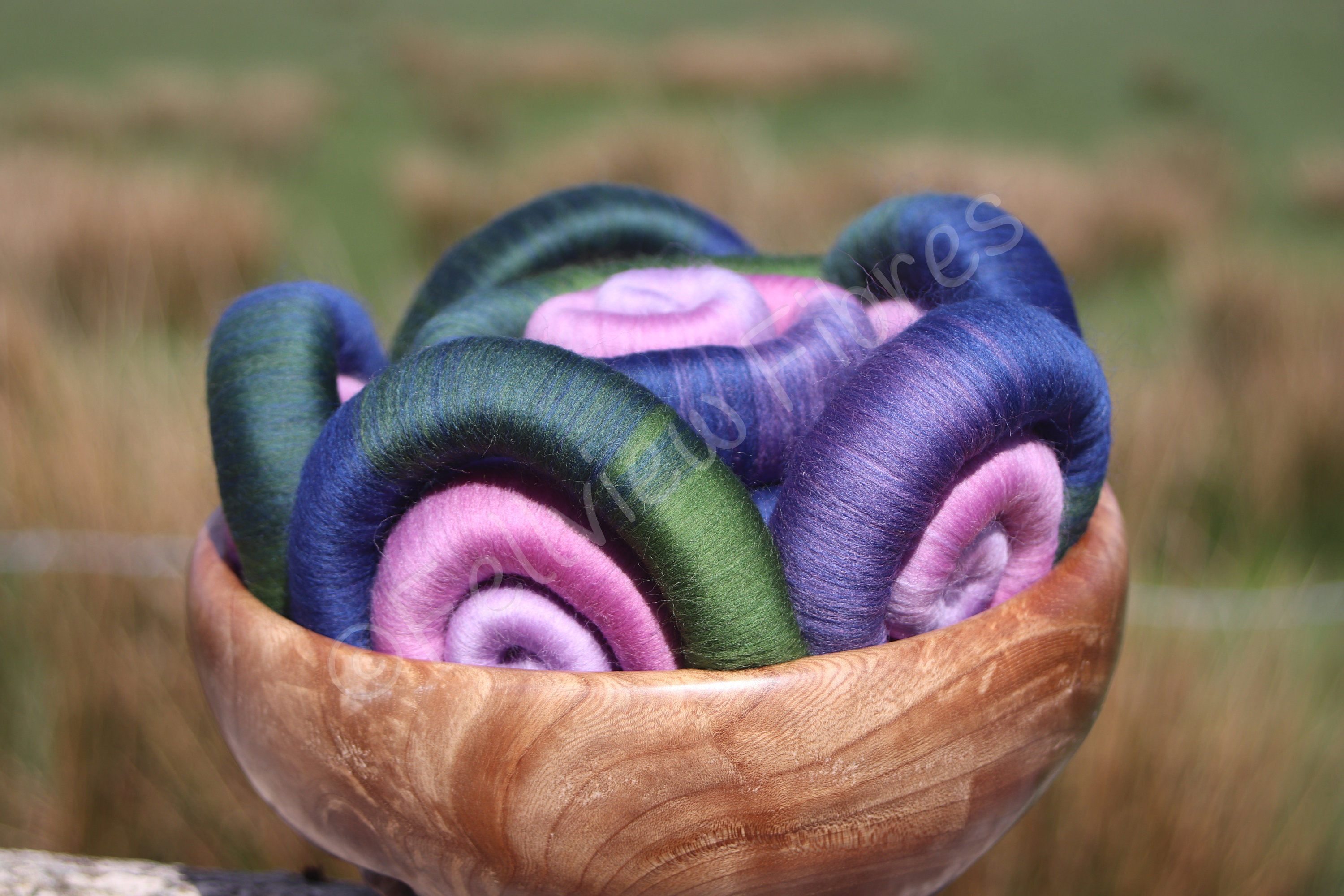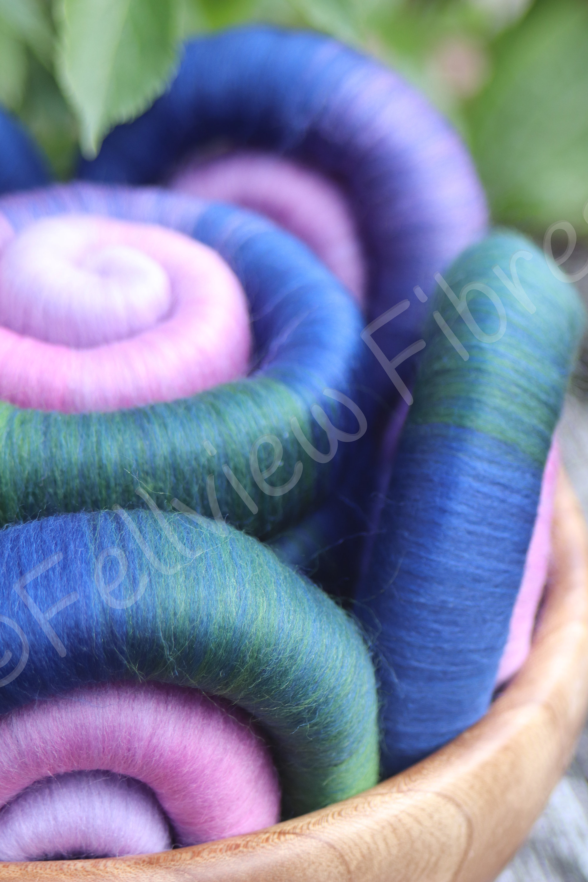 Each rolag is made by carefully blending 7 colours of soft, 21 micron merino. These blended fibres were then placed onto a blending board to form a gradient moving from a light pink lilac to a deep, rich green, moving through pinks and deep blues in the process.