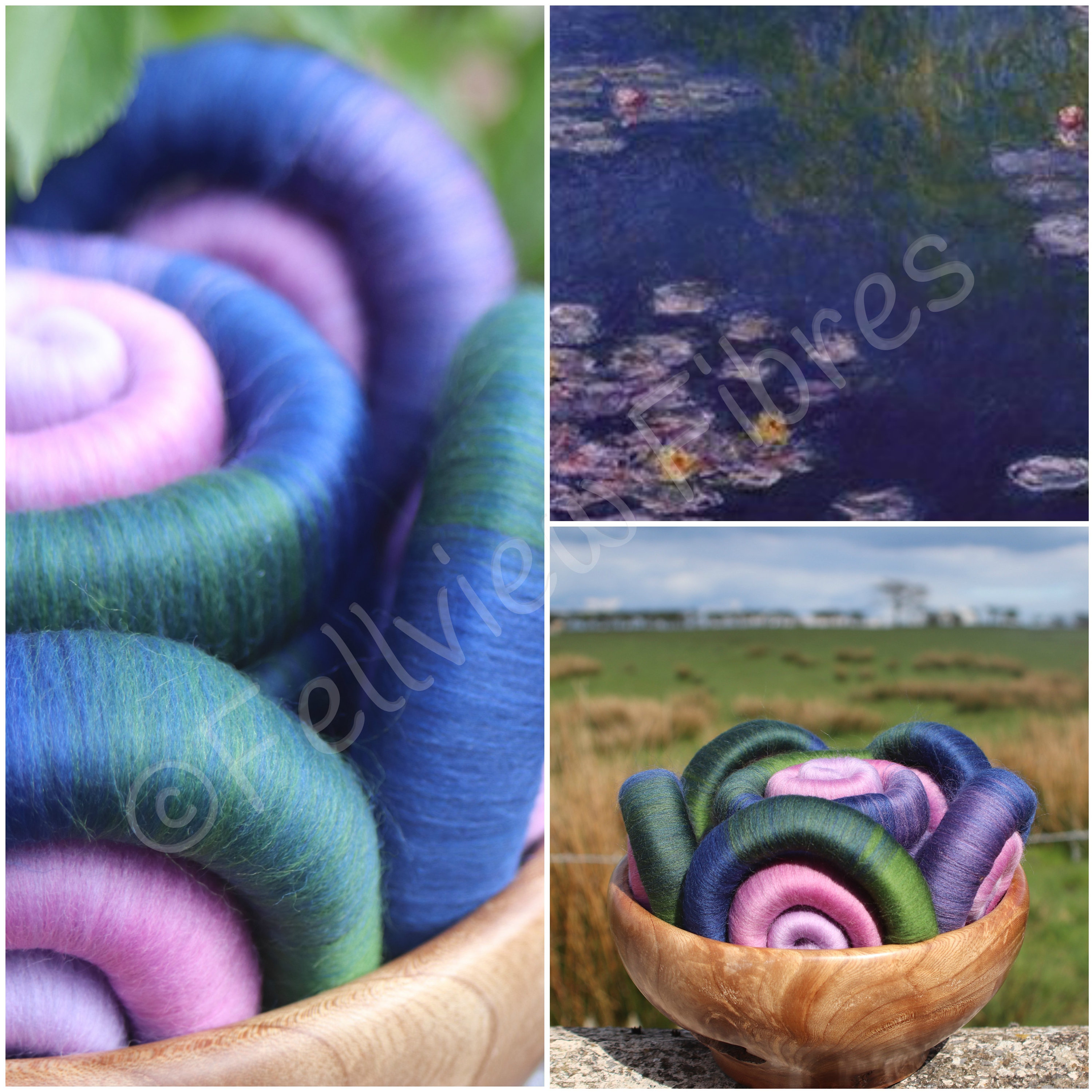 Monet spent the final three decades of his life painting over 100 paintings of water lilies. I have taken the colour palette for this painting and converted it into a gradient rolag.