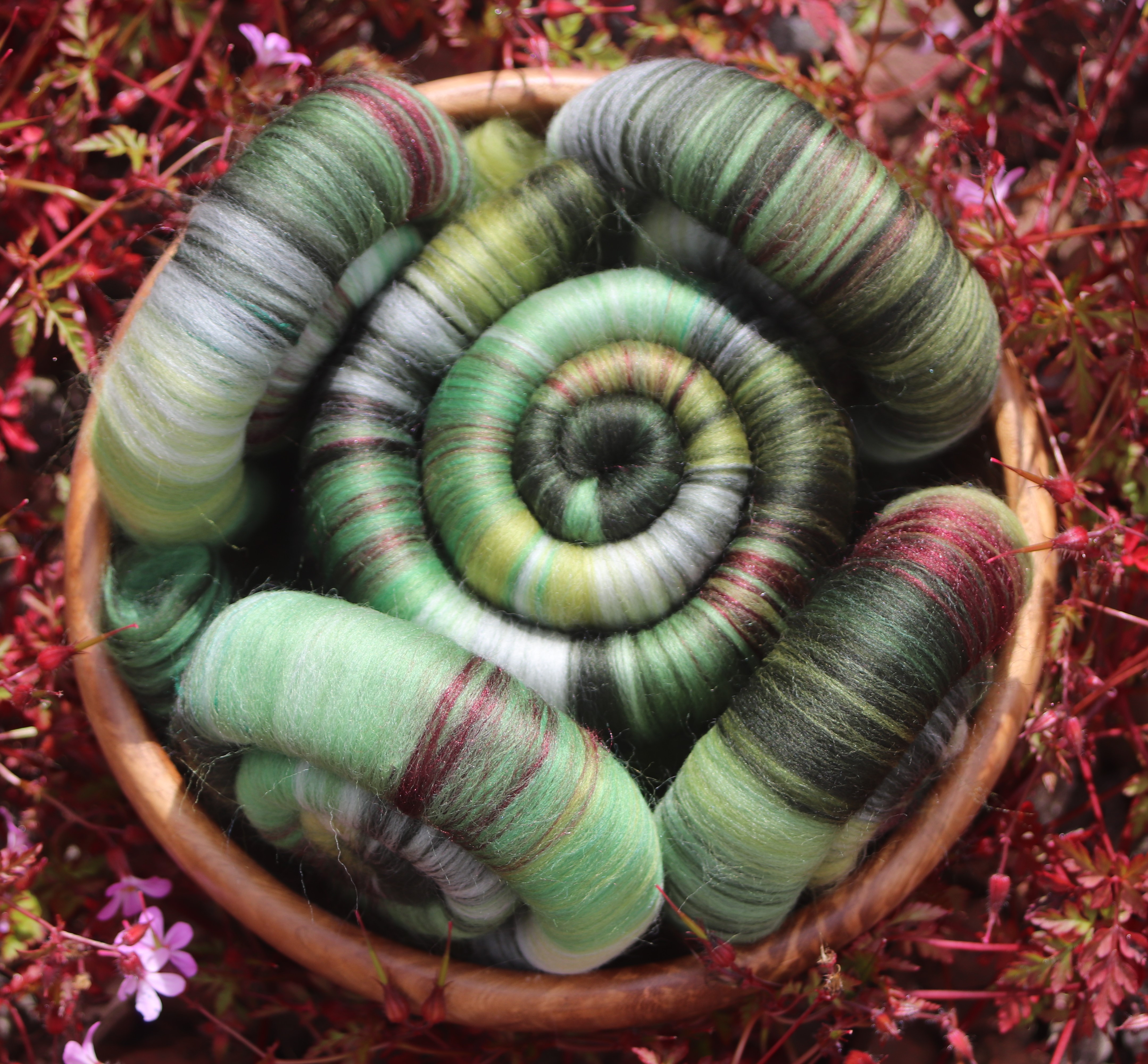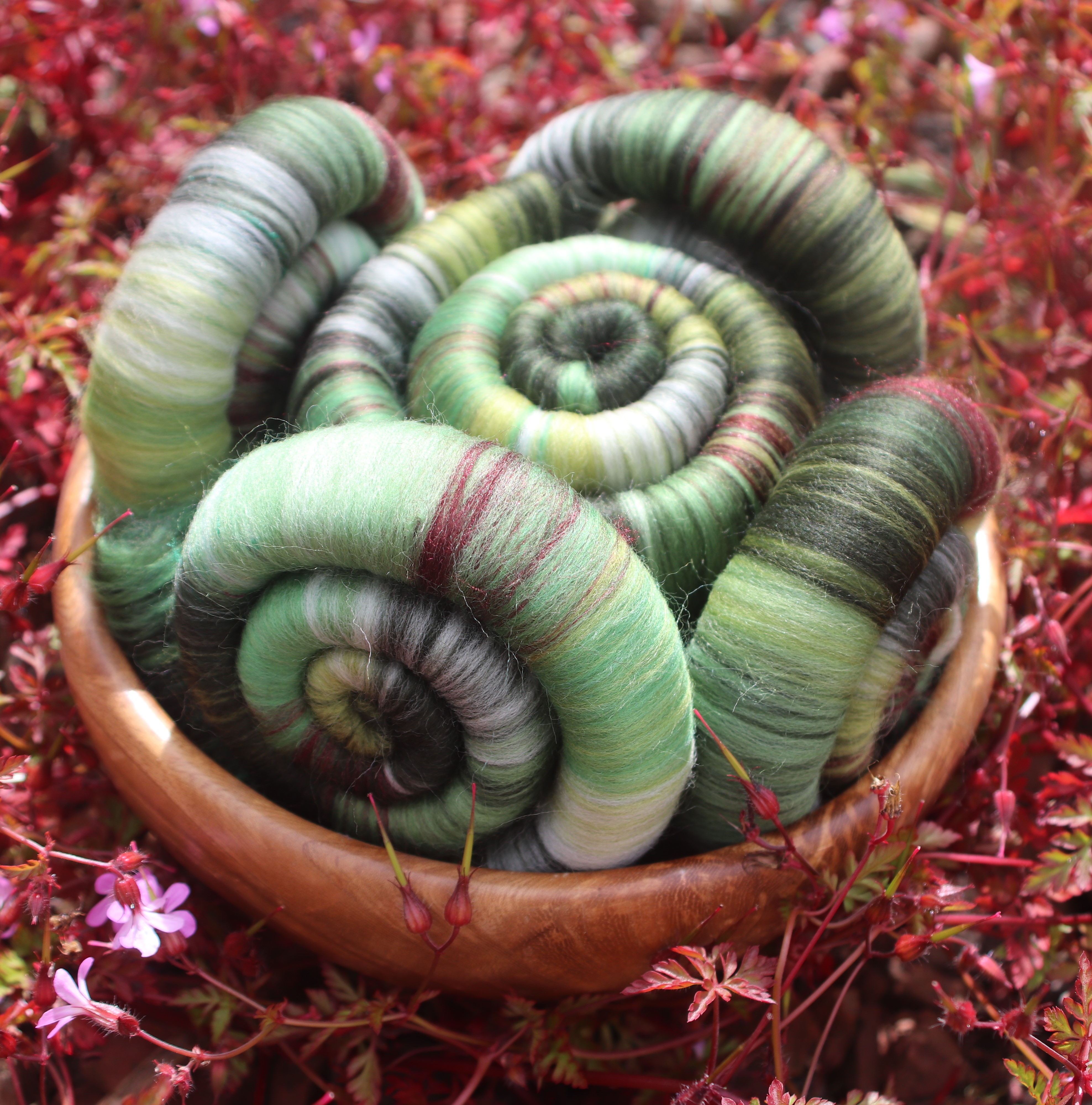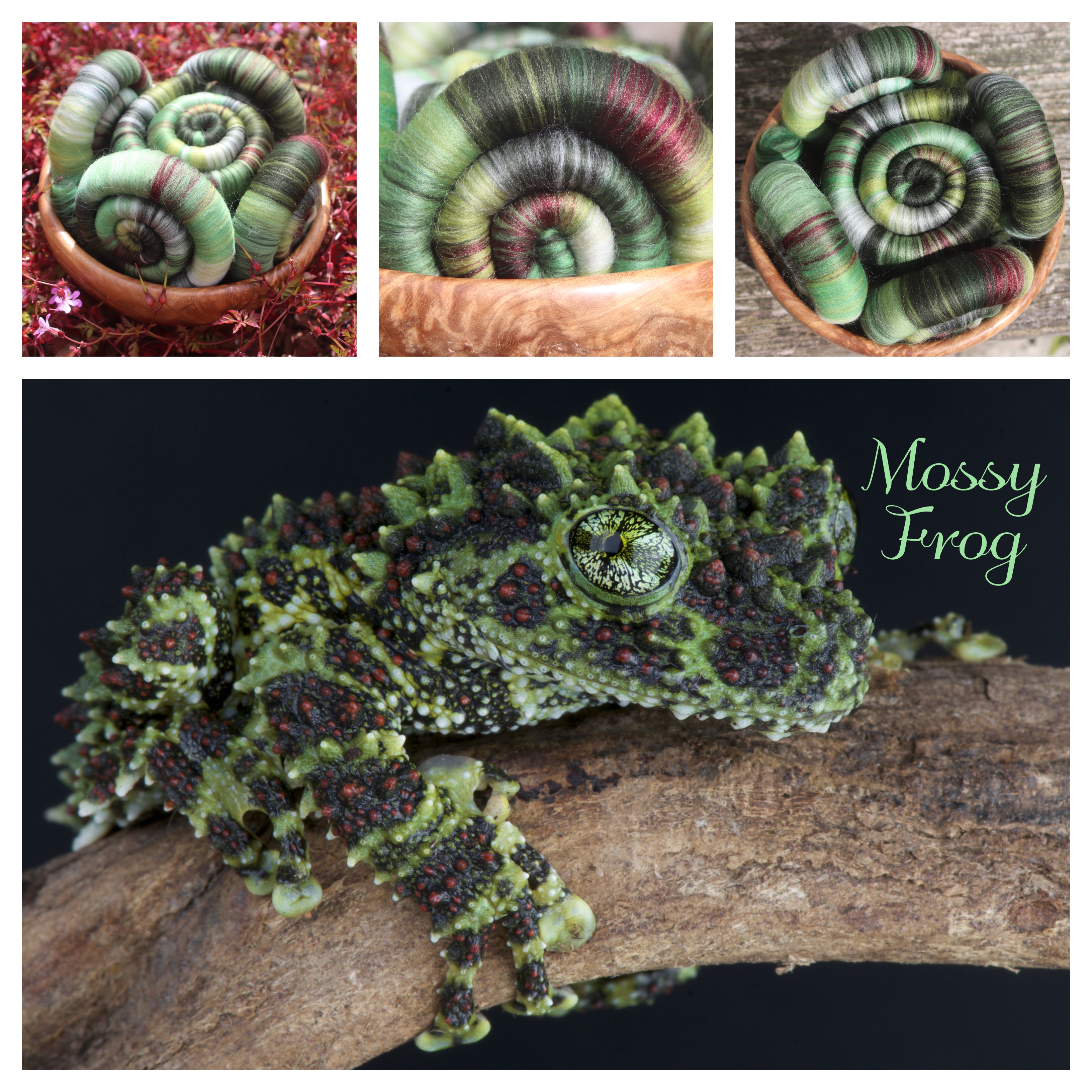These rolags were designed for the 'Beauty of the Beastly' themed box. The colourways was inspired by the Mossy Frog.