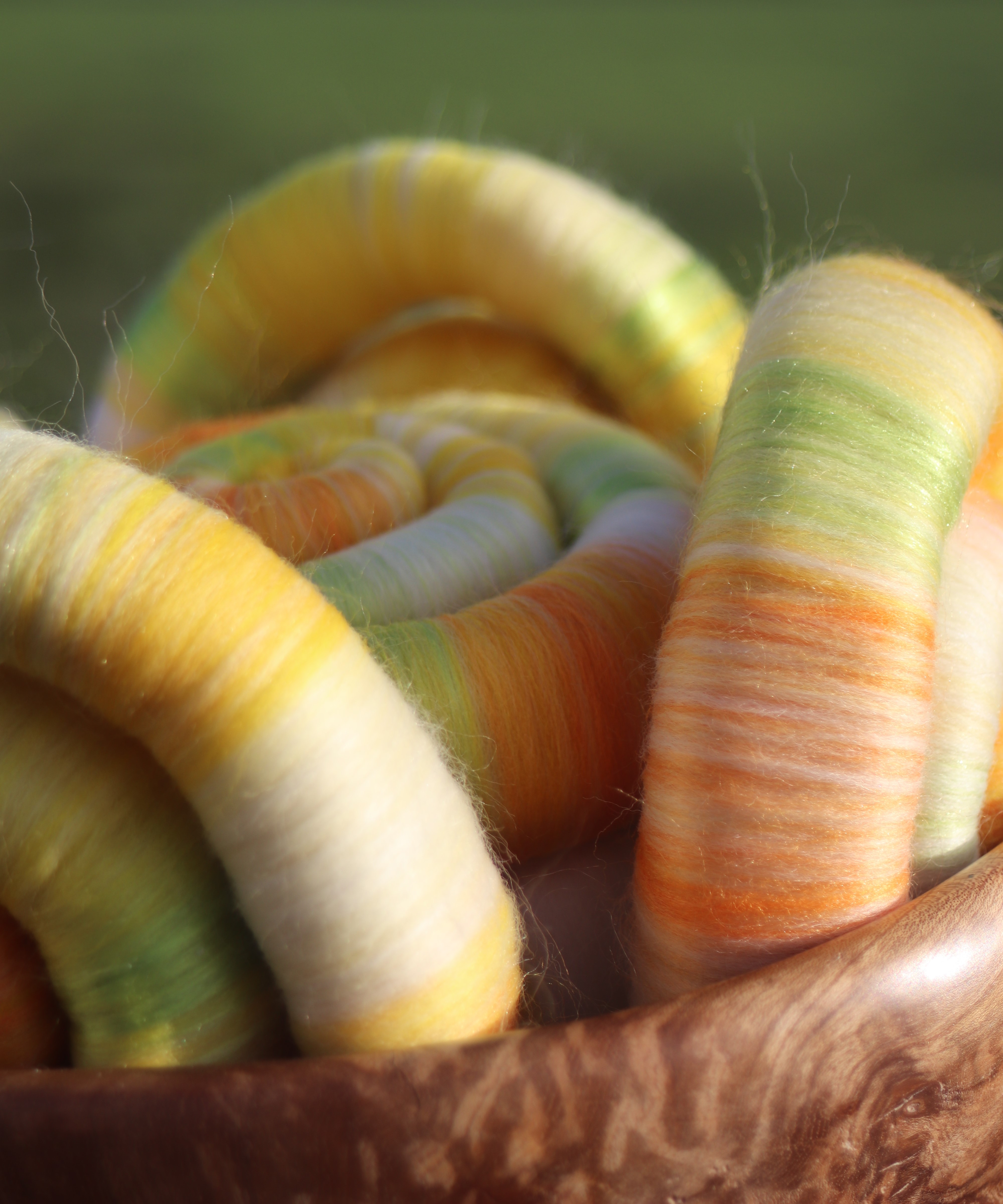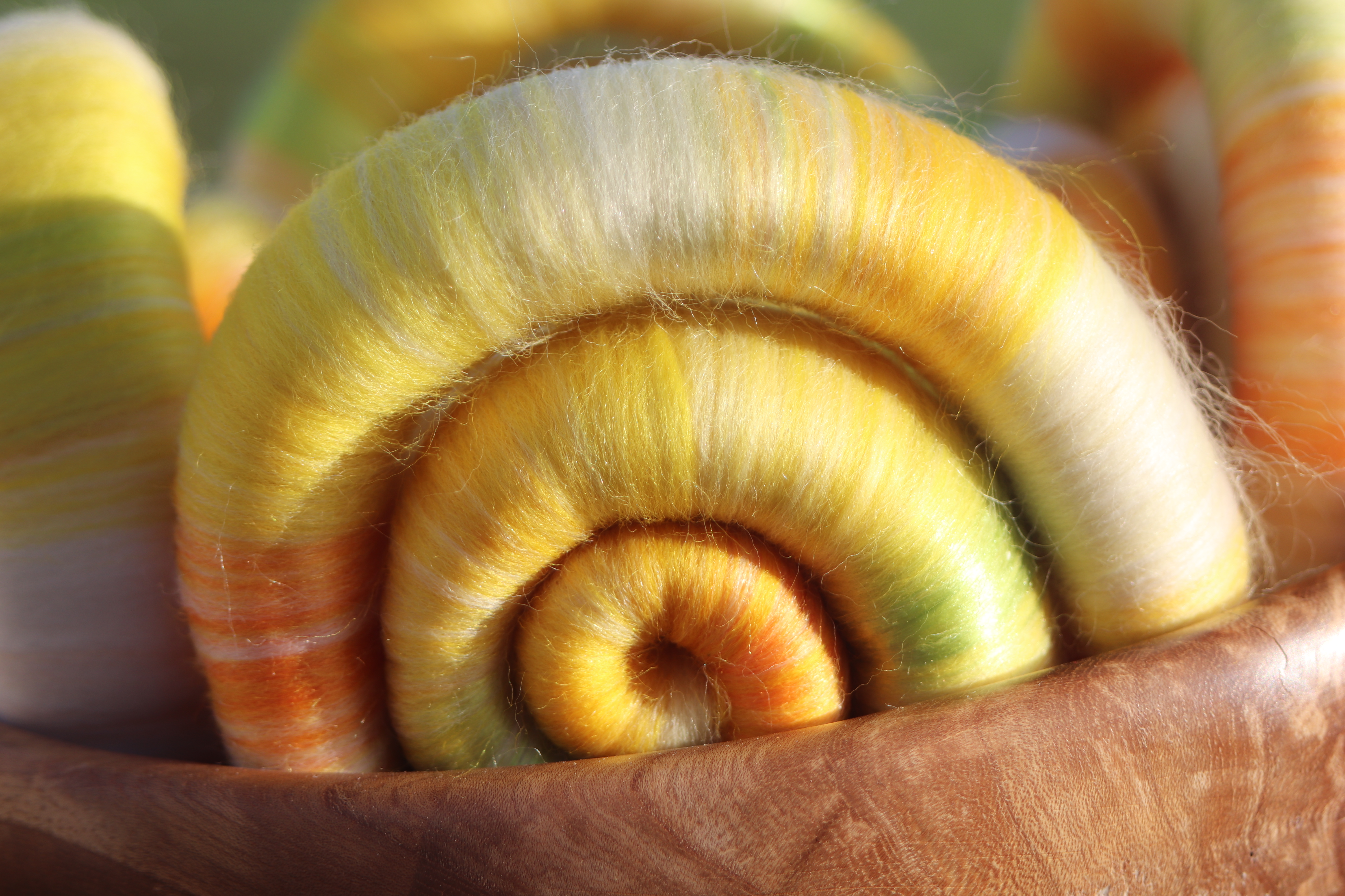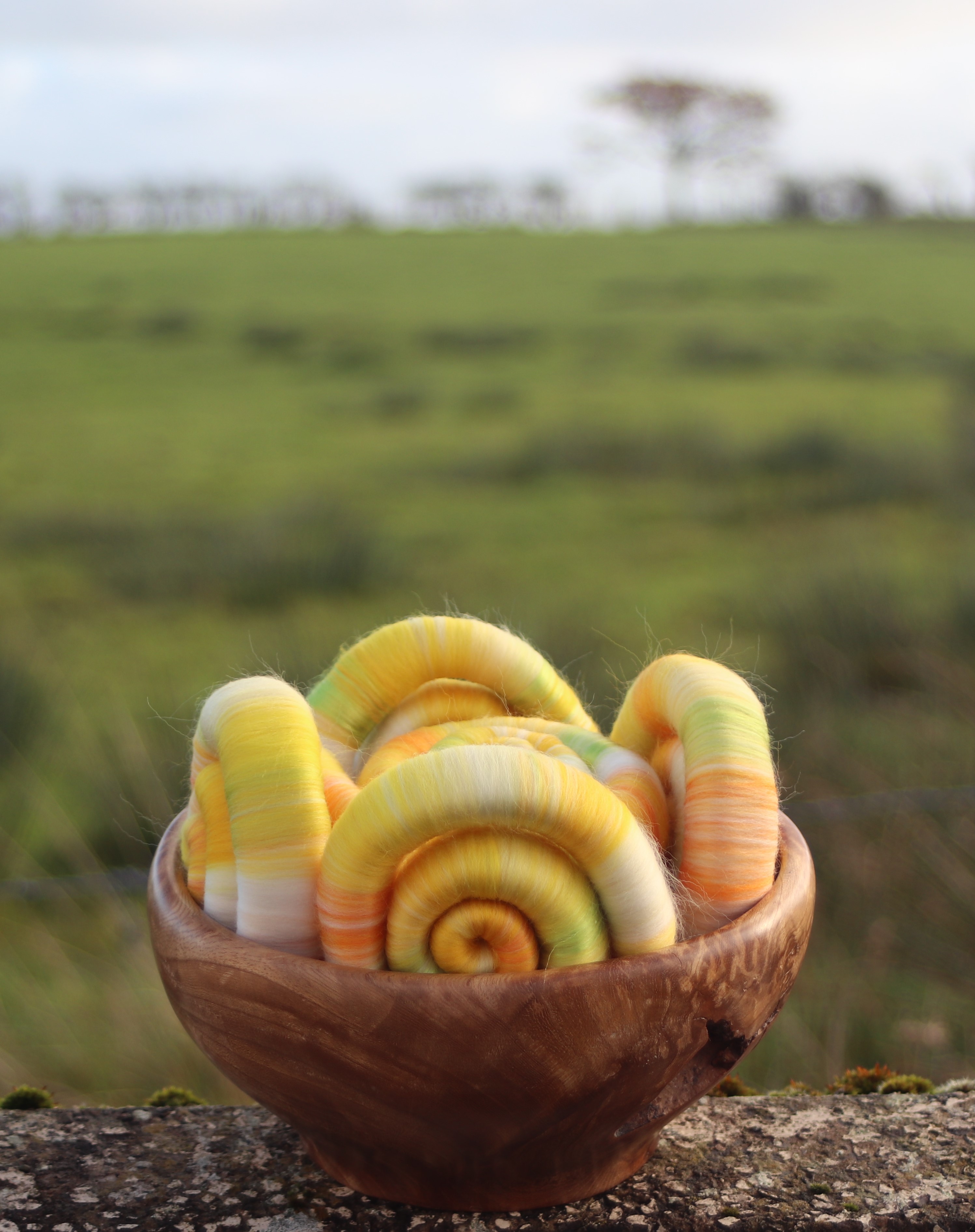 I have taken the bright, bold colours of the Narcissus in wonderfully soft 21 micron merino, then blended them with a blend of superfine merino and cashmere, topping the whole blend off with mulberry silk. The yarn made from this fibre will be luciously soft, warm, and will still drape and shimmer due to the addition of silk.