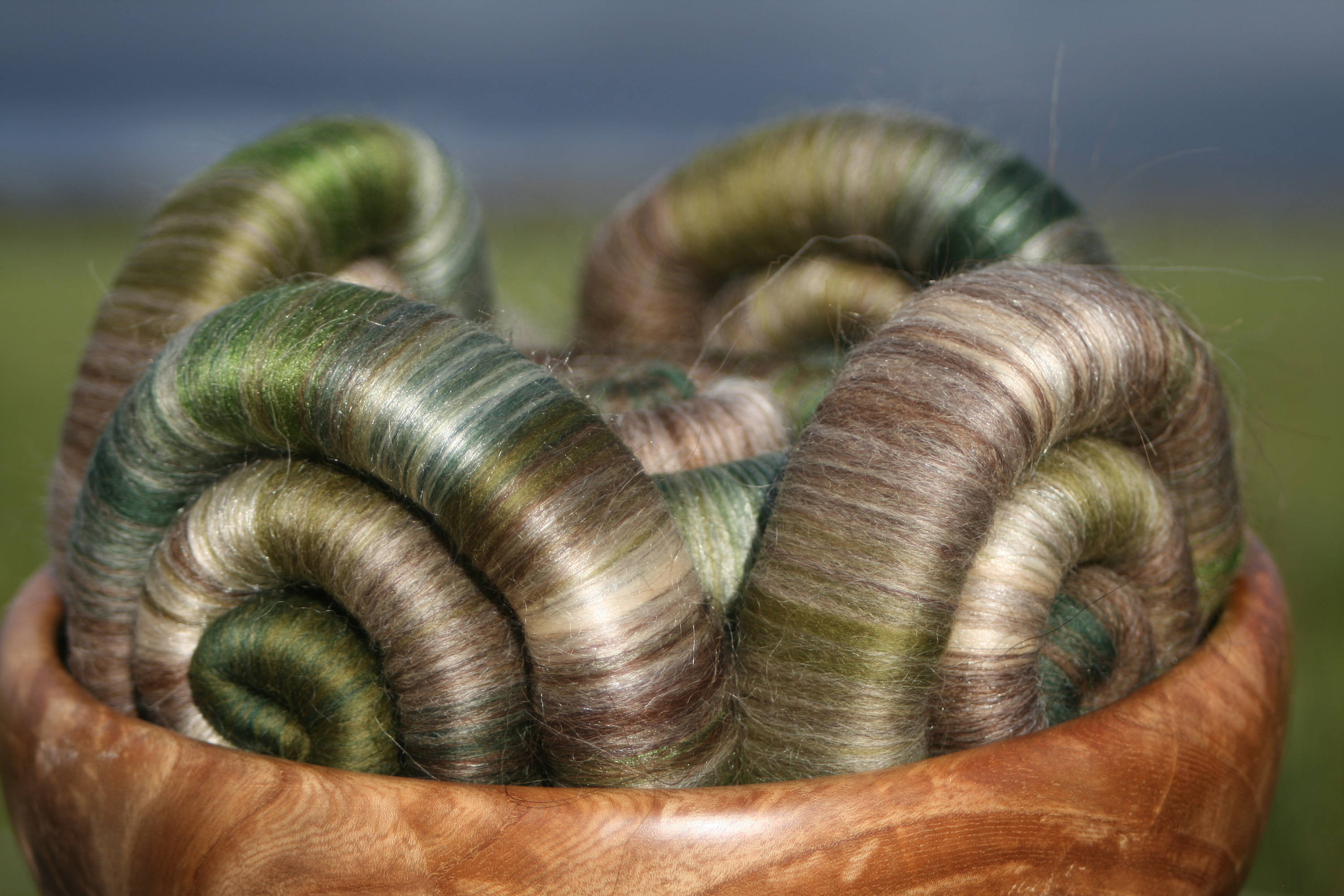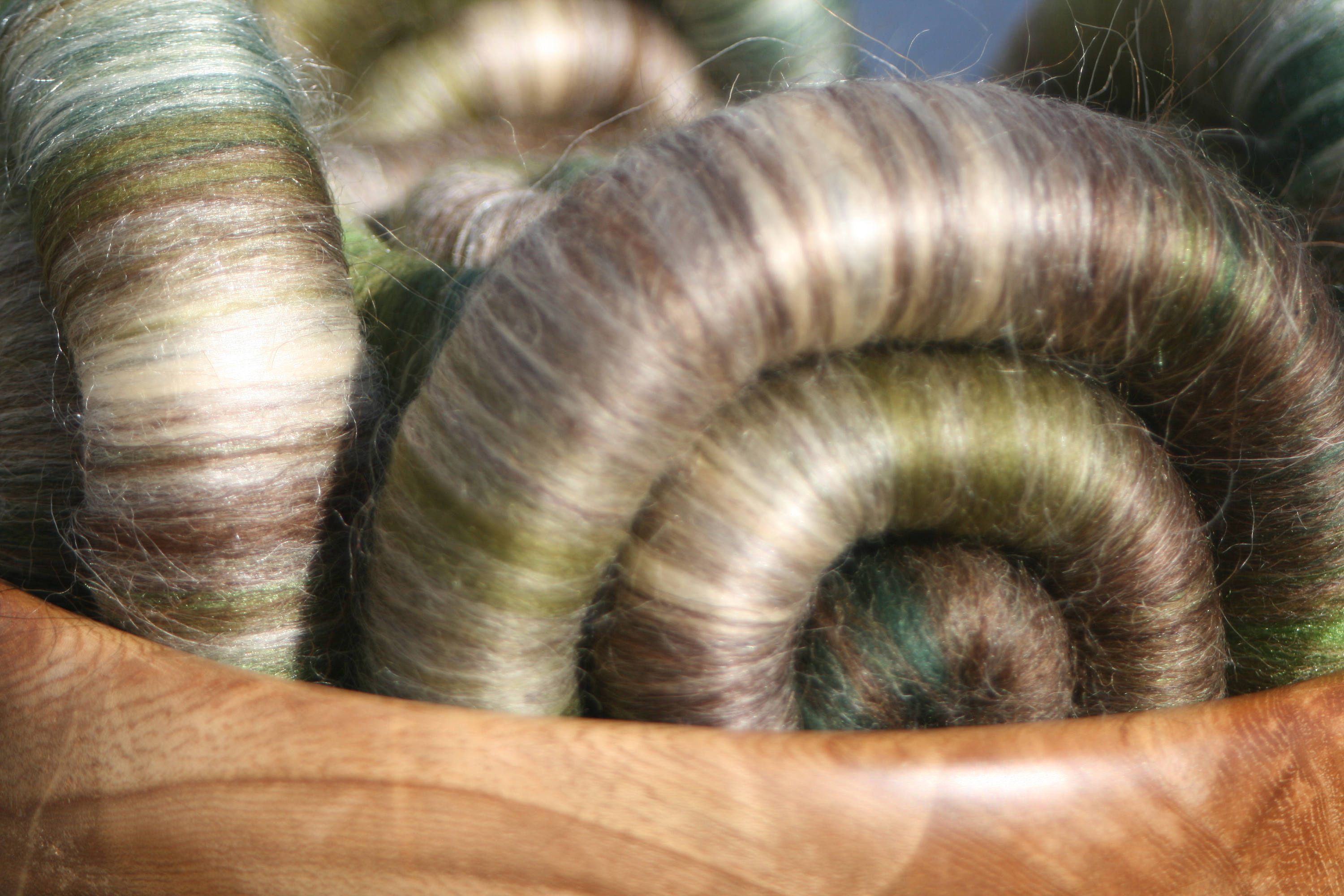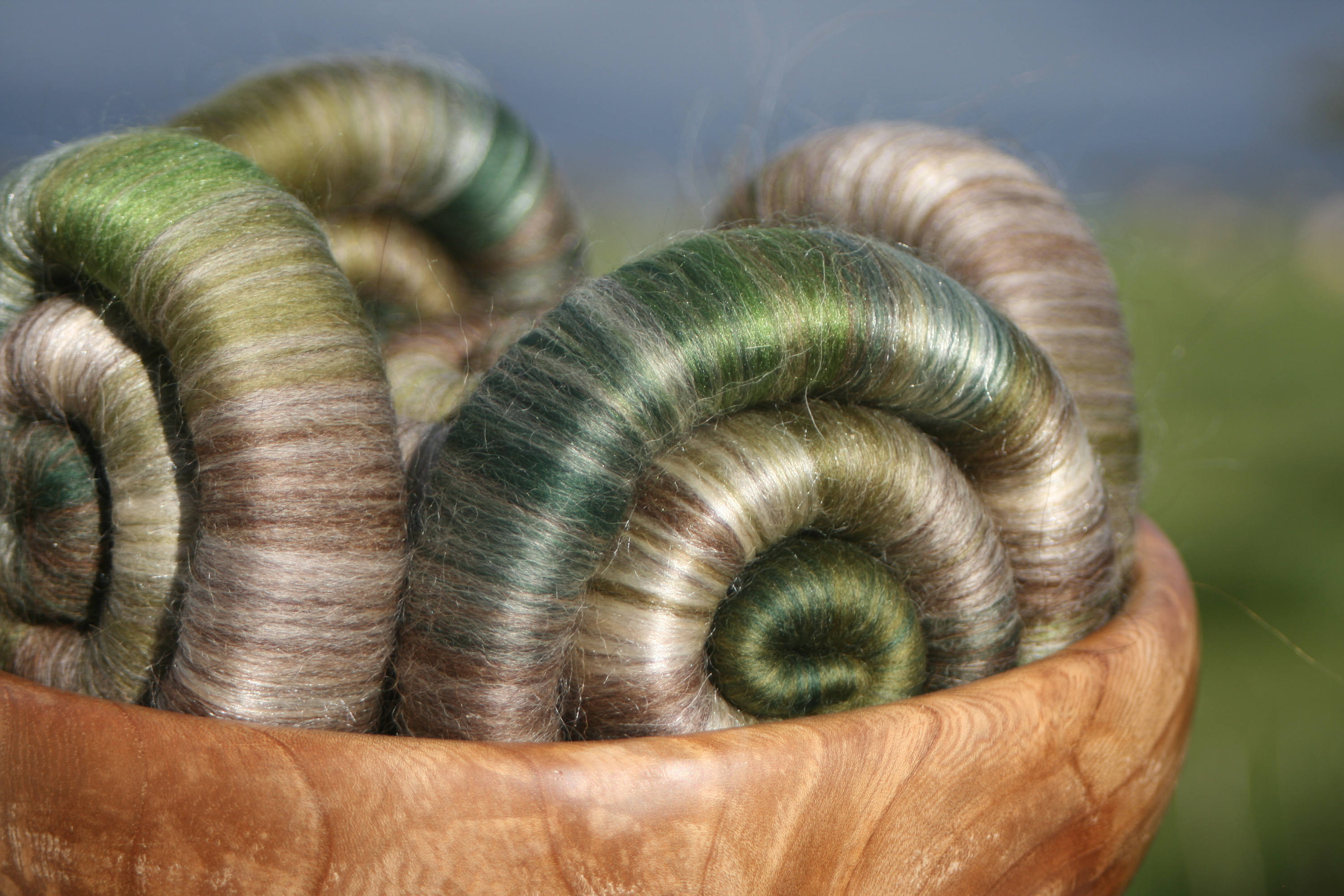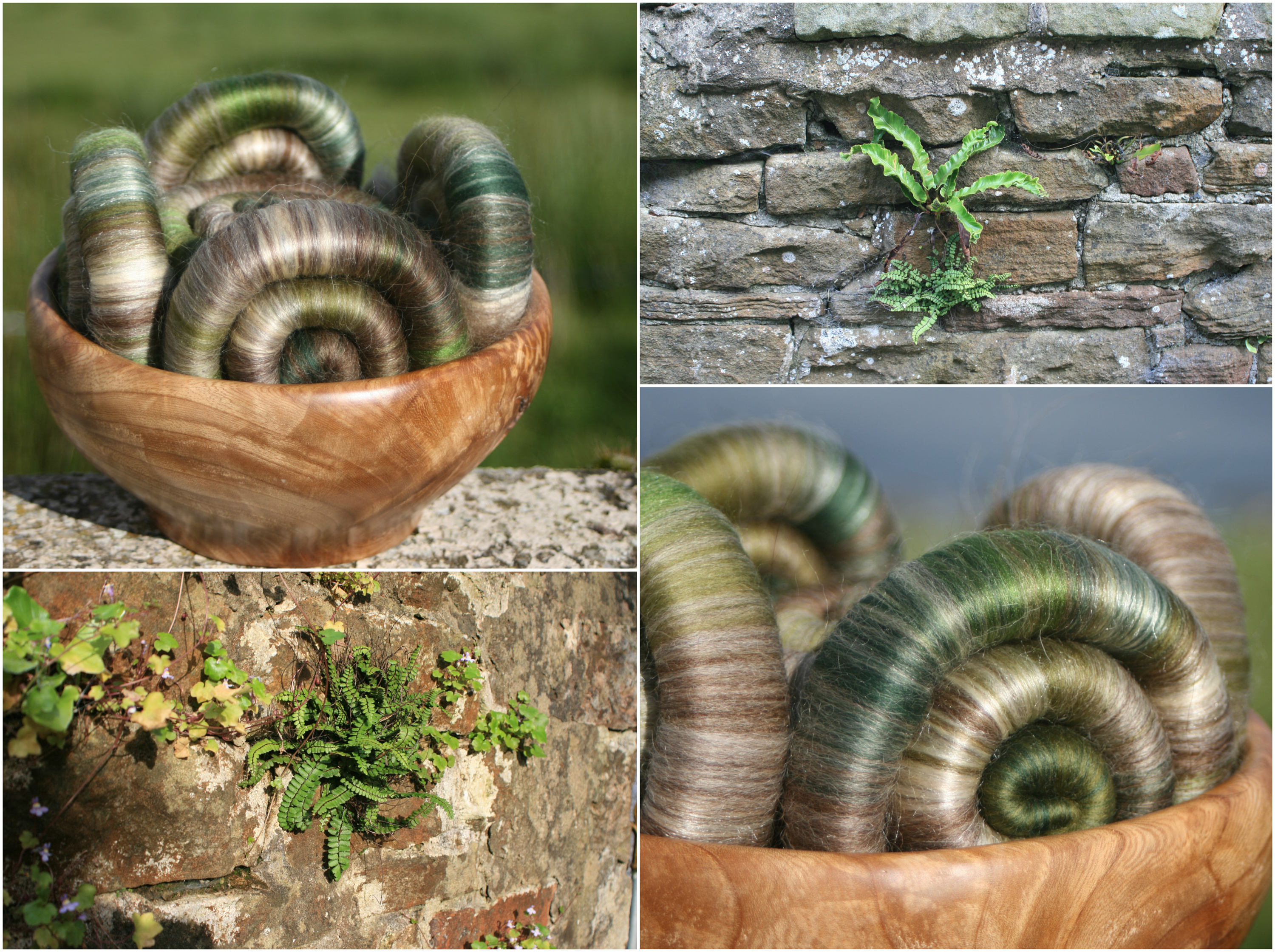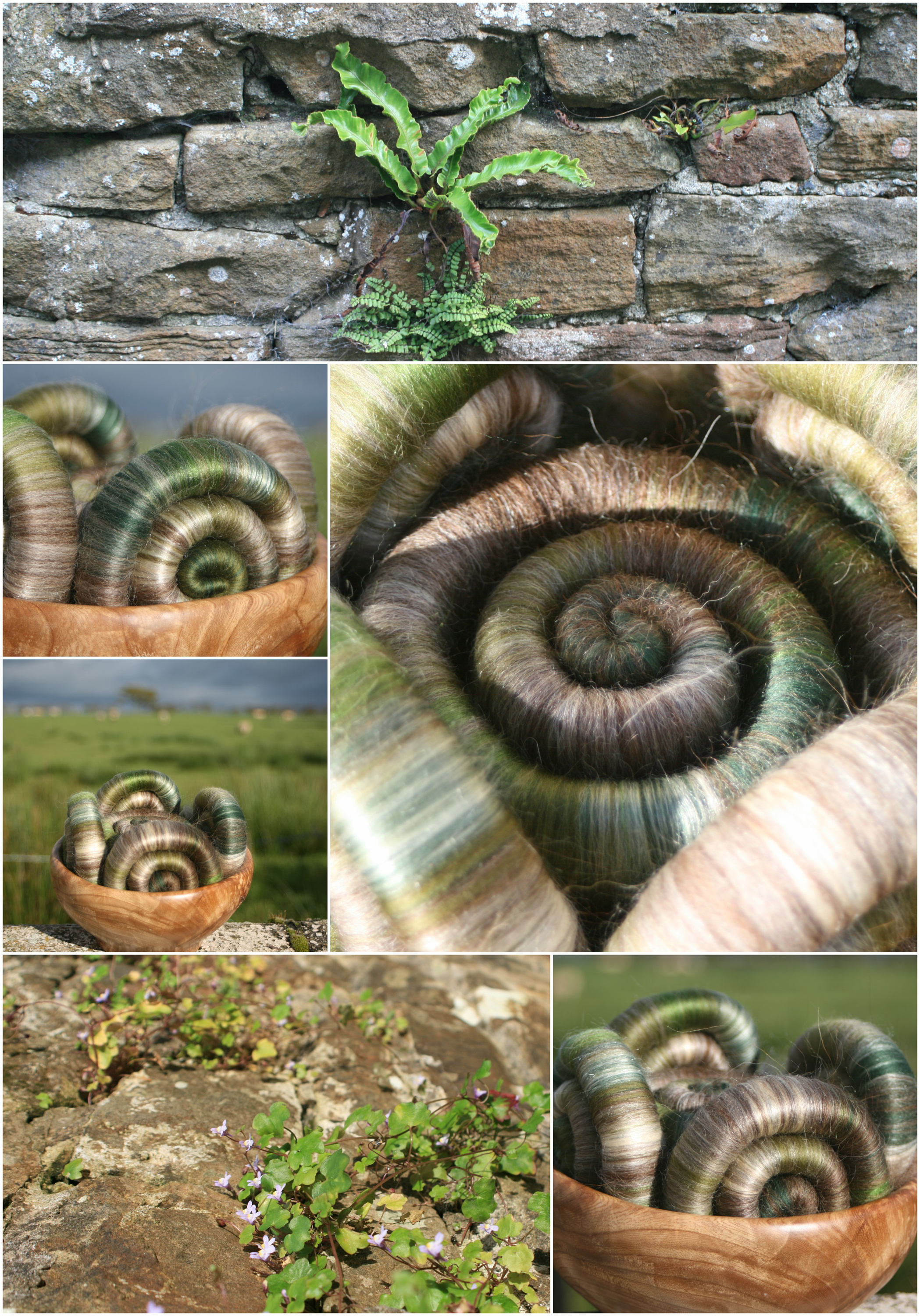 These punis/ rolags reflect the shades of different colours and textures within this venerable wall. I have tried to match the soft brown and grey tones using natural undyed fibres, augmented with merino in shades of green, unbleached tussah silk, and green tussah silk.