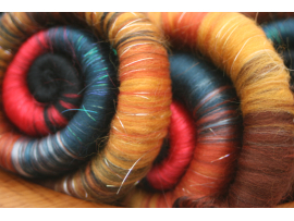 These punis/ rolags reflect the shades of different colours and textures within this venerable wall. I have tried to match the soft brown and grey tones using natural undyed fibres, augmented with merino in shades of green, unbleached tussah silk, and green tussah silk.