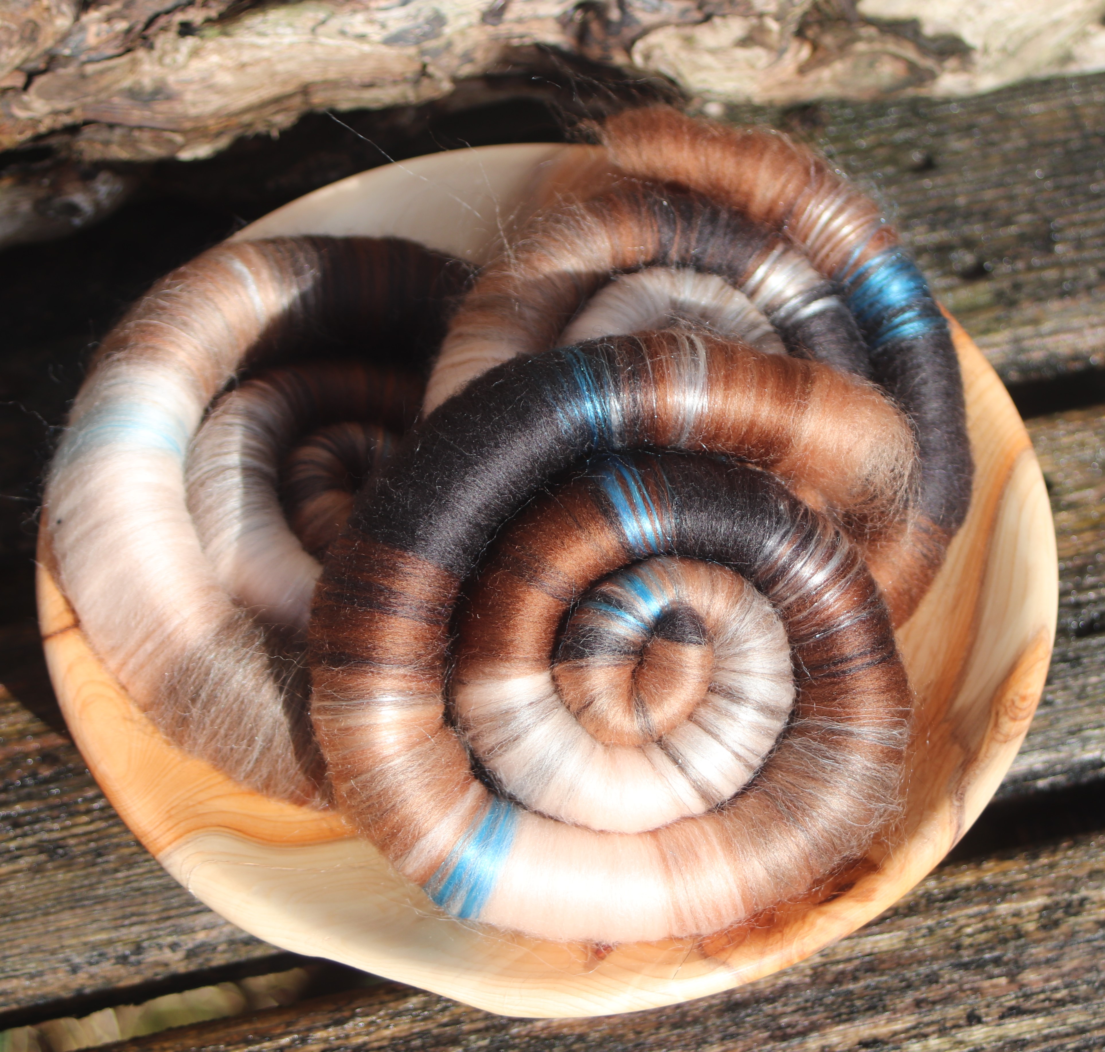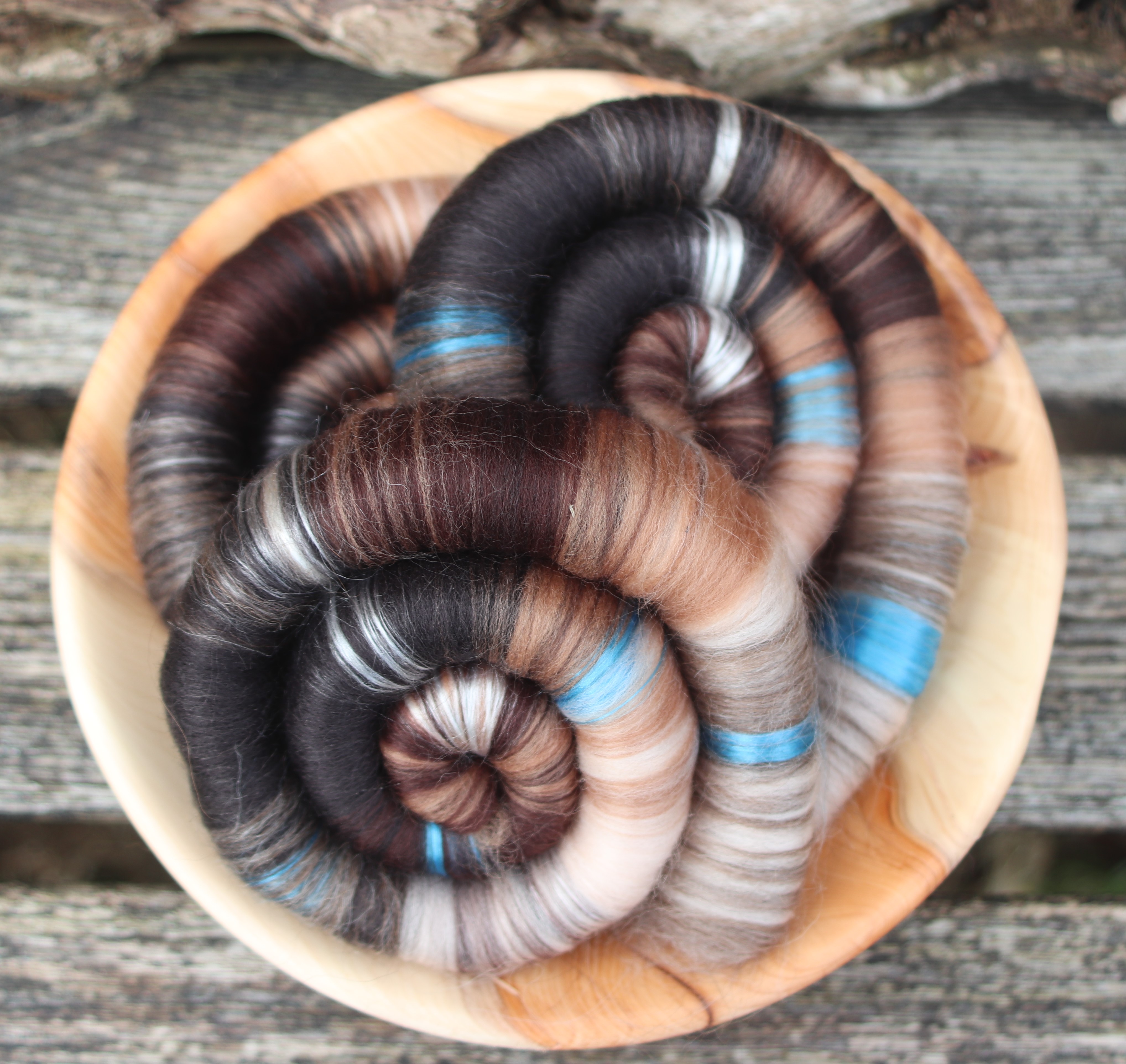 The rolags are made from a blend of merino (21 microns) and superfine merino (18.5 microns) in shades of brown, beige and cream. Added to this is naturally brown baby llama to give a bit more fluffiness to the yarn, and thin streaks of mulberry silk in white and blue.