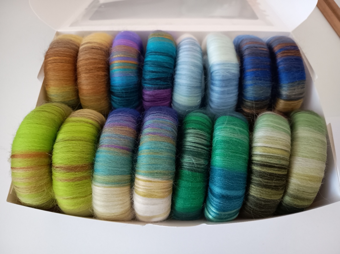This listing is for a box of rolags - all in pairs. The box contains two rolags each of the following colourways