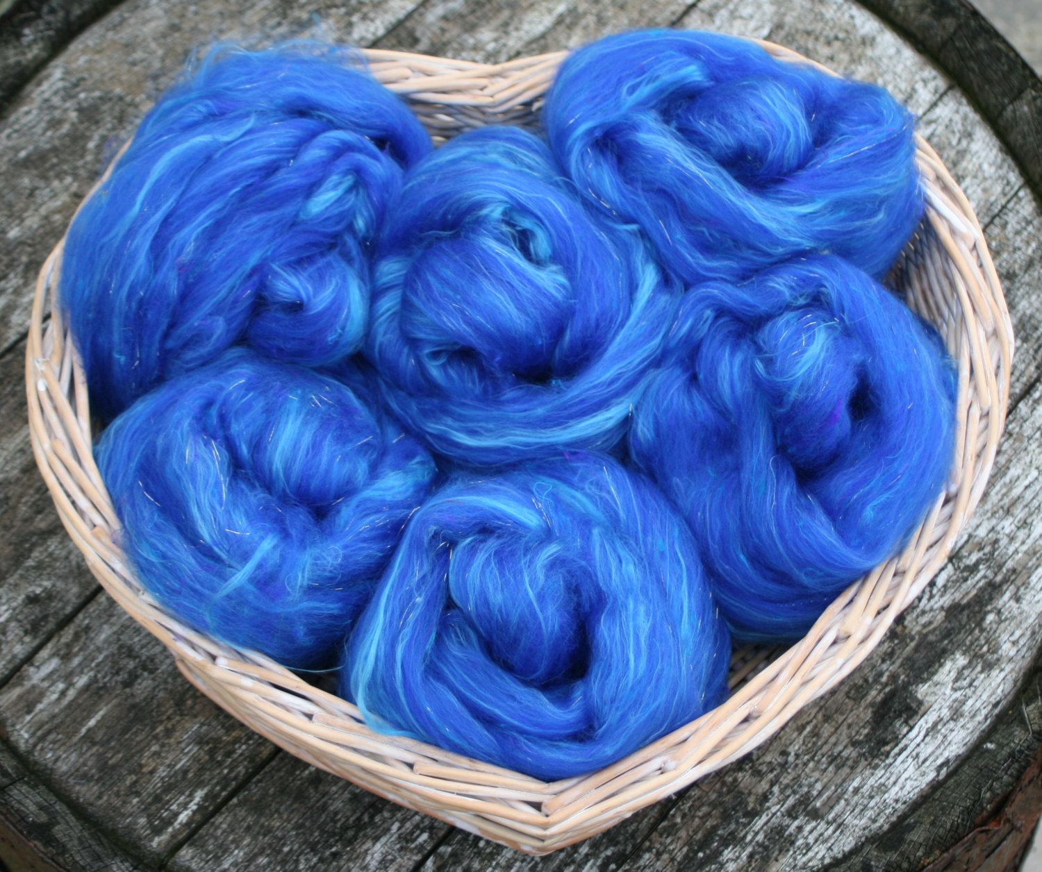 This hand blended, hand pulled roving is made from 21 micron merino fibres, blended with mulberry silk (approximately 15%) and recycled sari silk (approximately 10%), all in shades of blue, although the sari silk has highlights of tiny turquoise, purple, and pink threads throughout.