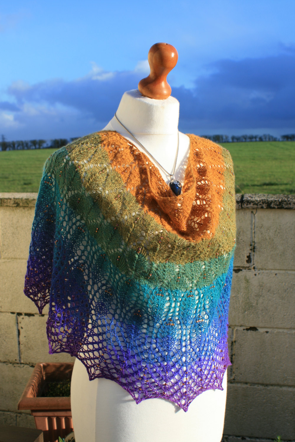 The handspun yarn and the beaded shawl were produced from this blend of fibres, and photgraphs are included to show the progression of colours more clearly.