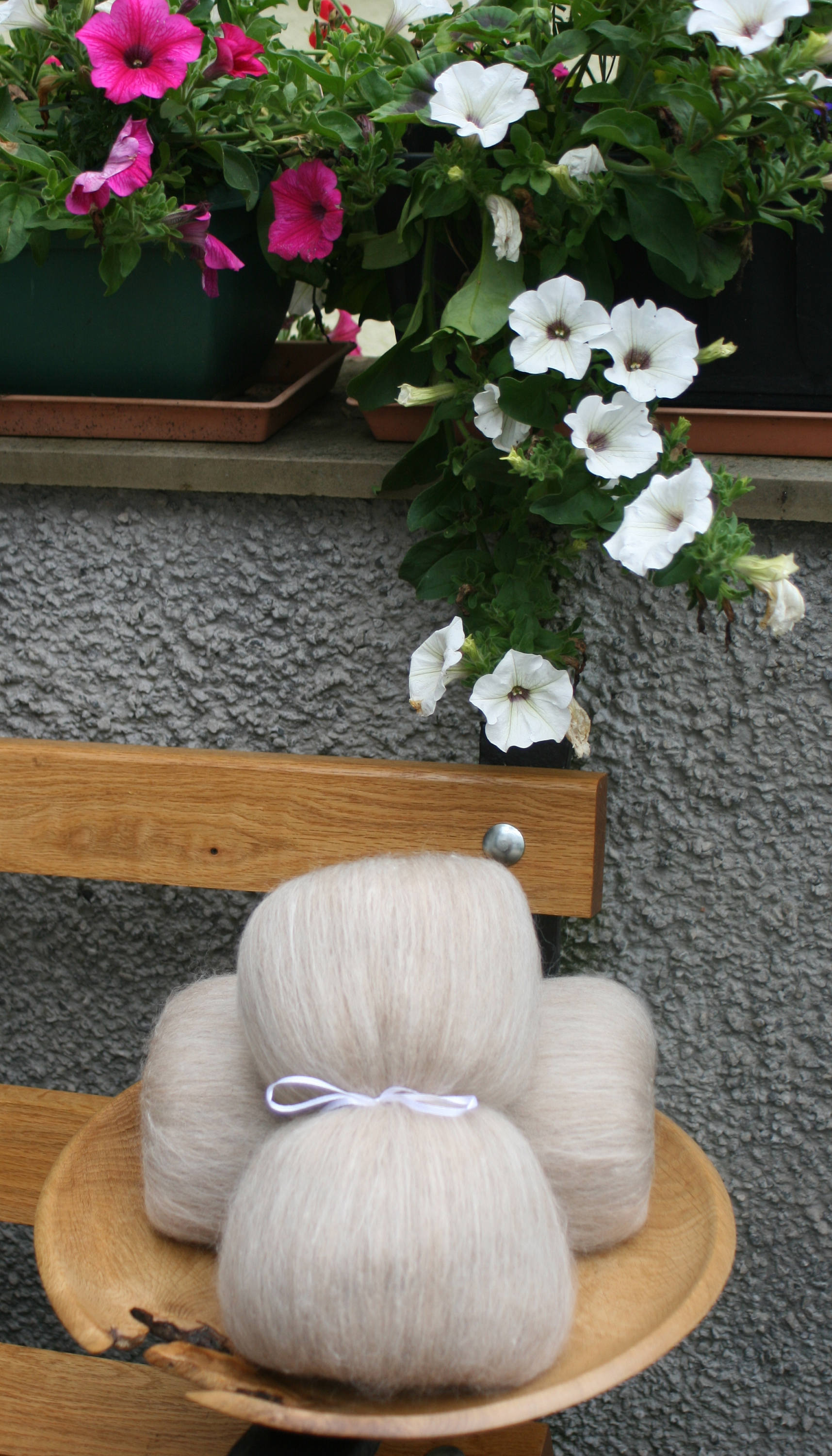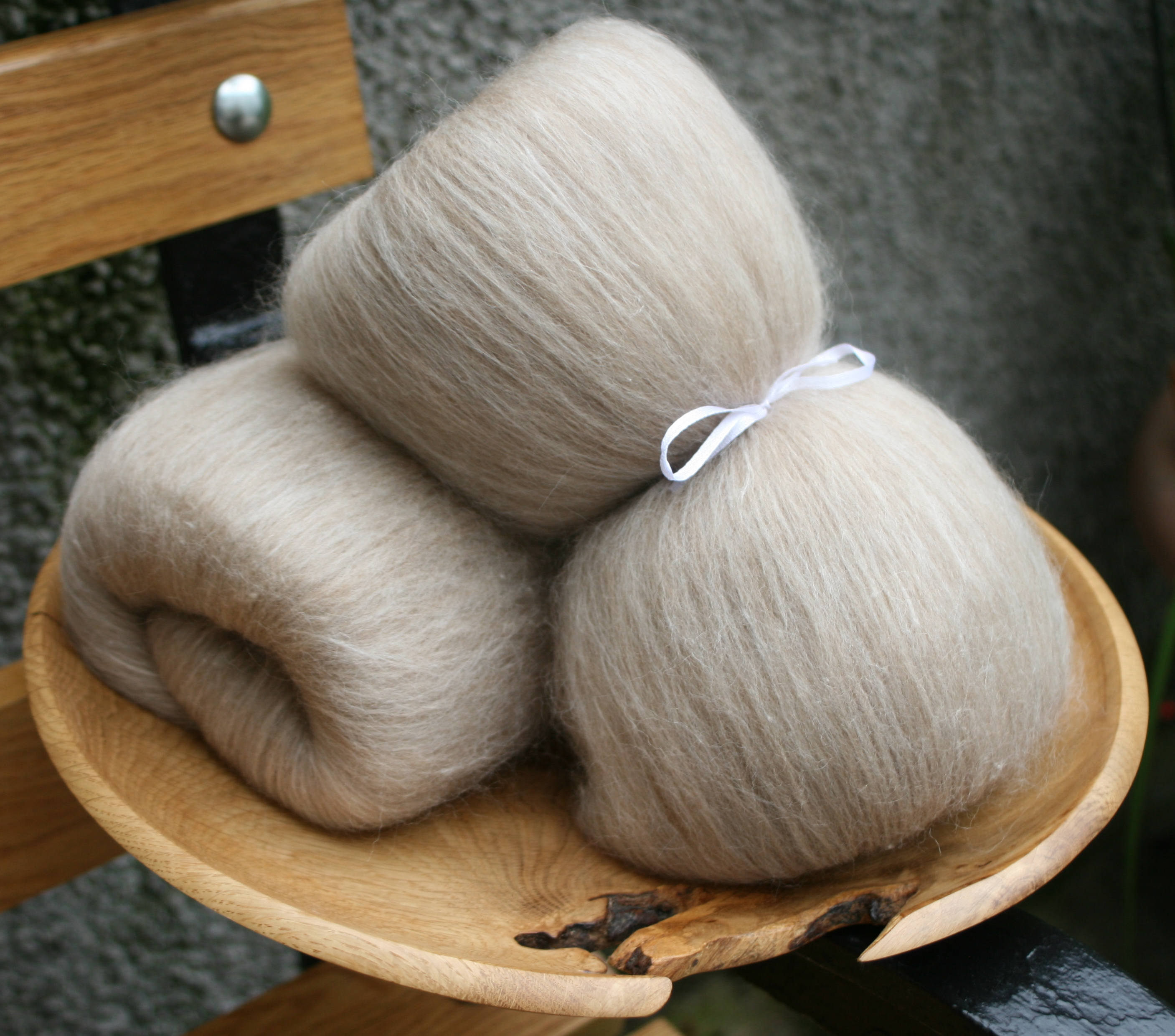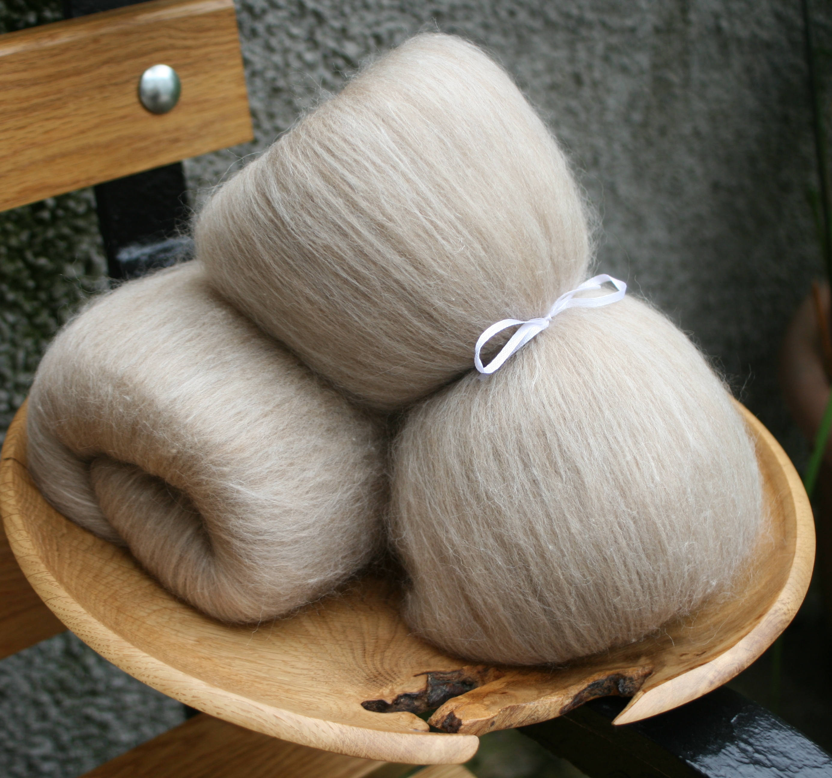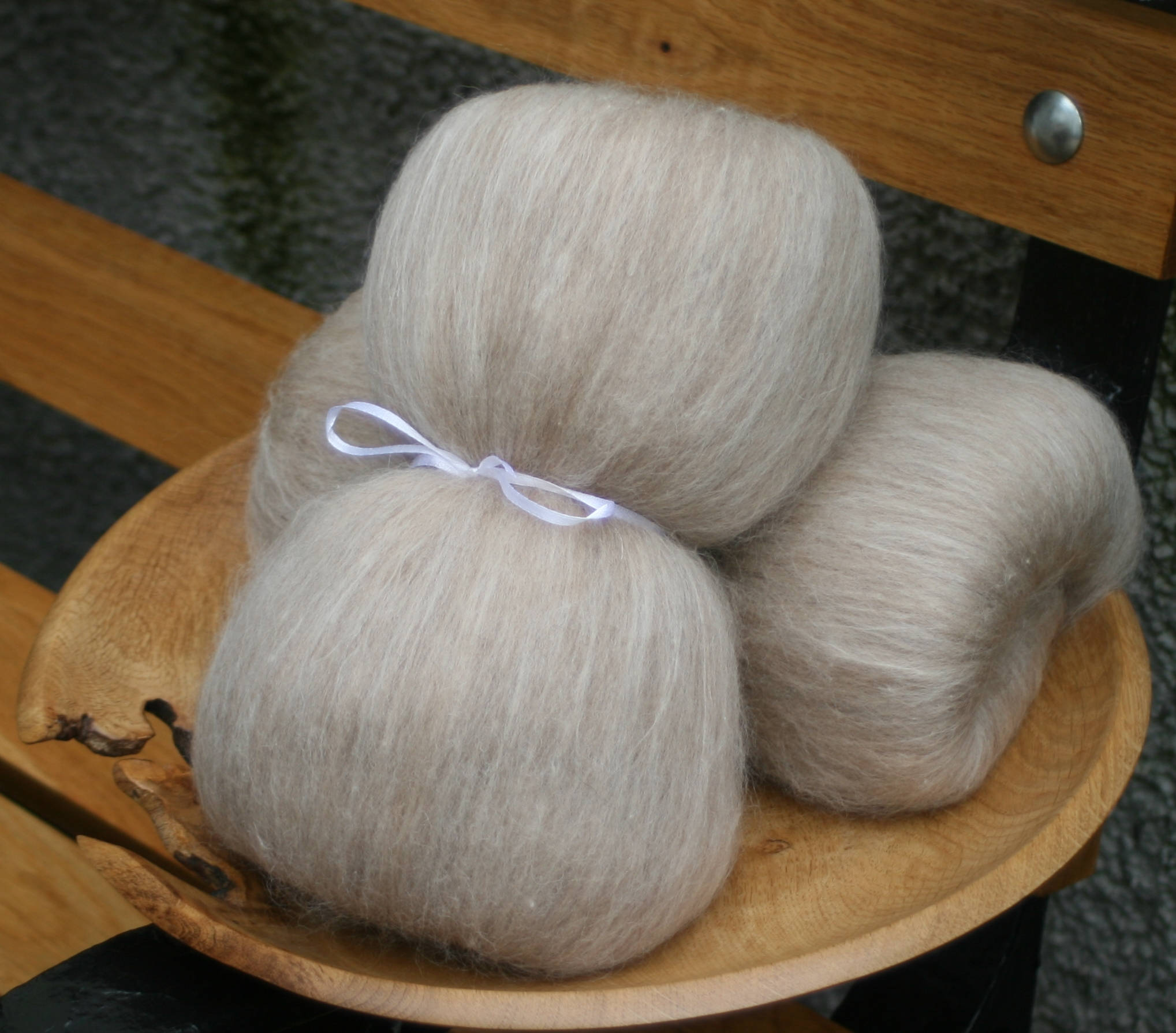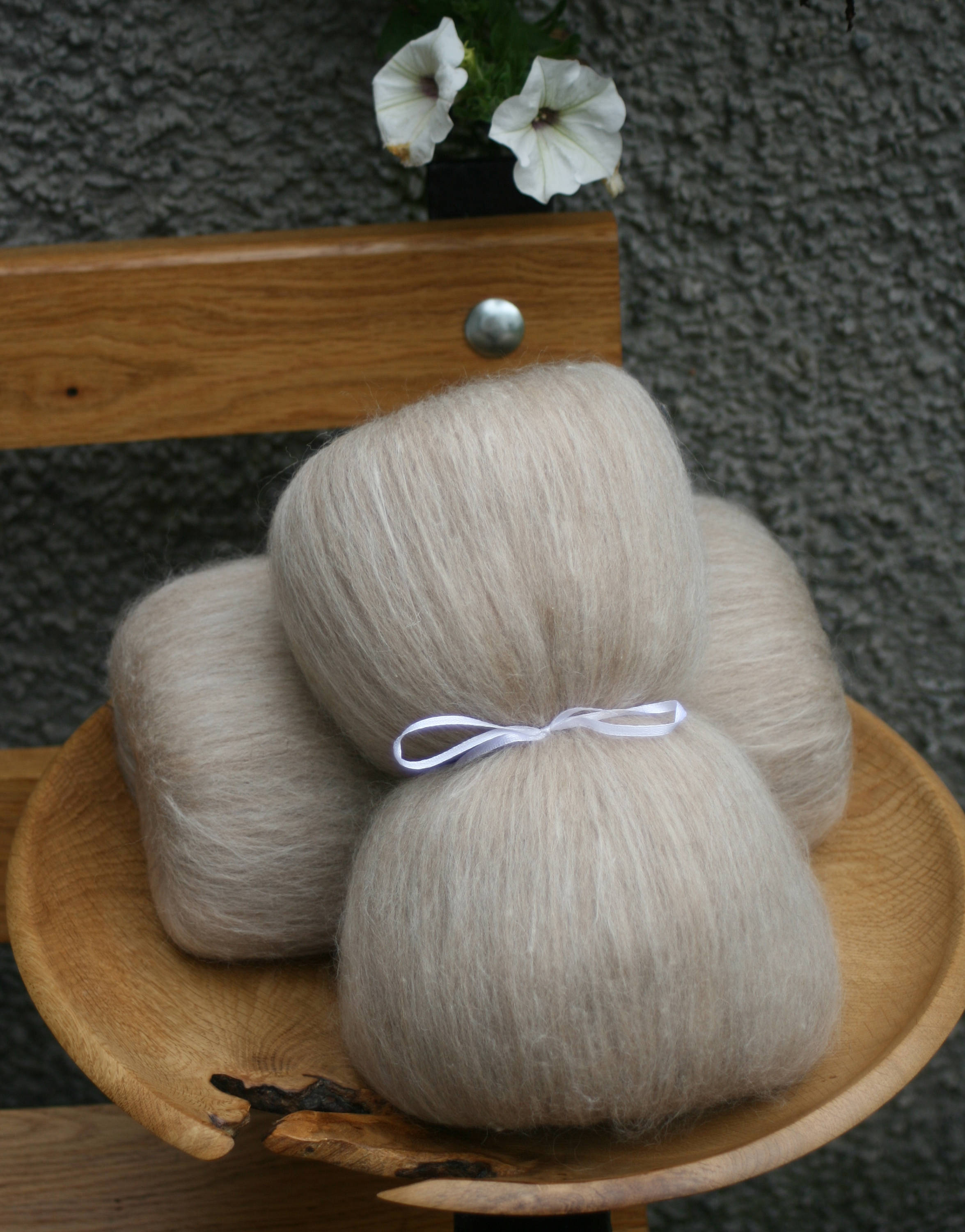 I took some gorgeous soft fawn Shetland fibre, that is sourced from the Shetland Islands, and carefully blended it with soft baby alpaca and mint fibre. I passed the fibres through the drum carded three times to ensure even blending. These are smooth batts from which any weight of yarn could be produced.