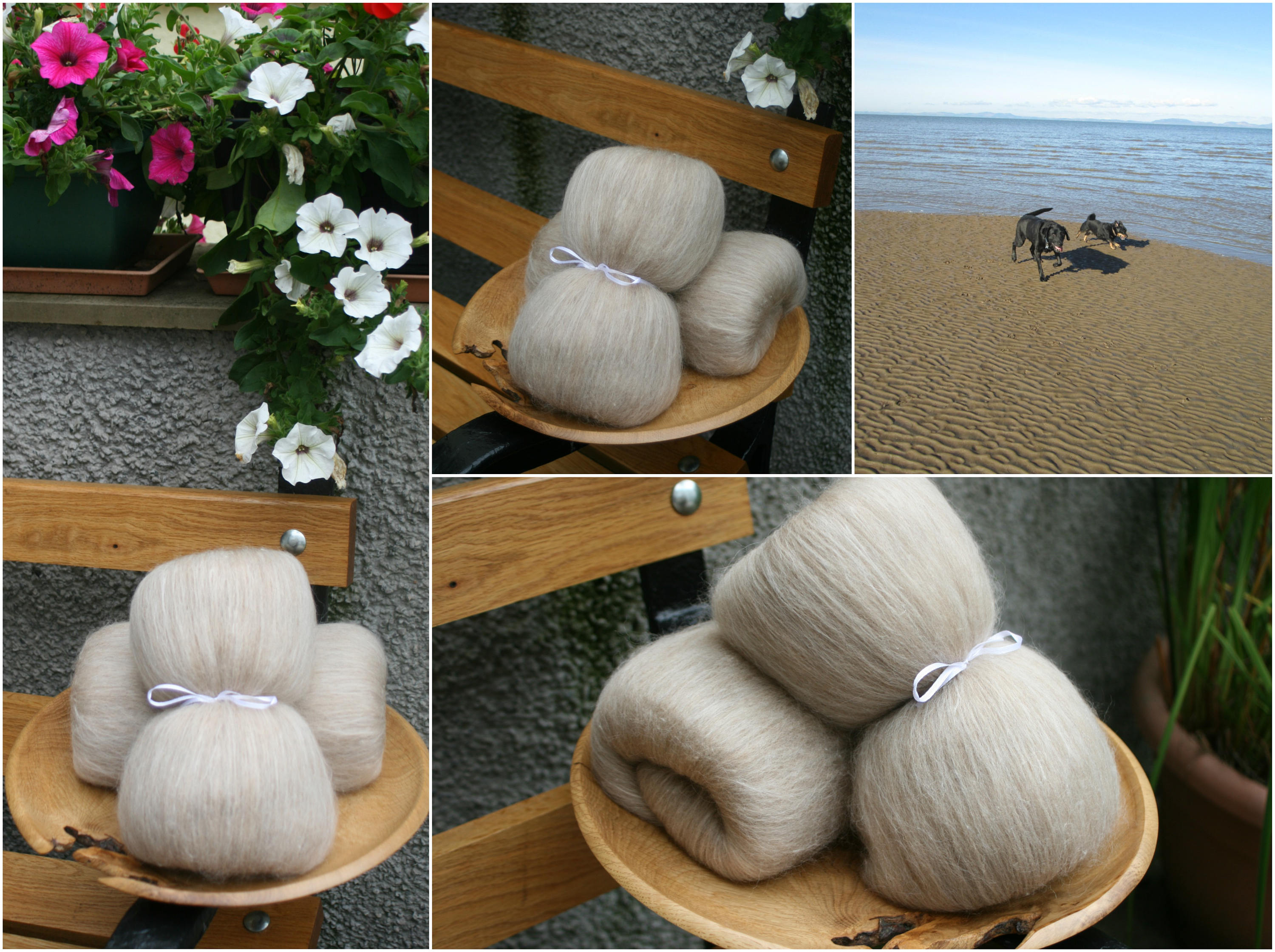 You will receive 100g (2 batts) of fibre in the Sand Castle colourway. The Shetland fibres and Baby alpaca fibres will felt, if you do not want them to, hand wash in cool water.