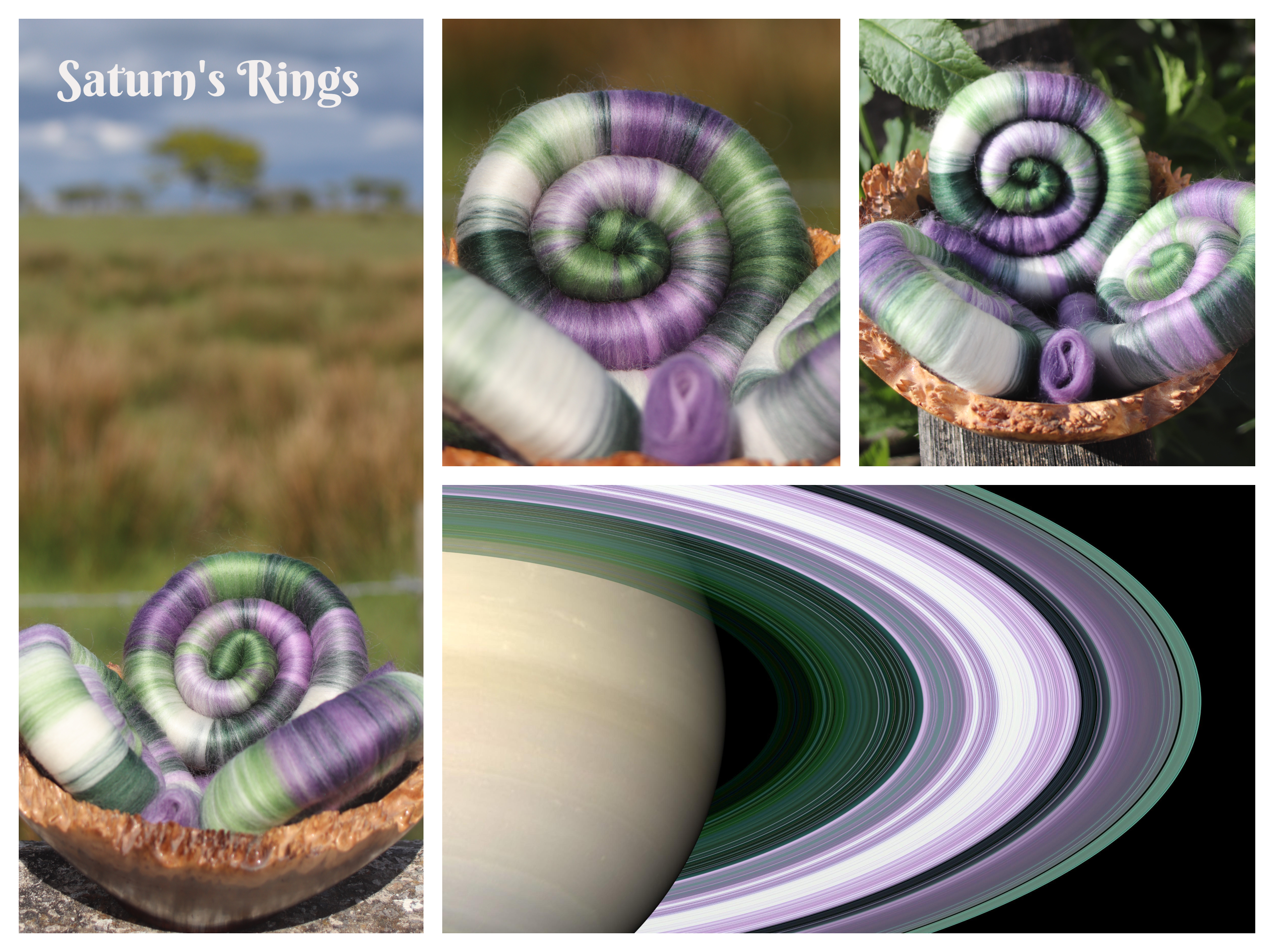 These rolags are another colourway that was designed for the Solar System Sampler box. These rolags are based on an image of the Rings of Saturn taken by the Cassini spacecraft. The colours used indicate the size of the particles within the rings, not the actual colour of the rings themselves.