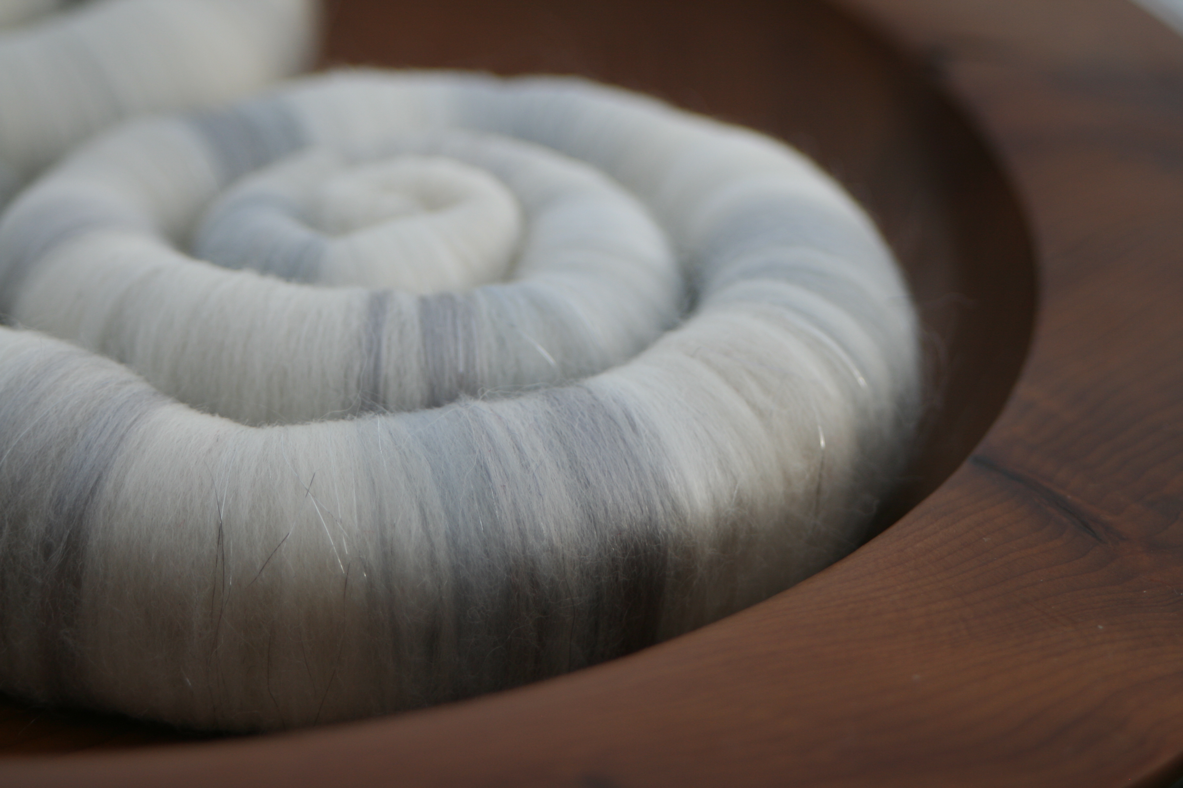 The rolags are made of a base of lovely soft white 21 micron merino fibres, with touches of pale grey added. To this I have added some special silver mulberry silk, that has been sitting waiting for JUST the right project. For some shimmer to add to the snow, I have finally added some silky rose fibre and just a sprinkling of silver Angelina.