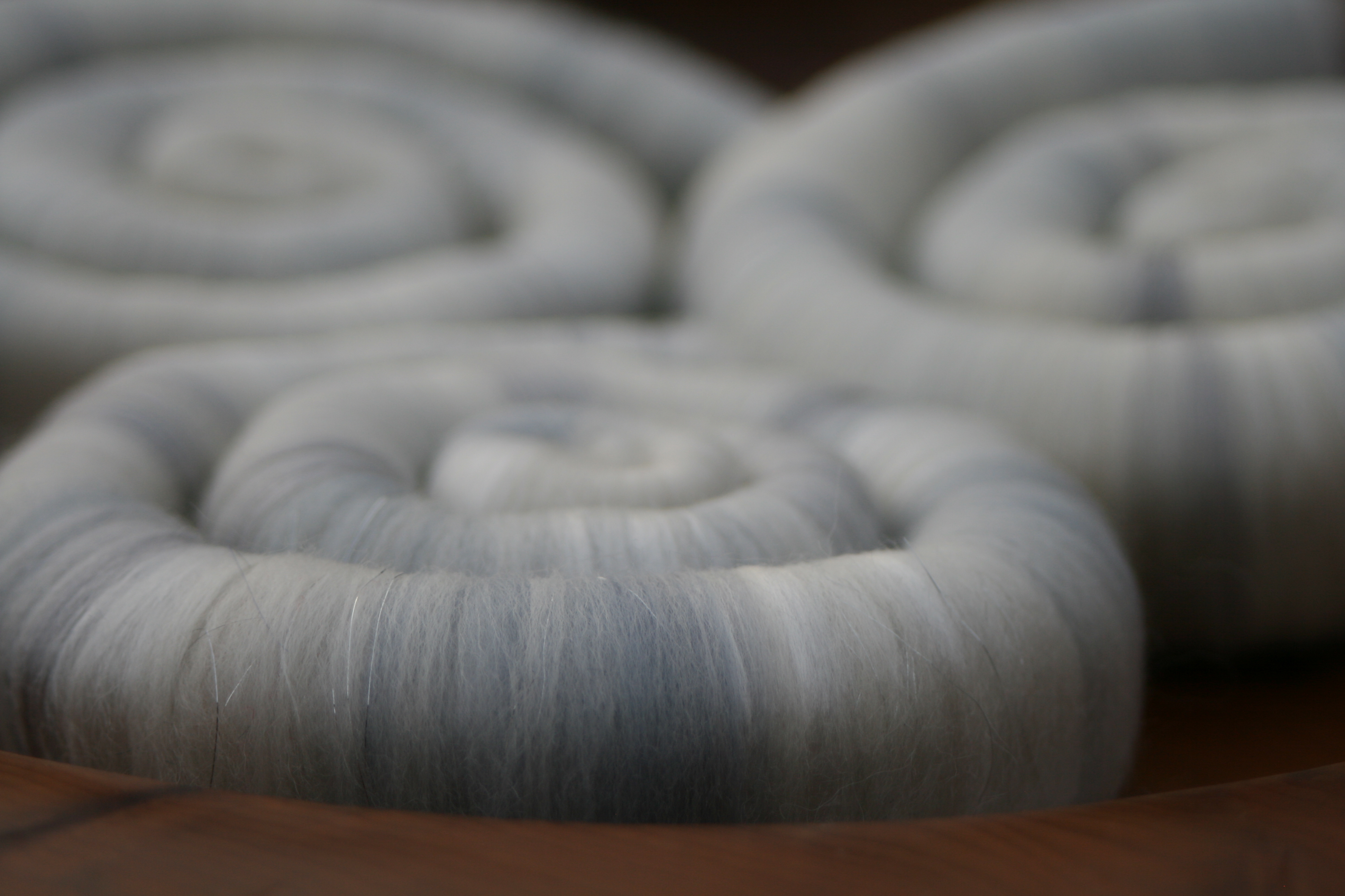 These delicately coloured rolags / punis represent the gentle colour variations that I have seen (when I can see it!) of the snow on Skiddaw.